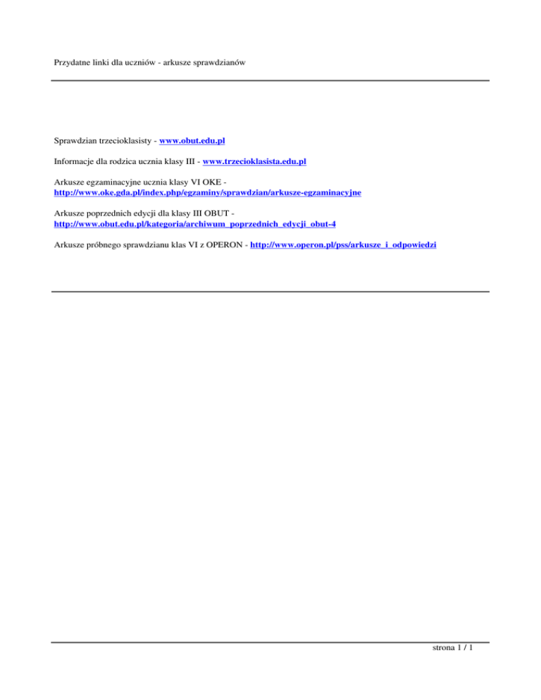 Przydatne linki dla uczniów - arkusze sprawdzianów Sprawdzian trzecioklasisty - www.obut.edu.pl Informacje dla rodzica ucznia klasy III - www.trzecioklasista.edu.pl Arkusze egzaminacyjne ucznia klasy VI OKE http://www.oke.gda.pl/index.php/egzaminy/sprawdzian/arkusze-egzaminacyjne Arkusze poprzednich edycji dla klasy III OBUT http://www.obut.edu.pl/kategoria/archiwum_poprzednich_edycji_obut-4 Arkusze próbnego sprawdzianu klas VI z OPERON - http://www.operon.pl/pss/arkusze_i_odpowiedzi strona 1 / 1