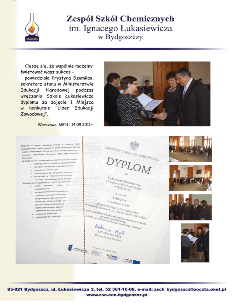 Cieszę się, że wspólnie możemy świętować wasz sukces powiedziała Krystyna Szumilas, sekretarz stanu w Ministerstwie Edukacji Narodowej podczas wręczania Szkole Łukasiewicza dyplomu za zajęcie 1 Miejsca w konkursie "Lider Edukacji Zawodowej". Warszawa, MEN ; 14.09.2011r.