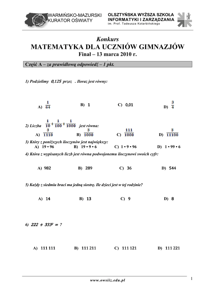 OLSZTYŃSKA WYŻSZA SZKOŁA INFORMATYKI I ZARZĄDZANIA WARMIŃSKO-MAZURSKI KURATOR OŚWIATY i m. P r of. T ad eus z a K ota r bi ńs k i eg o Konkurs MATEMATYKA DLA UCZNIÓW GIMNAZJÓW Finał – 13 marca 2010 r. . Część A – za prawidłową odpowiedź – 1 pkt. 1) Podzielimy 0,125 przez . Iloraz jest równy: A) 2) Liczba A) B) 1 C) 0,01 D) jest równa: B) C) 3) Który z poniższych iloczynów jest największy: A) 19 • 96 B) 19 • 9 • 6 C) 1 • 9 • 96 D) D) 1 • 99 • 6 4) Która z wypisanych liczb jest równa podwojonemu iloczynowi swoich cyfr: A) 982 B) 289 C) 36 D) 544 5) Każdy z siedmiu braci ma jedną siostrę. Ile dzieci jest w tej rodzinie? A) 14 B) 13 C) 9 D) 8 B) 111 211 C) 111 121 D) 111 221 6) 222 + 3332 = ? A) 111 111 www.owsiiz.edu.pl 1 WARMIŃSKO-MAZURSKI KURATOR OŚWIATY OLSZTYŃSKA WYŻSZA SZKOŁA INFORMATYKI I ZARZĄDZANIA i m. P r of. T ad eus z a K ota r bi ńs k i eg o 7) 333 • 334 = ? A) 112 222 B) 123 322 C) 123 222 D) 111 222 B) 0,000027 C) 0,0000027 D) 0,0027 C) 811 D) 168 8) (0,03)3 = ? A) 0,00027 9) Która z poniższych liczb jest największa ? A) 232 B) 415 10) Suma trzech kolejnych liczb nieparzystych jest równa 39. Która jest najmniejszą z nich? A) 15 B) 9 C) 13 D) 11 C) 4 D) 2 Część B – za prawidłową odpowiedź – 2 pkt. 11) 1285 : 416 = ? A) 16 B) 8 12) Cyfrą jedności liczby 102009 + 52010 + 92011 jest: www.owsiiz.edu.pl 2 WARMIŃSKO-MAZURSKI KURATOR OŚWIATY A) 4 OLSZTYŃSKA WYŻSZA SZKOŁA INFORMATYKI I ZARZĄDZANIA i m. P r of. T ad eus z a K ota r bi ńs k i eg o B) 9 C) 6 D) 3 13) Pole rombu o przekątnych długości 30 i 44 jest równe: A) 600 B) 1320 C) 320 D) 660 C) 64 D) 52 14) 99 99--97 + 9595-93 + 9191-89 + … + 33-1 = ? A) 48 B) 50 15) Która z podanych równości jest fałszywa? A) B) = C) = D) + =2 16) Wskazówka minutowa zegara ściennego ma 12 cm długości. Jaką drogę przebędzie koniec tej wskazówki w ciągu 5 minut? www.owsiiz.edu.pl 3 WARMIŃSKO-MAZURSKI KURATOR OŚWIATY A) 3π cm B) 4π cm OLSZTYŃSKA WYŻSZA SZKOŁA INFORMATYKI I ZARZĄDZANIA i m. P r of. T ad eus z a K ota r bi ńs k i eg o C) 3 cm D) 2π cm 17) Po obniżce o 30% książka kosztuje 42 zł. Jaka była pierwotna cena tej książki? A) 45 zł B) 70 zł C) 80 zł D) 60 zł 18) Ile wynosi x spełniający równanie: A) 0 B) C) D) 19) Franek urodził się 13 marca 2008 roku. W jakim dniu tygodnia się urodził? A) poniedziałek B) wtorek C) środa D) czwartek C) x2 < 4 D) 0 ≤ x2 ≤ 4 20) Wiadomo, że –2 ≤ x < 1. Zatem: A) x2 < 0 B) 1 < x2 ≤ 4 21) Jaki jest stosunek pola koła opisanego na kwadracie ABCD do pola koła wpisanego w ten kwadrat? www.owsiiz.edu.pl 4 WARMIŃSKO-MAZURSKI KURATOR OŚWIATY A) OLSZTYŃSKA WYŻSZA SZKOŁA INFORMATYKI I ZARZĄDZANIA i m. P r of. T ad eus z a K ota r bi ńs k i eg o B) 4 C) 2 D) 22) Punkt (2, –4) jest środkiem odcinka MN, gdzie M = (–2, 2). Punkt N jest równy: A) (–4, 4, –8) 8) B) (6, –10) 10) C) (0, –3) 3) D) (–3, 3, 0) 23) Książka i zeszyt kosztują łącznie 22 zł. Książka jest o 20 zł droższa od zeszytu. Ile kosztuje 20 zeszytów? A) 40 zł B) 44 zł C) 20 zł D) 22 zł 24) Trzy kury, znoszą regularnie jajka, w ciągu trzech dni zniosły trzy jajka. Ile jajek zniesie w ciągu 12 dni 12 takich kur? A) 144 B) 12 C) 20 D) 48 25) Jaka jest cyfra jedności iloczynu wszystkich liczb pierwszych mniejszych od 2010? A) 8 B) 2 C) 4 D) 0 Część C – za prawidłową odpowiedź – 3 pkt. 26) Ile zer ma na końcu liczba: 1 • 2 • 3 • 4 • 5 • … • 60 • 61 ? www.owsiiz.edu.pl 5 WARMIŃSKO-MAZURSKI KURATOR OŚWIATY OLSZTYŃSKA WYŻSZA SZKOŁA INFORMATYKI I ZARZĄDZANIA i m. P r of. T ad eus z a K ota r bi ńs k i eg o A) 14 B) 13 27) Wiadomo, że A) . Oblicz C) 6 D) 12 . B) C) D) 28) W trójkącie prostokątnym o przyprostokątnych długości 4 m i 3 m odległość wierzchołka kąta prostego od przeciwprostokątnej wynosi: A) 250 cm B) 240 cm C) 242 cm D) 252 cm 29) Punkty A, B, C są kolejnymi wierzchołkami sześciokąta foremnego o boku = 1. Ile wynosi długość odcinka AC ? A) B) D) C) 2 30) Kąt wewnętrzny przy wierzchołku szesnastokąta foremnego wynosi: A) B) C) D) 31) Ile jest dwucyfrowych liczb mniejszych od 100, w których cyfra dziesiątek jest o 5 większa od cyfry jedności ? A) 4 B) 5 C) 6 www.owsiiz.edu.pl D) 7 6 WARMIŃSKO-MAZURSKI KURATOR OŚWIATY OLSZTYŃSKA WYŻSZA SZKOŁA INFORMATYKI I ZARZĄDZANIA i m. P r of. T ad eus z a K ota r bi ńs k i eg o 32) Litera „x” w liczbie 111111x oznacza cyfrę jedności. Jaka to cyfra, jeżeli ta liczba jest jednocześnie podzielna przez 3 i przez 4 ? A) 2 B) 4 C) 6 D) 8 33) Promień okręgu wpisanego w trójkąt prostokątny o przyprostokątnych długości 12 m i 5 m ma długość: A) 190 cm B) 195 cm C) 200 cm D) 205 cm 34) Prosta przechodząca przez punkty A = (1, 5) i B = (7, 23) ma równanie: A) y = 3x + 2 B) y = 6x – 1 C) y = 4x + 1 D) y = 7x – 2 35) Ile jest wszystkich liczb pięciocyfrowych, których suma cyfr jest równa 3 ? A) 11 B) 12 C) 10 www.owsiiz.edu.pl D) 15 7 WARMIŃSKO-MAZURSKI KURATOR OŚWIATY OLSZTYŃSKA WYŻSZA SZKOŁA INFORMATYKI I ZARZĄDZANIA i m. P r of. T ad eus z a K ota r bi ńs k i eg o 36) Franek ma tyle sióstr, ilu braci, natomiast jego siostra Małgosia ma dwa razy mniej sióstr niż braci. Ile dzieci liczy ich rodzina? A) 11 B) 9 C) 7 D) 5 37) Promień okręgu wpisanego w ćwiartkę koła o promieniu 12 wynosi: A) 5 B) C) D) 38) Kasia uzyskała średnią z czterech sprawdzianów równą 12,5. Ile punktów musi ona uzyskać w kolejnym sprawdzianie, aby średnia z pięciu sprawdzianów wynosiła 13? A) 12 B) 13 C) 14 D) 15 39) Która z następujących liczb nie może być liczbą przekątnych pewnego wielokąta wypukłego? A) 9 B) 5 C) 16 D) 20 40) Jaka jest miara kąta wewnętrznego wypukłego wielokąta foremnego o 20 przekątnych? A) B) C) D) 41) Napisano 99 kolejnych liczb naturalnych zaczynając od 55. Ile razy użyto cyfry 5 ? A) 20 B) 19 42) C) 18 D) 16 ? A) B)