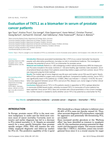 247 Central European Journal of Urology UROLOGICAL ONCOLOGY ORIGINAL PAPER Evaluation of TKTL1 as a biomarker in serum of prostate cancer patients Igor Tsaur1, Kristina Thurn2, Eva Juengel1, Elsie Oppermann3, Karen Nelson4, Christian Thomas1, Georg Bartsch1, Gerhard M. Oremek5, Axel Haferkamp1, Peter Rubenwolf6*, Roman A. Blaheta2* Mainz University Medical Center, Department of Urology, Mainz, Germany University Hospital Frankfurt, Department of Urology, Frankfurt, Germany 3 University Hospital Frankfurt, Department of Surgery, Frankfurt, Germany 4 University Hospital Frankfurt, Department of Vascular and Endovascular Surgery, Frankfurt, Germany 5 University Hospital Frankfurt, Department of Laboratory Medicine, Frankfurt, Germany 6 Vitalicum Urology Outpatient Unit, Frankfurt, Germany *contributed equally as senior authors 1 2 Citation: Tsaur I, Thurn K, Juengel E, et al. Evaluation of TKTL1 as a biomarker in serum of prostate cancer patients. Cent European J Urol. 2016; 69: 247-251. Article history Submitted: March 23, 2016 Accepted: June 5, 2016 Published online: June 30, 2016 Corresponding author Igor Tsaur University Medicine Mainz Department of Urology Langenbeckstr. 1 55131 Mainz, Germany phone: +49 613 1172 041 [email protected] Introduction Monocyte associated transketolase-like 1 (TKTL1) as a cancer biomarker has become popular with alternative practitioners, but plays no role in conventional medicine. This investigation evaluates the potential of serum TKTL1 as a biomarker for prostate cancer. Material and methods Patients (n = 66) undergoing curative radical prostatectomy (RPE) for biopsy-proven PCa were included in the study. Controls (n = 10) were healthy, age-matched, male volunteers. 10 ml of peripheral blood was drawn from patients several days before surgery and from controls. Serum TKTL1 was measured using the ELISA method. Results The median age at tumor diagnosis was 66 years and median serum PSA was 8.0 ng/ml. Nearly 96% of PCas submitted to surgery were clinically significant. Compared to healthy controls, serum TKTL1 was significantly lower in PCa patients (p = 0.0001, effect size indicator r = Z/sqr(n) = 0.4179). No correlation was apparent between serum TKTL1 and serum PSA, Gleason sum, tumor stage or further clinical and pathologic parameters. Conclusions Reduced serum TKTL1 in PCa patients stands in opposition to TKTL1 epitope detection in monocytes (EDIM) based studies, whereby increased TKTL1 in monocytes of tumor patients has been reported. Since serum TKTL1 does not correlate with clinical parameters in the current investigation, further research is needed to clarify whether serum TKTL1 has potential as a biomarker for PCa. Key Words: complementary medicine ‹› prostate cancer ‹› diagnosis ‹› biomarker ‹› TKTL1 INTRODUCTION In Europe, prostate cancer (PCa) is the most common malignancy in males and the third most common cause of cancer mortality. Currently, more extensive and earlier diagnosis has led to a decrease in PCa related mortality [1, 2]. Despite an extended search for a more specific biomarker than prostate specific antigen (PSA), PSA still remains the only widely employed diagnostic and follow-up marker for PCa [3]. The predictive capability of the 4 ng/ml Cent European J Urol. 2016; 69: 247-251 PSA threshold as a biopsy indicator is deficient since 20–40% of PCa cases are thereby missed [4]. Thus, other accurate diagnostic PCa biomarkers, especially for aggressive and potentially life-threatening PCa, are needed. Since increased aerobic glycolysis or the ’Warburg effect’ has been identified as common to neoplastic cells [5], this mechanism promises potential for diagnostic and therapeutic targets. The enzyme transketolase-like 1 (TKTL1), therefore, comes into investigational focus since it is a crucial enzyme for sugar doi: 10.5173/ceju.2016.820 248 Central European Journal of Urology fermentation, linking glucose and fat metabolism without pyruvate dehydrogenase [6, 7]. When overexpressed, TKTL1 activates the pentose phosphate pathway (PPP), accelerating tumor cell growth and supporting tumor survival and systemic dissemination [8]. Thus, it has been speculated that TKTL1 could become a cancer biomarker. Accordingly, an assay was developed to evaluate TKTL1 based on the fluorometric epitope detection of specific antibodies in CD14/CD16 positive monocytes, following tumor cell phagocytosis and digestion (EDIM-test) [9]. Still, the role of TKTL1 as a cancer biomarker is controversial [10, 11] and the EDIM-test has not been approved for routine clinical application. Nevertheless, though TKTL1 does not play a role in conventional medicine, it has gained high popularity in alternative/complementary medicine, not only as a diagnostic but also as a prediction marker to assess the risk of metastatic progression. The goal of the current investigation was to compare the TKTL1 serum level in patients with a clinically localized PCa to that in healthy controls. Furthermore, the investigation was directed towards establishing whether the TKTL1 serum level correlates with clinical and histologic parameters of the tumor, thus facilitating identification of patients harboring life-threatening disease requiring definitive treatment. For this purpose, the serum concentration of TKTL1 in PCa patients and healthy controls was analyzed by means of an enzyme-linked immunosorbent assay (ELISA), which is a highly standardized detection system [12], and correlated to clinical and histologic parameters. MATERIAL AND METHODS Patients (n = 66) undergoing curative radical prostatectomy (RPE) for biopsy-proven PCa in the Department of Urology, Goethe-University, Frankfurt am Main, Germany, were included in the investigation. Controls (n = 10) were healthy, age-matched, male volunteers. Approval to carry out the investigation was granted by the local medical ethics committee. Firstly, 10 ml peripheral blood was drawn from patients several days before su