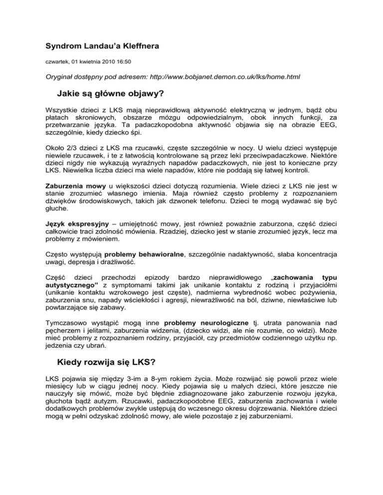 Syndrom Landau’a Kleffnera czwartek, 01 kwietnia 2010 16:50 Oryginał dostępny pod adresem: http://www.bobjanet.demon.co.uk/lks/home.html Jakie są główne objawy? Wszystkie dzieci z LKS mają nieprawidłową aktywność elektryczną w jednym, bądź obu płatach skroniowych, obszarze mózgu odpowiedzialnym, obok innych funkcji, za przetwarzanie języka. Ta padaczkopodobna aktywność objawia się na obrazie EEG, szczególnie, kiedy dziecko śpi. Około 2/3 dzieci z LKS ma rzucawki, częste szczególnie w nocy. U wielu dzieci występuje niewiele rzucawek, i te z łatwością kontrolowane są przez leki przeciwpadaczkowe. Niektóre dzieci nigdy nie wykazują wyraźnych napadów padaczkowych, nie jest to konieczne przy LKS. Niewielka liczba dzieci ma wiele napadów, które nie poddają się łatwej kontroli. Zaburzenia mowy u większości dzieci dotyczą rozumienia. Wiele dzieci z LKS nie jest w stanie zrozumieć własnego imienia. Maja również często problemy z rozpoznaniem dźwięków środowiskowych, takich jak dzwonek telefonu. Dzieci te mogą wydawać się być głuche. Język ekspresyjny – umiejętność mowy, jest również poważnie zaburzona, część dzieci całkowicie traci zdolność mówienia. Rzadziej, dziecko jest w stanie zrozumieć język, lecz ma problemy z mówieniem. Często występują problemy behawioralne, szczególnie nadaktywność, słaba koncentracja uwagi, depresja i drażliwość. Część dzieci przechodzi epizody bardzo nieprawidłowego „zachowania typu autystycznego” z symptomami takimi jak unikanie kontaktu z rodziną i przyjaciółmi (unikanie kontaktu wzrokowego jest częste), nadmierna wybredność wobec pożywienia, zaburzenia snu, napady wściekłości i agresji, niewrażliwość na ból, dziwne, niewłaściwe lub powtarzające się zabawy. Tymczasowo wystąpić mogą inne problemy neurologiczne tj. utrata panowania nad pęcherzem i jelitami, zaburzenia widzenia, (dziecko widzi, ale nie rozumie, co widzi). Może mieć problemy z rozpoznaniem rodziny, przyjaciół, czy przedmiotów codziennego użytku np. jedzenia czy ubrań. Kiedy rozwija się LKS? LKS pojawia się między 3-im a 8-ym rokiem życia. Może rozwijać się powoli przez wiele miesięcy lub w ciągu jednej nocy. Kiedy pojawia się u małych dzieci, które jeszcze nie nauczyły się mówić, może być błędnie zdiagnozowane jako zaburzenie rozwoju języka, głuchota bądź autyzm. Rzucawki, padaczkopodobne EEG, zaburzenia zachowania i wiele dodatkowych problemów zwykle ustępują do wczesnego okresu dojrzewania. Niektóre dzieci mogą w pełni odzyskać zdolność mowy, ale wiele pozostaje z jej zaburzeniami. Jak wygląda leczenie LKS? Leki przeciwpadaczkowe stosowane są w leczeniu rzucawek, ale często, na dłuższą metę, nie normalizują padaczkopodobnego EEG. Sterydy, stosowane wystarczająco wcześnie i przez dość długo, poprawiają obraz EEG i pozwalają na odzyskanie zdolności mowy. Dla dzieci, które nie reagują na sterydy, szanse powodzenia oferowane są przez nową procedurę chirurgii mózgu. Odpowiednia terapia mowy i języka, oraz specjalna edukacja odgrywają w przypadku tych dzieci bardzo ważną rolę. Przy niewielkim rozumieniu języka lub jego całkowitym braku, dzieciom należy wystarczająco wcześnie przybliżyć język migowy. Kształcenie winno odbywać się w specjalnej klasie lub szkole dla dzieci z poważnymi zaburzeniami mowy i języka (lub, jeśli nie jest to możliwe, w szkole dla dzieci głuchych). Co powinienem zrobić jeśli sądzę, iż dziecko może mieć LKS? Poproś lekarza o skierowanie na EEG. Powinno to być EEG wykonane w trakcie snu, jako iż wzór LKS może nie ujawnić się, kiedy dziecko jest obudzone. Poproś o skierowanie do pediatry neurologa – pamiętaj LKS to rzadkie zaburzenie. Wielu doświadczonych pediatrów i neurologów nigdy wcześniej nie spotkało się z takim przypadkiem. Poproś o skierowanie do kliniki lub lekarza mającego doświadczenie z LKS. Wczesna diagnoza i szybkie leczenie mogą poprawić szanse dziecka na pełne wyzdrowienie. Zapytaj, czy jest terapeuta mowy, psycholog czy inny specjalista w swojej dziedzinie, który ma doświadczenie z LKS, i z którym mogłabyś porozmawiać. Aby uzyskać dalsze informacje i porady, skontaktuj się z grupą wsparcia rodziców dzieci z LKS (FOLKS) nr rej. 1059499 (UK) Folks mogą dostarczyć ci dalszych informacji na temat leczenia, specjalnej edukacji, i skontaktować cię z rodzinami dzieci z LKS. Oryginalna wersja na stronie: htt://nidcd.nih.gov/health/voice/landklfs.asp Co to jest? LKS to dziecięce zaburzenie. Główną jego cechą jest stopniowa lub nagła utrata umiejętności rozumienia i używania języka mówionego. Wszystkie dzieci z LKS mają nieprawidłowe elektryczne fale mózgowe, które mogą zostać udokumentowane na elektroencefalogramie (EEG), zapisie elektrycznej aktywności mózgu. Około 80 % dzieci z LKS ma jeden lub kilka napadów padaczkowych, które zwykle pojawiają się w nocy. Zaburzenia zachowania takie jak nadaktywność, agresywność, depresja może także towarzyszyć temu zaburzeniu. LKS może zostać nazwane infantylną nabytą afazją, nabytą afazją epileptyczną lub afazją z zaburzeniami konwulsyjnymi. Ten syndrom został po raz pierwszy opisany w 1957 roku przez dr William’a Landau’a i dr Frank’a Kleffner’s, którzy zidentyfikowali 6-o dzieci z tym zaburzeniem. Jakie są objawy LKS? LKS pojawia się najczęściej u prawidłowo rozwijających się dzieci między 3-im i 7-ym rokiem życia. Bez żadnego widocznego powodu, dzieci te zaczynają mieć kłopoty ze zrozumieniem tego, co się do nich mówi. Lekarze często opisują ten problem jako słuchową, agnozyjną „głuchotę na słowa” Głuchota słuchowa może rozwijać się powoli lub bardzo szybko. Rodzice często myślą, iż dziecko ma problemy ze słuchem lub nagle ogłuchło. Testy słuchowe, jednakże, wykazują prawidłowy słuch. Dzieci mogą również 