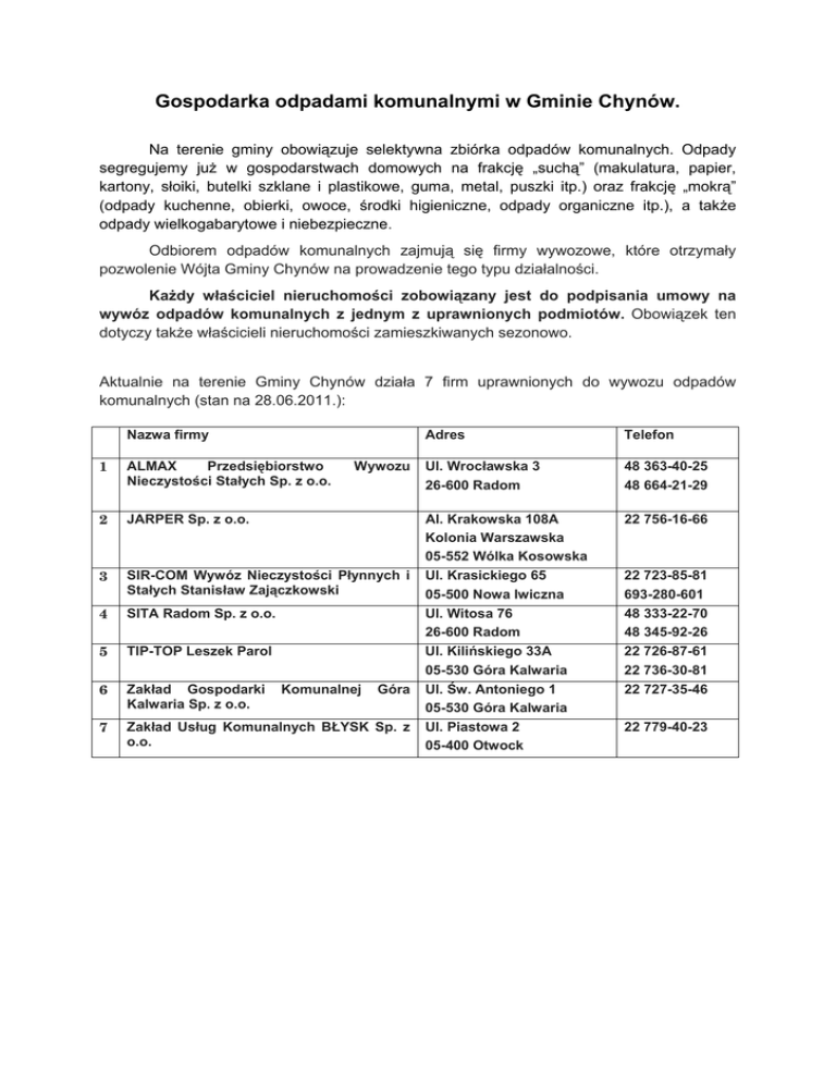 Gospodarka odpadami komunalnymi w Gminie Chynów. Na terenie gminy obowiązuje selektywna zbiórka odpadów komunalnych. Odpady segregujemy już w gospodarstwach domowych na frakcję „suchą” (makulatura, papier, kartony, słoiki, butelki szklane i plastikowe, guma, metal, puszki itp.) oraz frakcję „mokrą” (odpady kuchenne, obierki, owoce, środki higieniczne, odpady organiczne itp.), a także odpady wielkogabarytowe i niebezpieczne. Odbiorem odpadów komunalnych zajmują się firmy wywozowe, które otrzymały pozwolenie Wójta Gminy Chynów na prowadzenie tego typu działalności. Każdy właściciel nieruchomości zobowiązany jest do podpisania umowy na wywóz odpadów komunalnych z jednym z uprawnionych podmiotów. Obowiązek ten dotyczy także właścicieli nieruchomości zamieszkiwanych sezonowo. Aktualnie na terenie Gminy Chynów działa 7 firm uprawnionych do wywozu odpadów komunalnych (stan na 28.06.2011.): Nazwa firmy 1 ALMAX Przedsiębiorstwo Nieczystości Stałych Sp. z o.o. 2 JARPER Sp. z o.o. 3 SIR-COM Wywóz Nieczystości Płynnych i Stałych Stanisław Zajączkowski 4 SITA Radom Sp. z o.o. 5 TIP-TOP Leszek Parol 6 Zakład Gospodarki Kalwaria Sp. z o.o. 7 Zakład Usług Komunalnych BŁYSK Sp. z o.o. Wywozu Komunalnej Góra Adres Telefon Ul. Wrocławska 3 26-600 Radom 48 363-40-25 48 664-21-29 Al. Krakowska 108A Kolonia Warszawska 05-552 Wólka Kosowska Ul. Krasickiego 65 05-500 Nowa Iwiczna Ul. Witosa 76 26-600 Radom Ul. Kilińskiego 33A 05-530 Góra Kalwaria Ul. Św. Antoniego 1 05-530 Góra Kalwaria Ul. Piastowa 2 05-400 Otwock 22 756-16-66 22 723-85-81 693-280-601 48 333-22-70 48 345-92-26 22 726-87-61 22 736-30-81 22 727-35-46 22 779-40-23