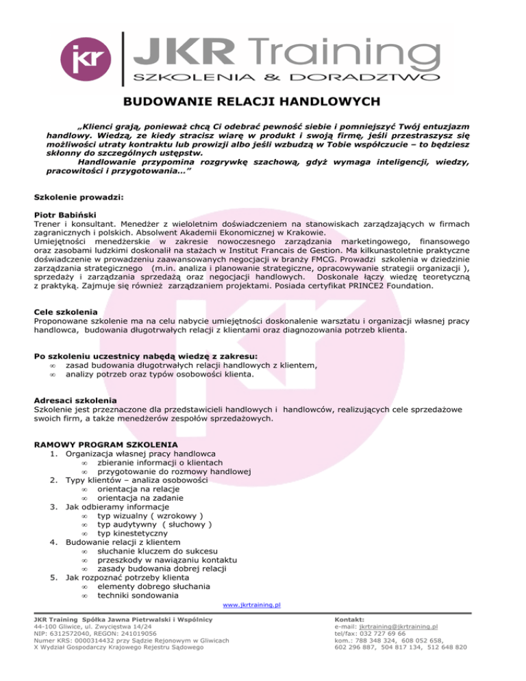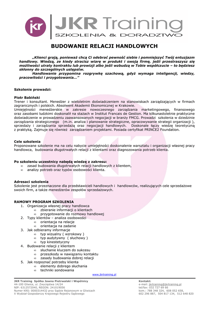 BUDOWANIE RELACJI HANDLOWYCH „Klienci grają, poniewaŜ chcą Ci odebrać pewność siebie i pomniejszyć Twój entuzjazm handlowy. Wiedzą, ze kiedy stracisz wiarę w produkt i swoją firmę, jeśli przestraszysz się moŜliwości utraty kontraktu lub prowizji albo jeśli wzbudzą w Tobie współczucie – to będziesz skłonny do szczególnych ustępstw. Handlowanie przypomina rozgrywkę szachową, gdyŜ wymaga inteligencji, wiedzy, pracowitości i przygotowania…” Szkolenie prowadzi: Piotr Babiński Trener i konsultant. MenedŜer z wieloletnim doświadczeniem na stanowiskach zarządzających w firmach zagranicznych i polskich. Absolwent Akademii Ekonomicznej w Krakowie. Umiejętności menedŜerskie w zakresie nowoczesnego zarządzania marketingowego, finansowego oraz zasobami ludzkimi doskonalił na staŜach w Institut Francais de Gestion. Ma kilkunastoletnie praktyczne doświadczenie w prowadzeniu zaawansowanych negocjacji w branŜy FMCG. Prowadzi szkolenia w dziedzinie zarządzania strategicznego (m.in. analiza i planowanie strategiczne, opracowywanie strategii organizacji ), sprzedaŜy i zarządzania sprzedaŜą oraz negocjacji handlowych. Doskonale łączy wiedzę teoretyczną z praktyką. Zajmuje się równieŜ zarządzaniem projektami. Posiada certyfikat PRINCE2 Foundation. Cele szkolenia Proponowane szkolenie ma na celu nabycie umiejętności doskonalenie warsztatu i organizacji własnej pracy handlowca, budowania długotrwałych relacji z klientami oraz diagnozowania potrzeb klienta. Po szkoleniu uczestnicy nabędą wiedzę z zakresu: • zasad budowania długotrwałych relacji handlowych z klientem, • analizy potrzeb oraz typów osobowości klienta. Adresaci szkolenia Szkolenie jest przeznaczone dla przedstawicieli handlowych i handlowców, realizujących cele sprzedaŜowe swoich firm, a takŜe menedŜerów zespołów sprzedaŜowych. RAMOWY PROGRAM SZKOLENIA 1. Organizacja własnej pracy handlowca • zbieranie informacji o klientach • przygotowanie do rozmowy handlowej 2. Typy klientów – analiza osobowości • orientacja na relacje • orientacja na zadanie 3. Jak odbieramy informacje • typ wizualny ( wzrokowy ) • typ audytywny ( słuchowy ) • typ kinestetyczny 4. Budowanie relacji z klientem • słuchanie kluczem do sukcesu • przeszkody w nawiązaniu kontaktu • zasady budowania dobrej relacji 5. Jak rozpoznać potrzeby klienta • elementy dobrego słuchania • techniki sondowania www.jkrtraining.pl JKR Training Spółka Jawna Pietrwalski i Wspólnicy 44-100 Gliwice, ul. Zwycięstwa 14/24 NIP: 6312572040, REGON: 241019056 Numer KRS: 0000314432 przy Sądzie Rejonowym w Gliwicach X Wydział Gospodarczy Krajowego Rejestru Sądowego Kontakt: e-mail: [email protected] tel/fax: 032 727 69 66 kom.: 788 348 324, 608 052 658, 602 296 887, 504 817 134, 512 648 820 6. Zaspokajanie potrzeb klienta • oferta w kategoriach korzyści • wątpliwości i zastrzeŜenia klienta 7. Zakończenie spotkania • pomost w przyszłość Metody szkoleniowe Wykład, dyskusja, warsztat, studium przypadku Miejsce szkolenia: Katowice, ul. Jordana 18, Wydział Teologiczny Termin szkolenia: 06.07.2010 i 07.07.2010r. Czas trwania szkolenia: 2 dni po 8 godz. dydaktycznych Cena szkolenia 800 zł Cena obejmuje: • uczestnictwo w zajęciach, • materiały szkoleniowe, • przerwy kawowe, • obiad, • certyfikat ukończenia szkolenia, • konsultacje po szkoleniu. Warunki uczestnictwa Podstawą wzięcia udziału w szkoleniu jest przesłanie karty zgłoszenia faksem na nr: 32 727 69 66 lub przesłanie skanu karty zgłoszenia na adres mailowy: [email protected] oraz dokonanie wpłaty nie później niŜ 7 dni roboczych przed rozpoczęciem szkolenia przelewem na konto bankowe: Lukas Bank 97 1940 1076 3085 3463 0000 0000 Prosimy o dokonywanie wpłat dopiero po otrzymaniu potwierdzenia uczestnictwa. Informacja o zakwalifikowaniu na szkolenie zostanie przekazana drogą elektroniczną lub faxem. Warunki rezygnacji Rezygnacja ze szkolenia w terminie krótszym niŜ 7 dni roboczych przed terminem rozpoczęcia szkolenia, wiąŜe się z koniecznością pokrycia kosztów organizacyjnych w wysokości 100%. Nieobecność na szkoleniu nie zwalnia z konieczności dokonania opłaty za udział. Pobierz formularz zamówienia: http://jkrtraining.pl/files/formularz%20zgłoszenia.doc www.jkrtraining.pl JKR Training Spółka Jawna Pietrwalski i Wspólnicy 44-100 Gliwice, ul. Zwycięstwa 14/24 NIP: 6312572040, REGON: 241019056 Numer KRS: 0000314432 przy Sądzie Rejonowym w Gliwicach X Wydział Gospodarczy Krajowego Rejestru Sądowego Kontakt: e-mail: [email protected] tel/fax: 032 727 69 66 kom.: 788 348 324, 608 052 658, 602 296 887, 504 817 134, 512 648 820