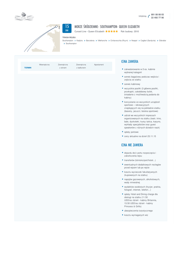 Infolinia 15 MORZE ŚRÓDZIEMNE- SOUTHAMPTON- QUEEN ELIZABETH DNI Cunard Line - Queen Elizabeth 801 08 08 03 22 492 77 90 | Rok budowy: 2010 TRASA REJSU: Southampton Kadyks Barcelona Villefranche Civitavecchia (Rzym) Neapol Cagliari (Sardynia) Gibraltar Southampton Wewnętrzna TERMIN Zewnętrzna Zewnętrzna z oknem z balkonem Apartament CENA ZAWIERA zakwaterowanie w 2-os. kabinie wybranej kategorii serwis bagażowy podczas wejścia i zejścia ze statku serwis kabinowy wszystkie posiłki (3 główne posiłki, przekąski, całodobowy bufet, śniadanie z możliwością podania do kabiny) korzystanie ze wszystkich urządzeń sportowo – rekreacyjnych znajdujących się na pokładzie statku (baseny, jacuzzi, boiska sportowe) udział we wszystkich imprezach organizowanych na statku (teatr, kino, bale, dyskoteki, kursy tańca, kasyno, wykłady specjalistów oraz guest speakerów z różnych dziedzin nauk) opłaty portowe ceny aktualne na dzień 23.11.15 CENA NIE ZAWIERA dojazdu do/z portu rozpoczęcia i zakończenia rejsu transferów (lotnisko/port/hotel...) ewentualnych dodatkowych noclegów przed rejsem lub po rejsie kosztu wycieczek fakultatywnych (kupowanych na statku) napojów gazowanych, alkoholowych, wody mineralnej wydatków osobistych (fryzjer, pralnia, fotograf, internet, telefon...) opłaty Hotel and Dining charge dla obsługi na statku (11.50 USD/os./dzień - kabiny Britannia, 13.50 USD/os./dzień - kabiny Princess & Grills) ubezpieczenia turystycznego kosztu wymaganych wiz