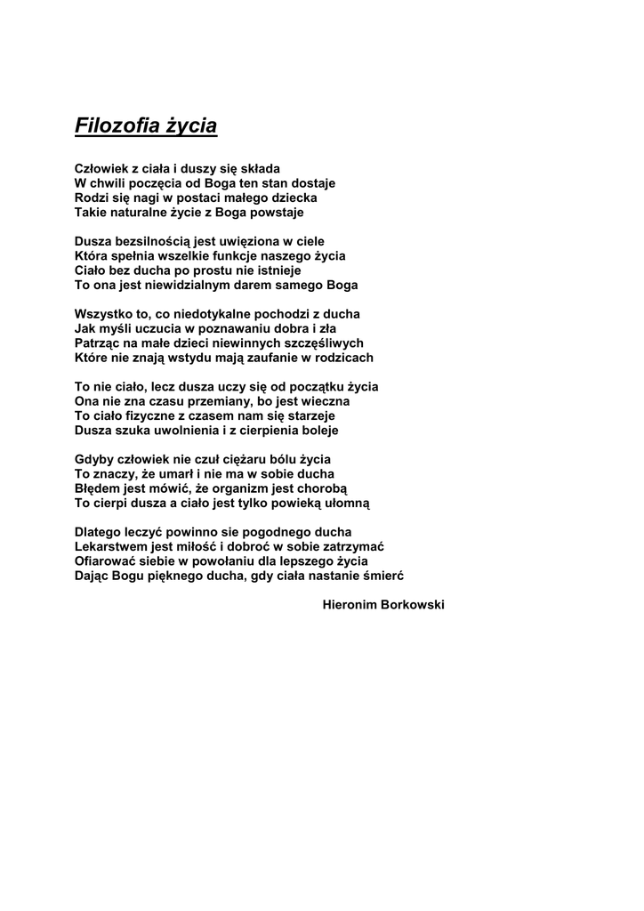 Filozofia życia Człowiek z ciała i duszy się składa W chwili poczęcia od Boga ten stan dostaje Rodzi się nagi w postaci małego dziecka Takie naturalne życie z Boga powstaje Dusza bezsilnością jest uwięziona w ciele Która spełnia wszelkie funkcje naszego życia Ciało bez ducha po prostu nie istnieje To ona jest niewidzialnym darem samego Boga Wszystko to, co niedotykalne pochodzi z ducha Jak myśli uczucia w poznawaniu dobra i zła Patrząc na małe dzieci niewinnych szczęśliwych Które nie znają wstydu mają zaufanie w rodzicach To nie ciało, lecz dusza uczy się od początku życia Ona nie zna czasu przemiany, bo jest wieczna To ciało fizyczne z czasem nam się starzeje Dusza szuka uwolnienia i z cierpienia boleje Gdyby człowiek nie czuł ciężaru bólu życia To znaczy, że umarł i nie ma w sobie ducha Błędem jest mówić, że organizm jest chorobą To cierpi dusza a ciało jest tylko powieką ułomną Dlatego leczyć powinno sie pogodnego ducha Lekarstwem jest miłość i dobroć w sobie zatrzymać Ofiarować siebie w powołaniu dla lepszego życia Dając Bogu pięknego ducha, gdy ciała nastanie śmierć Hieronim Borkowski