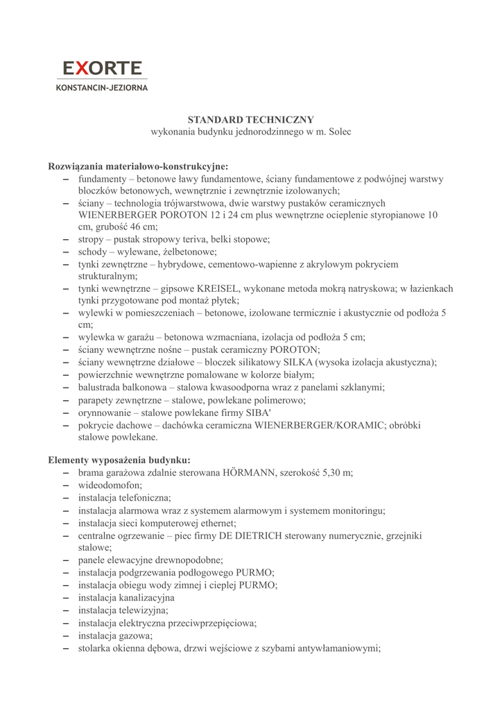 STANDARD TECHNICZNY wykonania budynku jednorodzinnego w m. Solec Rozwiązania materiałowo-konstrukcyjne: – fundamenty – betonowe ławy fundamentowe, ściany fundamentowe z podwójnej warstwy bloczków betonowych, wewnętrznie i zewnętrznie izolowanych; – ściany – technologia trójwarstwowa, dwie warstwy pustaków ceramicznych WIENERBERGER POROTON 12 i 24 cm plus wewnętrzne ocieplenie styropianowe 10 cm, grubość 46 cm; – stropy – pustak stropowy teriva, belki stopowe; – schody – wylewane, żelbetonowe; – tynki zewnętrzne – hybrydowe, cementowo-wapienne z akrylowym pokryciem strukturalnym; – tynki wewnętrzne – gipsowe KREISEL, wykonane metoda mokrą natryskowa; w łazienkach tynki przygotowane pod montaż płytek; – wylewki w pomieszczeniach – betonowe, izolowane termicznie i akustycznie od podłoża 5 cm; – wylewka w garażu – betonowa wzmacniana, izolacja od podłoża 5 cm; – ściany wewnętrzne nośne – pustak ceramiczny POROTON; – ściany wewnętrzne działowe – bloczek silikatowy SILKA (wysoka izolacja akustyczna); – powierzchnie wewnętrzne pomalowane w kolorze białym; – balustrada balkonowa – stalowa kwasoodporna wraz z panelami szklanymi; – parapety zewnętrzne – stalowe, powlekane polimerowo; – orynnowanie – stalowe powlekane firmy SIBA' – pokrycie dachowe – dachówka ceramiczna WIENERBERGER/KORAMIC; obróbki stalowe powlekane. Elementy wyposażenia budynku: – brama garażowa zdalnie sterowana HÖRMANN, szerokość 5,30 m; – wideodomofon; – instalacja telefoniczna; – instalacja alarmowa wraz z systemem alarmowym i systemem monitoringu; – instalacja sieci komputerowej ethernet; – centralne ogrzewanie – piec firmy DE DIETRICH sterowany numerycznie, grzejniki stalowe; – panele elewacyjne drewnopodobne; – instalacja podgrzewania podłogowego PURMO; – instalacja obiegu wody zimnej i cieplej PURMO; – instalacja kanalizacyjna – instalacja telewizyjna; – instalacja elektryczna przeciwprzepięciowa; – instalacja gazowa; – stolarka okienna dębowa, drzwi wejściowe z szybami antywłamaniowymi; – oświetlenie podjazdu. Zagospodarowanie terenu: – podjazd i miejsca parkingowe, śmietnik – kostka LIBET podbudowa betonowa; – ciągi piesze - kostka betonowa LIBET stabilizacja cementowa; – zewnętrzny śmietnik; – opaska budynku – kostka betonowa LIBET; – taras ogrodowy – kostka betonowa LIBET; – brama wjazdowa NICE elektrycznie otwierana; – ogród wyplantowany, założony trawnik.