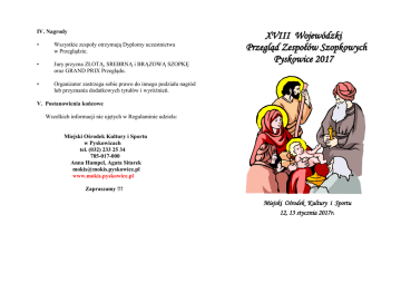 IV. Nagrody • Wszystkie zespoły otrzymują Dyplomy uczestnictwa w Przeglądzie. • Jury przyzna ZŁOTĄ, SREBRNĄ i BRĄZOWĄ SZOPKĘ oraz GRAND PRIX Przeglądu. • Organizator zastrzega sobie prawo do innego podziału nagród lub przyznania dodatkowych tytułów i wyróżnień. XVIII Wojewódzki Przegląd Zespołów Szopkowych Pyskowice 2017 V. Postanowienia końcowe Wszelkich informacji nie ujętych w Regulaminie udziela: Miejski Ośrodek Kultury i Sportu w Pyskowicach tel. (032) 233 25 34 785-017-000 Anna Hampel, Agata Sitarek [email protected] www.mokis.pyskowice.pl Zapraszamy !!! Miejski Ośrodek Kultury i Sportu 12, 13 stycznia 2017r. XVIII Wojewódzki Przegląd Zespołów Szopkowych PYSKOWICE 2017 9. Przegląd odbędzie się: 12 stycznia 2017r. godz. 9.00 kategorie: klasy 1-3, 4-6, gimnazjum I. Organizator Miejski Ośrodek Kultury i Sportu w Pyskowicach II. Warunki uczestnictwa 1. W Przeglądzie biorą udział zespoły reprezentujące instytucje: Przedszkola, Szkoły Podstawowe, Gimnazja, Ośrodki i Domy Kultury, Świetlice i Parafie. 2. Ustala się pięć kategorii wiekowych: - przedszkolną - klasy 1-3 szkół podstawowych - klasy 4-6 szkół podstawowych - gimnazjalną - ponadgimnazjalną Organizator zastrzega sobie prawo do połączenia kategorii wiekowych w momencie zgłoszenia się małej ilości zespołów. 3. Uczestnicy prezentują tylko jeden spektakl max do 20 min. 5. Uczestnicy przyjeżdżają z własnym podkładem muzycznym. 6. Zgłoszenia na Przegląd przyjmowane będą na podstawie dokładnie wypełnionej karty zgłoszenia. 7. Znajomość Regulaminu potwierdzają opiekunowie zespołów podpisując czytelnie karty zgłoszeń. 8. Zgłoszenia należy nadesłać na adres: Miejski Ośrodek Kultury i Sportu 44 – 120 Pyskowice ul. Kard. St. Wyszyńskiego 27 lub mailem [email protected] w terminie do 06 stycznia 2017r. 13 stycznia 2017r. godz. 9.00 kategorie: przedszkolna, ponadgimnazjalna sala widowiskowa Miejskiego Ośrodka Kultury i Sportu w Pyskowicach UWAGA!!! Ogłoszenie wyników i wręczenie nagród nastąpi w dniu prezentacji, po zakończeniu danej kat. wiekowej!! 10. Organizator zapewnia scenę (6 x 8m), garderoby, nagłośnienie 11. Organizator nie zapewnia dekoracji sceny i rekwizytów. 12. Zespoły uczestniczące w Przeglądzie przyjeżdżają na koszt własny. 13. Obowiązuje zakaz używania otwartego ognia podczas spektaklu!!! 14. Harmonogram występów będzie dostępny na stronie internetowej www.mokis.pyskowice.pl oraz na facebooku w dniu 09.01.2017r. III. Jury Przeglądu • Komisję konkursową przeglądu powołuje Organizator • Komisja oceniać będzie: a) dobór repertuaru (tekstu i muzyki) b) ruch sceniczny/choreografię c) scenografię d) interpretację muzyczną i słowną e) ogólny wyraz artystyczny