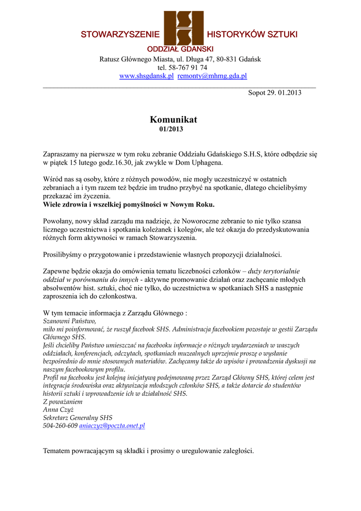 STOWARZYSZENIE HISTORYKÓW SZTUKI ODDZIA GDA SKI Ratusz Głównego Miasta, ul. Długa 47, 80-831 Gdańsk tel. 58-767 91 74 www.shsgdansk.pl [email protected] ___________________________________________________________________________ Sopot 29. 01.2013 Komunikat 01/2013 Zapraszamy na pierwsze w tym roku zebranie Oddziału Gdańskiego S.H.S, które odbędzie się w piątek 15 lutego godz.16.30, jak zwykle w Dom Uphagena. Wśród nas są osoby, które z różnych powodów, nie mogły uczestniczyć w ostatnich zebraniach a i tym razem też będzie im trudno przybyć na spotkanie, dlatego chcielibyśmy przekazać im życzenia. Wiele zdrowia i wszelkiej pomyślności w Nowym Roku. Powołany, nowy skład zarządu ma nadzieje, że Noworoczne zebranie to nie tylko szansa licznego uczestnictwa i spotkania koleżanek i kolegów, ale też okazja do przedyskutowania różnych form aktywności w ramach Stowarzyszenia. Prosilibyśmy o przygotowanie i przedstawienie własnych propozycji działalności. Zapewne będzie okazja do omówienia tematu liczebności członków – duży terytorialnie oddział w porównaniu do innych - aktywne promowanie działań oraz zachęcanie młodych absolwentów hist. sztuki, choć nie tylko, do uczestnictwa w spotkaniach SHS a następnie zaproszenia ich do członkostwa. W tym temacie informacja z Zarządu Głównego : Szanowni Państwo, miło mi poinformować, że ruszył facebook SHS. Administracja facebookiem pozostaje w gestii Zarządu Głównego SHS. Jeśli chcieliby Państwo umieszczać na facebooku informacje o różnych wydarzeniach w waszych oddziałach, konferencjach, odczytach, spotkaniach muzealnych uprzejmie proszę o wysłanie bezpośrednio do mnie stosownych materiałów. Zachęcamy także do wpisów i prowadzenia dyskusji na naszym facebookowym profilu. Profil na facebooku jest kolejną inicjatywą podejmowaną przez Zarząd Główny SHS, której celem jest integracja środowiska oraz aktywizacja młodszych członków SHS, a także dotarcie do studentów historii sztuki i wprowadzenie ich w działalność SHS. Z poważaniem Anna Czyż Sekretarz Generalny SHS 504-260-609 [email protected] Tematem powracającym są składki i prosimy o uregulowanie zaległości. Uruchamiana jest strona internetowa naszego oddziału i głównie tam będą zamieszczane informacje, a o zebraniach dodatkowo rozsyłane wiadomości email, natomiast osoby, które nie posiadają email’a będą informowane tradycyjnie, listownie. W związku z tym prosimy o uaktualnienie lub potwierdzenie danych. Dodatkowa prośba do wielu Koleżanek i Kolegów, by byli uprzejmi odpowiadać na email’e, gdyż na wysłany ostatni w dniu 22 stycznia, na 50 osób odpowiedziało tylko14 osób, którym tą drogą chciałbym bardzo podziękować. Zarząd Oddziału S.H.S Gdańsk Skarbnik Oddziału – Bartek Jaszewski [email protected] Sekretarz Oddziału – Jan Leszczyłowski [email protected] Członek Zarządu Oddziału – Józef Tarnowski [email protected] Wiceprezes Oddziału – Maciej Rydel [email protected] Prezes Zarządu Oddziału – Małgorzata Buchholz-Todoroska. [email protected] Z poważaniem Jan Leszczyłowski Sekretarz