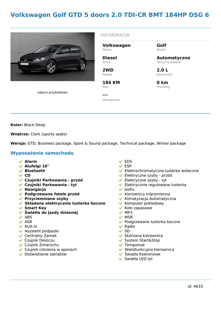 Volkswagen Golf GTD 5 doors 2.0 TDI-CR BMT 184HP DSG 6 INFORMACJE zdjęcie przykładowe Volkswagen Golf Marka Model Diesel Automatyczna Silnik Skrzynia biegów 2WD 2.0 L Napęd pojemność 184 KM 0 km Moc Przebieg --Dostępność Kolor: Black Deep Wnętrze: Clark (sports seats) Wersja: GTD, Business package, Sport & Sound package, Technical package, Winter package Wyposażenie samochodu Alarm Alufelgi 18'' Bluetooth CD Czujniki Parkowania - przód Czujniki Parkowania - tył Nawigacja Podgrzewane fotele przód Przyciemniane szyby Składane elektrycznie lusterka boczne Smart Key Światła do jazdy dziennej ABS ASR AUX-in Asystent podjazdu Centralny Zamek Czujnik Deszczu Czujnik Zmierzchu Czujnik ciśnienia w oponach Doświetlanie zakrętów EDS ESP Elektrochromatyczne lusterko wsteczne Elektryczne szyby - przód Elektryczne szyby - tył Elektrycznie regulowane lusterka Isofix Kierownica trójramienna Klimatyzacja Automatyczna Komputer pokładowy Koło zapasowe MP3 MSR Podgrzewane lusterka boczne Radio SD Skórzana kierownica System Start&Stop Tempomat Wielofunkcyjna kierownica Światła Ksenonowe Światła LED tył id: 4633 Powered by TCPDF (www.tcpdf.org)