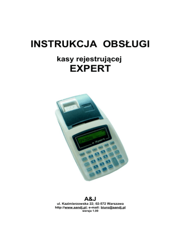 INSTRUKCJA OBSŁUGI kasy rejestrującej EXPERT A&J ul. Kazimierzowska 22; 02-572 Warszawa http://www.aandj.pl; e-mail: [email protected] wersja 1.00 Kasa rejestrująca EXPERT - instrukcja obsługi 1 WSTĘP.....................................................................................................................................4 2 BUDOWA I EKSPLOATACJA KASY......................................................................................6 2.1 PARAMETRY TECHNICZNE.......................................................................................................6 2.2 PARAMETRY UŻYTKOWE ........................................................................................................6 2.3 WARUNKI EKSPLOATACJI .......................................................................................................7 2.4 BUDOWA KASY ...................................................................................................................8 2.5 WŁĄCZANIE I WYŁĄCZANIE KASY..............................................................................................8 2.6 GNIAZDA PRZYŁĄCZENIOWE....................................................................................................8 2.7 KONFIGURACJA KLAWIATURY...................................................................................................9 2.8 WYMIANA PAPIERU...............................................................................................................9 2.9 ZASILANIE KASY ................................................................................................................12 3 WYBÓR TRYBU PRACY KASY............................................................................................12 4 TRYB PROGRAMOWANIA...................................................................................................13 4.1 FUNKCJE DOSTĘPNE W TRYBIE PROGRAMOWANIA.......................................................................13 4.2 REDAGOWANIE PÓL TEKSTOWYCH .........................................................................................13 4.3 PROGRAMOWANIE USTAWIEŃ KASY.........................................................................................15 4.4 PROGRAMOWANIE KASJERÓW................................................................................................19 4.5 PROGRAMOWANIE NAGŁÓWKA PARAGONU.................................................................................20 4.6 PROGRAMOWANIE NAZW PŁATNOŚCI / WALUT............................................................................20 4.7 PROGRAMOWANIE STAWEK PTU...........................................................................................21 4.8 PROGRAMOWANIE PLU......................................................................................................22 4.9 WYDRUK BAZY TOWARÓW (PLU).........................................................................................25 4.10 PROGRAMOWANIE KLAWISZY SZYBKIEJ SPRZEDAŻY...................................................................26 4.11 PROGRAMOWANIE BAZY OPAKOWAŃ ZWROTNYCH.....................................................................26 4.12 WYDRUK BAZY OPAKOWAŃ ZWROTNYCH................................................................................28 4.13 PROGRAMOWANIE CZASU...................................................................................................28 4.14 PROGRAMOWANIE NAZW WALUT..........................................................................................29 4.15 PROGRAMOWANIE WALUTY DODATKOWEJ...............................................................................29 4.16 ZMIANA WALUTY EWIDENCYJNEJ...........................................................................................30 4.17 RAPORT OPISÓW STAŁYCH KASY..........................................................................................30 4.18 RAPORT TECHNICZNY KASY................................................................................................30 5 TRYB SPRZEDAŻY...............................................................................................................31 5.1 FUNKCJE DOSTĘPNE W TRYBIE SPRZEDAŻY...............................................................................31 5.2 SPRZEDAŻ POPRZEZ PLU...................................................................................................32 5.3 SPRZEDAŻ POPRZEZ KLAWISZE SZYBKIEJ SPRZEDAŻY..................................................................33 5.4 RABATY I NARZUTY.............................................................................................................34 5.4.1 Rabaty i narzuty procentowe.................................................................34 5.4.2 Rabaty i narzuty kwotowe......................................................................35 5.5 KOREKTA I ANULOWANIE PARAGONU.......................................................................................35 5.6 ZWROT I WYDANIE OPAKOWAŃ...............................................................................................36 5.7 ZAMKNIĘCIE PARAGONU.......................................................................................................37 5.8 WPŁATA GOTÓWKI DO KASY.................................................................................................39 5.9 WYPŁATA GOTÓWKI Z KASY .................................................................................................39 6 RAPORTY..............................................................................................................................40 6.1 RAPORTY PODGLĄDOWE (RAPORTY X)..............................................................................40 6.2 RAPORTY ZERUJĄCE (RAPORTY Z)...................................................................................41 6.3 RAPORTY Z PAMIĘCI FISKALNEJ (RAP.FISK.).....................................
