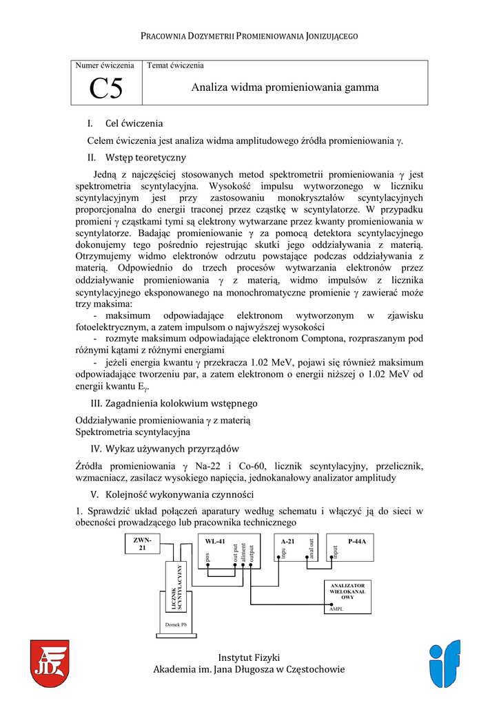 PRACOWNIA DOZYMETRII PROMIENIOWANIA JONIZUJĄCEGO Numer ćwiczenia Temat ćwiczenia C5 I. Analiza widma promieniowania gamma Cel ćwiczenia Celem ćwiczenia jest analiza widma amplitudowego źródła promieniowania . II. Wstęp teoretyczny Jedną z najczęściej stosowanych metod spektrometrii promieniowania jest spektrometria scyntylacyjna. Wysokość impulsu wytworzonego w liczniku scyntylacyjnym jest przy zastosowaniu monokryształów scyntylacyjnych proporcjonalna do energii traconej przez cząstkę w scyntylatorze. W przypadku promieni cząstkami tymi są elektrony wytwarzane przez kwanty promieniowania w scyntylatorze. Badając promieniowanie γ za pomocą detektora scyntylacyjnego dokonujemy tego pośrednio rejestrując skutki jego oddziaływania z materią. Otrzymujemy widmo elektronów odrzutu powstające podczas oddziaływania z materią. Odpowiednio do trzech procesów wytwarzania elektronów przez oddziaływanie promieniowania z materią, widmo impulsów z licznika scyntylacyjnego eksponowanego na monochromatyczne promienie zawierać może trzy maksima: - maksimum odpowiadające elektronom wytworzonym w zjawisku fotoelektrycznym, a zatem impulsom o najwyższej wysokości - rozmyte maksimum odpowiadające elektronom Comptona, rozpraszanym pod różnymi kątami z różnymi energiami - jeżeli energia kwantu przekracza 1.02 MeV, pojawi się również maksimum odpowiadające tworzeniu par, a zatem elektronom o energii niższej o 1.02 MeV od energii kwantu E . III. Zagadnienia kolokwium wstępnego Oddziaływanie promieniowania z materią Spektrometria scyntylacyjna IV. Wykaz używanych przyrządów Źródła promieniowania Na-22 i Co-60, licznik scyntylacyjny, przelicznik, wzmacniacz, zasilacz wysokiego napięcia, jednokanałowy analizator amplitudy V. Kolejność wykonywania czynności LICZNIK SCYNTYLACYJNY P-44A input A-21 anal out pos WL-41 input ZWN21 out put aliment output 1. Sprawdzić układ połączeń aparatury według schematu i włączyć ją do sieci w obecności prowadzącego lub pracownika technicznego ANALIZATOR WIELOKANAŁ OWY AMPL Domek Pb Instytut Fizyki Akademia im. Jana Długosza w Częstochowie PRACOWNIA DOZYMETRII PROMIENIOWANIA JONIZUJĄCEGO 2. Zdejmowanie widma amplitudowego dla źródła Na-22 oraz Co-60: W tym celu należy: (a) sprawdzić układ połączeń aparatury i włączyć ją do sieci w obecności prowadzącego lub pracownika technicznego (b) ustawić na zasilaczu napięcie 950 V (c) ustalić czas zliczeń 50 s (d) ustawić wartość 0.2 V na prawym potencjometrze analizatora (A-21) (e) umieścić źródło promieniowania Na-22 w osłonie licznika i zmieniając napięcie na lewym potencjometrze w zakresie od 0.1 do 9.5V (co 0,1V) dokonć pomiaru liczby zliczeń dla każdej wartości napięcia (f) powtórzyć pomiary z punktu (e) dla źródła promieniowania Co-60 VI. Uzyskane wyniki Wyniki pomiarów zanotować w tabeli: Na-22 U [V] Co-60 N [imp] U [V] N [imp] Opracowanie części doświadczalnej powinno zawierać: - protokół z wykonania ćwiczenia - wykresy widm obu badanych źródeł promieniowania - energię kwantów γ izotopu Co-60 określoną na podstawie widm oraz znajomości schematu rozpadu izotopu Na-22 (patrz: materiały pomocnicze do ćwiczeń) - wnioski VII. Bibliografia 1. A.Strzałkowski: Wstęp do fizyki jądra atomowego, PWN, 1978 2 J.Araminowicz, K.Małuszyńska, M.Przytuła: Laboratorium fizyki jądrowej, PWN, Warszawa, 1974 3. Sz.Szczeniowski: Fizyka doświadczalna, cz.VI Fizyka jądra i cząstek elementarnych, PWN, Warszawa 1974 4. J.B.A. England: Metody doświadczalne fizyki jądrowej, PWN, Warszawa, 1980 Instytut Fizyki Akademia im. Jana Długosza w Częstochowie