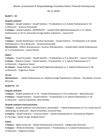 Wyniki przesłuchań IX Wojewódzkiego Festiwalu Pieśni i Piosenki Patriotycznej 05.11.2016r. KLASY I - III Zespoły wokalne I miejsce – Zespół wokalny – Zespół Szkolno – Przedszkolny nr 8, Szkoła Podstawowa nr 18 w Gliwicach – Grażyna Konowalik II miejsce – Zespół wokalny „MODERATO” – Zespół Szkół Ogólnokształcących nr 11, Szkoła Podstawowa nr 32 im. Generała Jerzego Ziętka w Bytomiu – Joanna Put Duety I miejsce – Amelia Bartkiewicz i Karolina Siemionka – Zespól Szkolno – Przedszkolny nr 8, Szkoła Podstawowa nr 18 w Gliwicach – Grażyna Konowalik Wyróżnienie – Miłosz Wandasiewicz i Szymon Wandasiewicz – Zespół Szkół, Szkoła Podstawowa nr 5 w Pyskowicach – Janina Płonka Soliści I miejsce – Paweł Żurawski – Zespół Szkolno – Przedszkolny nr 6 w Gliwicach – Joanna Tuczykont II miejsc – Wiktoria Cieślar – Zespół Szkolno - Przedszkolny nr 3, Szkoła Podstawowa nr 5 w Gliwicach – Eugeniusz Siwiec III miejsce – Kinga Rokicka – Zespół Szkół Ogólnokształcących nr 2, Szkoła Podstawowa nr 38 w Gliwicach – Eugeniusz Siwiec Tercet Wyróżnienie – - Szkoła Podstawowa im. Księdza Jerzego Popiełuszki w Wojsce – Ewa Bielat, Urszula Mroczek KLASY IV - VI Zespoły wokalne I miejsce – Zespół wokalny SP nr 23 – Szkoła Podstawowa nr 23 w Gliwicach – Beata Borycka II miejsca – Zespół wokalny – Zespół Szkolno – Przedszkolny nr 8, Szkoła Podstawowa nr 18 w Gliwicach – Joanna Czekańska, Alina Brodka Zespoły wokalno-instrumentalne I miejsce – Zespół wokalno-instrumentalny „Dziewiątka” – Szkoła Podstawowa nr 9 im. Króla Jana III Sobieskiego w Gliwicach – Beata Śmietanka, Krzysztof Kijas II miejsce – Zespół wokalno – instrumentalny – Szkoła Podstawowa im. Powstańców Śląskich w Tworogu – Beata Janiga, Brygida Samol Soliści I miejsce – Agata Szewczyk – Szkoła Podstawowa w Kotulinie – Małgorzata Powrósło II miejsce – Wiktoria Wolińska – Zespół Szkolno – Przedszkolny nr 3, Szkoła Podstawowa nr 5 w Gliwicach – Eugeniusz Siwiec III miejsce – Beata Zaleśny – Zespół Szkolno – Przedszkolny nr 8, Szkoła Podstawowa nr 18 w Gliwicach – Joanna Czekańska, Alina Brodka Wyróżnienie – Maria Jańczuk – Szkoła Podstawowa im. Powstańców Śląskich w Tworogu – Beata Janiga, Brygida Samol Duety I miejsce – Antonina Osadnik i Monika Wójcik – Szkoła Podstawowa im. Powstańców Śląskich w Tworogu – Beata Janiga, Brygida Samol I miejsce – Emilia Jaworek i Klaudia Kamieniorz – Szkoła Podstawowa im. Królowej Jadwigi w Pniowie – Iwona Ewertowska – Mener Tercety Wyróżnienie – Tercet z Wojski – Szkoła Podstawowa im. Księdza Jerzego Popiełuszki w Wojsce – Ewa Bielat, siostra Urszula Mroczek GIMNAZJA Zespoły wokalne Wyróżnienie – Zespół wokalny „Magm 7” – Zespół Szkół Ogólnokształcących nr 4 im. Powstańców Śląskich Gimnazjum nr 7 w Gliwicach – Beata Borycka Soliści I miejsce – Maciej Bossowski – Zespół Szkół Ogólnokształcących nr 11, Gimnazjum nr 10 w Bytomiu – Joanna Put I miejsce – Paulina Jakubas – Gimnazjum im. Jana Pawła II w Wielowsi – Iwona Ewertowska - Mener II miejsce – Wiktoria Razim – Gimnazjum im. Jana Pawła II w Wielowsi – Iwona Ewertowska - Mener III miejsce – Weronika Januszkiewicz – Zespół Szkół, Gimnazjum w Pyskowicach – Katarzyna Kobielnik III miejsce – Karolina Zawadzka – Miejskie Gimnazjum nr 3 w Knurowie – Jacek Żyła Wyróżnienie – Michalina Pałac – Miejskie Ognisko Pracy Pozaszkolnej w Knurowie – Beata Mazurek Chóry I miejsce – Chór kameralny „Canto” – Gimnazjum im. Jana Pawła II w Wielowsi – Iwona Ewertowska – Mener I miejsce – Chór „A Cappella” – Gimnazjum nr 1 im. Noblistów Polskich w Pyskowicach – Bogna Rakowska II miejsce – Chór kameralny „Cantabile” – Zespół Szkół Ogólnokształcących nr 11, Gimnazjum nr 10 w Bytomiu – Joanna Put Duety II miejsce – Wiktoria Groelich i Aleksandra Kmiecik – Gimnazjum nr 1 im. Noblistów Polskich w Pyskowicach – Bogna Rakowska Sabina Borner ………………………………………………………. Joanna Pudlik ……………………………………………………….