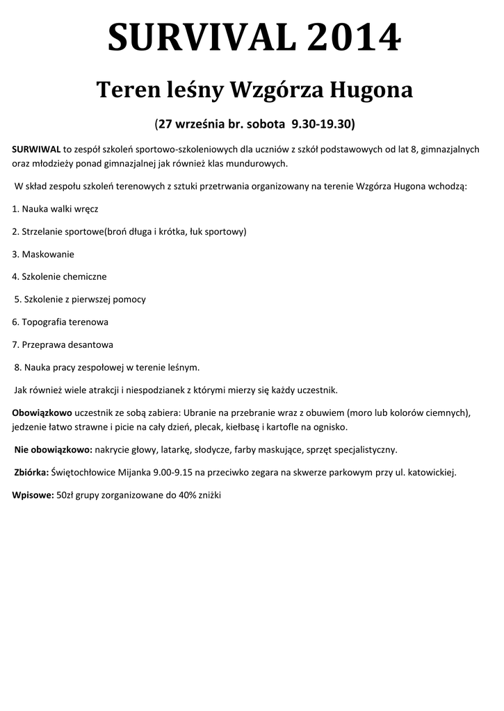 SURVIVAL 2014 Teren leśny Wzgórza Hugona (27 września br. sobota 9.30-19.30) SURWIWAL to zespół szkoleń sportowo-szkoleniowych dla uczniów z szkół podstawowych od lat 8, gimnazjalnych oraz młodzieży ponad gimnazjalnej jak również klas mundurowych. W skład zespołu szkoleń terenowych z sztuki przetrwania organizowany na terenie Wzgórza Hugona wchodzą: 1. Nauka walki wręcz 2. Strzelanie sportowe(broń długa i krótka, łuk sportowy) 3. Maskowanie 4. Szkolenie chemiczne 5. Szkolenie z pierwszej pomocy 6. Topografia terenowa 7. Przeprawa desantowa 8. Nauka pracy zespołowej w terenie leśnym. Jak również wiele atrakcji i niespodzianek z którymi mierzy się każdy uczestnik. Obowiązkowo uczestnik ze sobą zabiera: Ubranie na przebranie wraz z obuwiem (moro lub kolorów ciemnych), jedzenie łatwo strawne i picie na cały dzień, plecak, kiełbasę i kartofle na ognisko. Nie obowiązkowo: nakrycie głowy, latarkę, słodycze, farby maskujące, sprzęt specjalistyczny. Zbiórka: Świętochłowice Mijanka 9.00-9.15 na przeciwko zegara na skwerze parkowym przy ul. katowickiej. Wpisowe: 50zł grupy zorganizowane do 40% zniżki