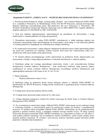 Warszawa 02. 11.2016 Regulamin PAKIETU „STREFA SAUN – WEJŚCIE BEZ OGRANICZENIA CZASOWEGO” 1. Wystawcą Kodu dostępu do usługi, zwanego dalej „Kodem” jest Centrum Medyczne ENEL-MED S.A. z siedzibą w Warszawie, ul. Słomińskiego 19 lok. 524, 00-195 Warszawa, wpisane do Krajowego Rejestru Sądowego prowadzonego przez Sąd Rejonowy dla m.st. Warszawy w Warszawie, XII Wydział Gospodarczy Krajowego Rejestru Sądowego pod nr KRS 0000275255, kapitał zakładowy (kapitał wpłacony) 23.566.900,00 zł, NIP: 5242593360. 2. Kod jest znakiem legitymacyjnym, uprawniającym jej posiadacza do skorzystania z usług medycznych w ramach pakietów do niego przypisanych. 3. Warunkiem skorzystania z usług ENEL-SPORT wchodzących w skład nabytego pakietu jest wykazanie otrzymanego kodu uprawniającego do skorzystania z tych usług, w celu aktywacji pakietu w wybranej placówce znajdującej się wybranej przy zakupie lokalizacji. 4. Po rozpoczęciu korzystania z usług objętych zakupionym pakietem przez osobę uprawnioną pakiet nie może być scedowany do realizacji osobom trzecim. Kod może być wykorzystany tylko raz i użytkowany tylko przez jedną osobę uprawnioną. 5. W ramach pakietu przysługującego osobie uprawnionej na podstawie Kodu, dopuszczalne jest skorzystanie z każdej z usług objętych pakietem w ilościach określonych w zakresie pakietu. 6. Realizacja usługi nie wymaga uprzedniego umówienia wizyty i jest uwarunkowana bieżącą dostępnością Centrum Odnowy Biologicznej – brak możliwości realizacji usług podczas imprez zamkniętych na terenie Centrum Odnowy Biologicznej (weryfikacja możliwa telefonicznie pod ogólnopolskim numerem Call Center nr tel. 22 161 16 16). 7. Pakiet obejmuje: • Wejście jednorazowe open (1 szt.) 8. Realizacji usług na podstawie Kodu można dokonać jedynie w oddziale ENEL-SPORT ul. Myśliwiecka 4a, 00-459 Warszawa. Usługę można zrealizować w godzinach pracy Centrum Odnowy Biologicznej. 9. Z usługi może skorzystać jedynie zdrowa osoba. 10. Z usługi może skorzystać jedna osoba od 16. roku życia. 11. Usługa obejmuje pojedyncze wejście bez limitu czasowego do Strefy Saun w Centrum Odnowy Biologicznej ENEL-SPORT. 12. Po wcześniejszym umówieniu usługi, Oddział ENEL-SPORT zobowiązuje się do realizacji usługi w wybranym terminie, z zastrzeżeniem prawa do możliwości zmiany jej terminu z uzasadnionych przyczyn. W każdym takim przypadku Oddział ENEL-SPORT zobowiązuje się do poinformowania pacjenta o zmianie terminu wizyty, a następnie ustalenia nowego terminu wizyty. W takiej sytuacji Pracownik Recepcji przychodni ENEL-SPORT kontaktuje się z pacjentem na numer tel. lub adres email podane podczas rejestracji, lub na dodatkowe numery kontaktowe, jeżeli zostały podane przez pacjenta podczas rejestracji. W związku z powyższym, podczas rejestracji pacjent powinien podać poprawne i aktualne dane kontaktowe. Strona 1 z 2 Centrum Medyczne ENEL-MED S.A., ul. Słomińskiego 19 lok. 524, 00-195 Warszawa NIP 5242593360, REGON 140802685, KRS 0000275255 (Sąd Rejonowy dla m. st. Warszawy w Warszawie, XII Wydział Gospodarczy KRS). Kapitał zakładowy (kapitał wpłacony) 23.566.900,00 zł Warszawa 02. 11.2016 13. Usługi wchodzące w skład Pakietu objętego Kodem można zrealizować w terminie 1 roku od daty zakupu Kodu. 14. Rabaty związane z Kodem nie łączą się z innymi rabatami i promocjami udzielanymi przez Centrum Medyczne ENEL-MED. S.A. 15. Postanowienia niniejszego Regulaminu określające uprawnienia lub obowiązki Kupującego sprzecznie z prawami Konsumentów wynikającymi z powszechnie obowiązujących przepisów prawa lub też naruszające interesy konsumentów nie dotyczą Konsumentów. Strona 2 z 2 Centrum Medyczne ENEL-MED S.A., ul. Słomińskiego 19 lok. 524, 00-195 Warszawa NIP 5242593360, REGON 140802685, KRS 0000275255 (Sąd Rejonowy dla m. st. Warszawy w Warszawie, XII Wydział Gospodarczy KRS). Kapitał zakładowy (kapitał wpłacony) 23.566.900,00 zł