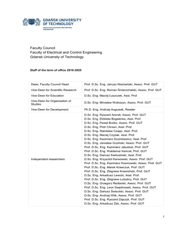 Faculty Council Faculty of Electrical and Control Engineering Gdansk University of Technology Staff of the term of office 2016-2020 Dean, Faculty Council Head Prof. D.Sc. Eng. Janusz Nieznański, Assoc. Prof. GUT Vice-Dean for Scientific Research Prof. D.Sc. Eng. Roman Śmierzchalski, Assoc. Prof. GUT Vice-Dean for Education D.Sc. Eng. Maciej Łuszczek, Asst. Prof. Vice-Dean for Organization of Studies D.Sc. Eng. Mirosław Wołoszyn, Assoc. Prof. GUT Vice-Dean for Development Ph.D. Eng. Andrzej Augusiak, Reader Independent researchers D.Sc. Eng. Ryszard Arendt, Assoc. Prof. GUT D.Sc. Eng. Elżbieta Bogalecka, Asst. Prof. D.Sc. Eng. Paweł Bućko, Assoc. Prof. GUT D.Sc. Eng. Piotr Chrzan, Asst. Prof. D.Sc. Eng. Stanisław Czapp, Asst. Prof. D.Sc. Eng. Maciej Czyżak, Asst. Prof. D.Sc. Eng. Kazimierz Duzinkiewicz, Asst. Prof. D.Sc. Eng. Jarosław Guziński, Assoc. Prof. GUT Prof. D.Sc. Eng. Kazimierz Jakubiuk, Prof. GUT Prof. D.Sc. Eng. Waldemar Kamrat, Prof. GUT D.Sc. Eng. Dariusz Karkosiński, Asst. Prof. D.Sc. Eng. Krzysztof Karwowski, Assoc. Prof. GUT Prof. D.Sc. Eng. Kazimierz Kosmowski, Assoc. Prof. GUT Prof. D.Sc. Eng. Marek Krawczuk, Prof. GUT Prof. D.Sc. Eng. Zbigniew Krzemiński, Prof. GUT D.Sc. Eng. Arkadiusz Lewicki, Asst. Prof. Prof. D.Sc. Eng. Zbigniew Lubośny, Prof. GUT D.Sc. Eng. Grzegorz Redlarski, Assoc. Prof. GUT Prof. D.Sc. Eng. Leon Swędrowski, Assoc. Prof. GUT D.Sc. Eng. Dariusz Świsulski, Assoc. Prof. GUT D.Sc. Eng. Andrzej Wilk, Assoc. Prof. GUT Prof. D.Sc. Eng. Ryszard Zajczyk, Prof. GUT D.Sc. Eng. Arkadiusz Żak, Assoc. Prof. GUT 1 Representatives of other academic teachers Ph.D. Eng. Marek Adamowicz Ph.D. Eng. Anna Golijanek-Jędrzejczyk Ph.D. Eng. Sławomir Judek Ph.D. Eng. Michał Michna Ph.D. Eng. Ireneusz Mosoń Ph.D. Eng. Magdalena Palacz Ph.D. Eng. Jarosław Tarnawski Ph.D. Anna Witkowska Representatives of non-academic staff M.A. Mirosława Kamonciak M.Sc. Eng. Andrzej Kuczyński Halina Kwiatkowska-Kasperowicz Representatives of PhD students M.Sc. Eng. Emilian Piesik Representatives of students Eng. Bartłomiej Cybula Łukasz Józefowicz Tomasz Karczewski Robert Koronkiewicz Marcin Palanis Aleksandr Płotnikow Szymon Potrykus Szymon Witkowski Maximilian Zięba As of 12 September 2016 r. 2