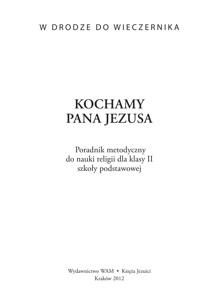 W DRODZE DO WIECZERNIKA Kochamy Pana Jezusa Poradnik metodyczny do nauki religii dla klasy II szkoły podstawowej Wydawnictwo WAM • Księża Jezuici Kraków 2012 Wprowadzenie do pracy z podręcznikiem do nauki religii w szkole podstawowej w klasie drugiej „Kochamy Pana Jezusa” Podręcznik i Zeszyt ucznia (ćwiczenia) Podręcznik i ćwiczenia do klasy 2. pt. „Kochamy Pana Jezusa”, a także poradnik metodyczny, zostały opracowane zgodnie z Programem nauczania religii rzymskokatolickiej w przedszkolach i szkołach Komisji Wychowania Katolickiego Konferencji Episkopatu Polski z 2010 r. Treści i zadania zawarte w tym pakiecie edukacyjnym odwołują się do doświadczeń ucznia z klasy pierwszej, czyli obudzonej świadomości dziecięctwa Bożego oraz relacji nawiązanych ze Stwórcą i Zbawicielem. W klasie drugiej uczeń przejdzie kolejny etap przygotowań do świadomego przyjęcia sakramentów pokuty i pojednania oraz pełnego uczestnictwa w Eucharystii. Autorzy, opracowując treści tego etapu, oparli się na przekonaniu, że katecheza to coś więcej niż nauka – to ukazywanie miłości i wychowywanie do niej. Pierwszym ludzkim „ogniwem” katechezy ma być sam katecheta, który sobą świadczy o Tym, Komu zaufał i powierzył swoje życie. To najpierw przez katechetę uczeń ujrzy Chrystusa. Wtedy owocne będzie zapoznawanie z treścią Ewangelii i samym Jezusem. Przygotowane pomoce mają pomóc katechecie w zapoznaniu ucznia z obecnością i działaniem Jezusa Chrystusa w Kościele: w sakramentach – przede wszystkim w sakramencie pokuty i pojednania oraz w Eucharystii – w bliźnich i w samym katechizowanym. Podręcznik ucznia zawiera 58 jednostek tematycznych ujętych w siedmiu rozdziałach (w Programie nauczania religii jest ich sześć). Zachowując dokładnie kolejne treści Programu, autorzy zmienili istniejące w nim rozdziały. Rozdział 5. Programu podzielili na dwa osobne rozdziały. I tak rozdział 5. w podręczniku dotyczy misterium paschalnego, a rozdział 6. traktuje o sakramentach świętych. Zmodyfikowane zostały także, w stosunku do Programu, niektóre tytuły rozdziałów, które w podręczniku brzmią: 1. Słuchamy słów Boga – Mów, Panie! 2. Odpowiadamy Bogu – Oto ja, poślij mnie 3. Dziękujemy Bogu – dzięki, o Panie 4. Odchodzimy od Boga i powracamy – Przyjmij mnie, Ojcze 5. Spotykamy naszego Zbawiciela – Raduj się, Ziemio 6. Otrzymujemy – Boże dary 7. Dzielimy się – Jak Ty, Panie 5 Podobnie jak w klasie pierwszej katechezy poświęcone przygotowaniu do przeżywania roku liturgicznego włączone są w kompozycję treściową podręcznika. Treści każdego tematu są ujęte na dwóch sąsiadujących stronach. Zachowana została ciągłość graficzna podręcznika i ćwiczeń z klasą pierwszą. Rysunki, zdjęcia i obrazy związane są ściśle z treściami katechezy: dotyczą sytuacji egzystencjalnych ucznia, udziału w liturgii oraz ilustrują teksty biblijne. W podręczniku uczeń znajdzie także pytania problemowe i odnośniki do ćwiczeń z Zeszytu ucznia. Zeszyt ucznia zawiera ćwiczenia, które mają rozbudzić ciekawość ucznia oraz pomóc mu zrozumieć, pogłębić i zapamiętać treści katechezy. Poradnik metodyczny zachował strukturę poradnika z klasy pierwszej. Katecheta znajdzie w nim odpowiedni fragment Programu nauczania religii rzymskokatolickiej w przedszkolach i szkołach oraz materiały do pracy na każdej jednostce tematycznej. Jednostki te opracowane są według schematu: 1. Cele katechezy; 2. Zadania nauczyciela religii; 3. Treści – wymagania szczegółowe; 4. Metody i pomoce; 5. Scenariusz katechezy; 6. Współpraca z rodziną i parafią. Treści zostały ujęte w formule umiejętności (spodziewanych osiągnięć), które ma zdobyć uczeń. Każda jednostka katechetyczna zawiera wskazania, co uczeń powinien wiedzieć, umieć i jakie wartości odkryć (co cenić) po danej katechezie. Katecheta ma też do dyspozycji nagrania muzyczne (śpiewy i muzyka instrumentalna) oraz materiały do wydruku. Scenariusz każdej katechezy składa się z czterech części. Są nimi: Wprowadzenie do katechezy; Odkrywanie wezwania Bożego; Odpowiedź na wezwanie Boże; Utrwalenie. Propozycje zajęć zawierają wiele wskazówek praktycznych, nowych, prostych zabaw, a także opowiadań.