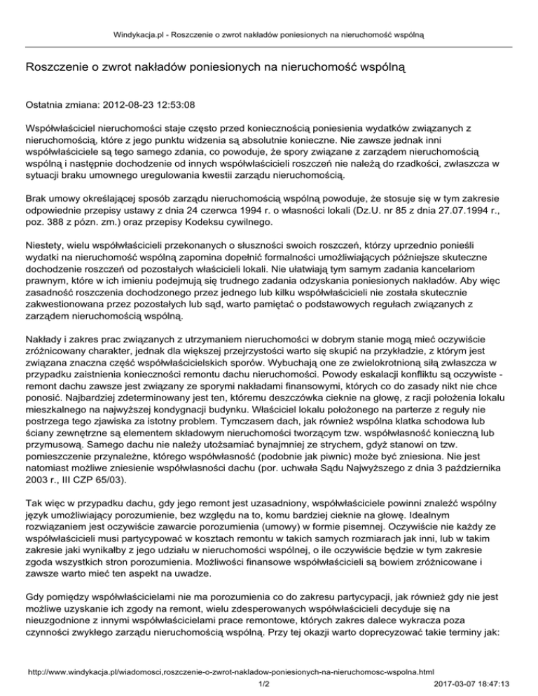 Windykacja.pl - Roszczenie o zwrot nakładów poniesionych na nieruchomość wspólną Roszczenie o zwrot nakładów poniesionych na nieruchomość wspólną Ostatnia zmiana: 2012-08-23 12:53:08 Współwłaściciel nieruchomości staje często przed koniecznością poniesienia wydatków związanych z nieruchomością, które z jego punktu widzenia są absolutnie konieczne. Nie zawsze jednak inni współwłaściciele są tego samego zdania, co powoduje, że spory związane z zarządem nieruchomością wspólną i następnie dochodzenie od innych współwłaścicieli roszczeń nie należą do rzadkości, zwłaszcza w sytuacji braku umownego uregulowania kwestii zarządu nieruchomością. Brak umowy określającej sposób zarządu nieruchomością wspólną powoduje, że stosuje się w tym zakresie odpowiednie przepisy ustawy z dnia 24 czerwca 1994 r. o własności lokali (Dz.U. nr 85 z dnia 27.07.1994 r., poz. 388 z pózn. zm.) oraz przepisy Kodeksu cywilnego. Niestety, wielu współwłaścicieli przekonanych o słuszności swoich roszczeń, którzy uprzednio ponieśli wydatki na nieruchomość wspólną zapomina dopełnić formalności umożliwiających późniejsze skuteczne dochodzenie roszczeń od pozostałych właścicieli lokali. Nie ułatwiają tym samym zadania kancelariom prawnym, które w ich imieniu podejmują się trudnego zadania odzyskania poniesionych nakładów. Aby więc zasadność roszczenia dochodzonego przez jednego lub kilku współwłaścicieli nie została skutecznie zakwestionowana przez pozostałych lub sąd, warto pamiętać o podstawowych regułach związanych z zarządem nieruchomością wspólną. Nakłady i zakres prac związanych z utrzymaniem nieruchomości w dobrym stanie mogą mieć oczywiście zróżnicowany charakter, jednak dla większej przejrzystości warto się skupić na przykładzie, z którym jest związana znaczna część współwłaścicielskich sporów. Wybuchają one ze zwielokrotnioną siłą zwłaszcza w przypadku zaistnienia konieczności remontu dachu nieruchomości. Powody eskalacji konfliktu są oczywiste remont dachu zawsze jest związany ze sporymi nakładami finansowymi, których co do zasady nikt nie chce ponosić. Najbardziej zdeterminowany jest ten, któremu deszczówka cieknie na głowę, z racji położenia lokalu mieszkalnego na najwyższej kondygnacji budynku. Właściciel lokalu położonego na parterze z reguły nie postrzega tego zjawiska za istotny problem. Tymczasem dach, jak również wspólna klatka schodowa lub ściany zewnętrzne są elementem składowym nieruchomości tworzącym tzw. współwłasność konieczną lub przymusową. Samego dachu nie należy utożsamiać bynajmniej ze strychem, gdyż stanowi on tzw. pomieszczenie przynależne, którego współwłasność (podobnie jak piwnic) może być zniesiona. Nie jest natomiast możliwe zniesienie współwłasności dachu (por. uchwała Sądu Najwyższego z dnia 3 października 2003 r., III CZP 65/03). Tak więc w przypadku dachu, gdy jego remont jest uzasadniony, współwłaściciele powinni znaleźć wspólny język umożliwiający porozumienie, bez względu na to, komu bardziej cieknie na głowę. Idealnym rozwiązaniem jest oczywiście zawarcie porozumienia (umowy) w formie pisemnej. Oczywiście nie każdy ze współwłaścicieli musi partycypować w kosztach remontu w takich samych rozmiarach jak inni, lub w takim zakresie jaki wynikałby z jego udziału w nieruchomości wspólnej, o ile oczywiście będzie w tym zakresie zgoda wszystkich stron porozumienia. Możliwości finansowe współwłaścicieli są bowiem zróżnicowane i zawsze warto mieć ten aspekt na uwadze. Gdy pomiędzy współwłaścicielami nie ma porozumienia co do zakresu partycypacji, jak również gdy nie jest możliwe uzyskanie ich zgody na remont, wielu zdesperowanych współwłaścicieli decyduje się na nieuzgodnione z innymi współwłaścicielami prace remontowe, których zakres dalece wykracza poza czynności zwykłego zarządu nieruchomością wspólną. Przy tej okazji warto doprecyzować takie terminy jak: http://www.windykacja.pl/wiadomosci,roszczenie-o-zwrot-nakladow-poniesionych-na-nieruchomosc-wspolna.html 1/2 2017-03-07 18:47:13 Windykacja.pl - Roszczenie o zwrot nakładów poniesionych na nieruchomość wspólną czynności zwykłego zarządu rzeczą wspólną, czynności przekraczające zakres zwykłego zarządu i czynności zachowawcze. Jak stwierdza Sąd Najwyższy w uchwale z dnia 19 kwietnia 2002r. sygn. akt: III CZP 18/02, do czynności zwykłego zarządu zalicza się wszelkie czynności mające na celu utrzymanie rzeczy w dotychczasowym stanie oraz zarządzanie nią dla umożliwienia korzystania z niej i pobierania pożytków. Nie ma jednak ustawowej definicji czynności zwykłego zarządu oraz niemożliwe jest ich wyczerpujące skatalogowanie. Uchwała ta nie rozstrzyga wielu wątpliwości, jednak powszechnie aprobowane jest stanowisko, iż czynnościami zwykłego zarządu są w szczególności bieżące naprawy mające na celu zachowanie rzeczy w stanie niepogorszonym, pobieranie pożytków i przychodów z rzeczy, przy czym nie mogą to być czynności pociągające za sobą nadmierne koszty. Remont dachu, ze względu na jego rozmiary i koszt, jest kwalifikowany jako czynność przekraczająca zakres zwykłego zarządu. Natomiast czynności zachowawcze to takie czynności, jak drobne naprawy lub konserwacja rzeczy wspólnej (Uliasz Marcin Przegląd Sądowy 2004/4/75, Czynności zachowawcze (art. 209 k.c.) w świetle orzecznictwa Sądu Najwyższego). Ci, którzy zdecydowali się na remont bez wymaganej zgody innych współwłaścicieli podejmują nierzadko walkę o odzyskanie części poniesionych wydatków. Walka taka okazuje się w wielu przypadkach bezskuteczna, gdyż nie tylko współwłaściciele ale także sądy niezbyt przychylnie spoglądają na współwłaścicielską samowolkę remontowo-budowlaną. Należy sobie zdawać sprawę z tego, że brak realnego wp