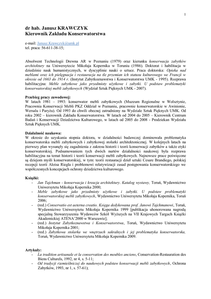 1 dr hab. Janusz KRAWCZYK Kierownik Zakładu Konserwatorstwa e-mail: [email protected] tel. praca: 56-611-38-15; Absolwent Technologii Drewna AR w Poznaniu (1979) oraz kierunku konserwacja zabytków architektury na Uniwersytecie Mikołaja Kopernika w Toruniu (1986). Doktorat i habilitacja w dziedzinie nauk humanistycznych, w dyscyplinie nauki o sztuce. Praca doktorska: Opieka nad meblami oraz ich pielęgnacja i restauracja na tle przemian ich statusu kulturowego we Francji w okresie od 1663 do 1914 r. (Instytut Zabytkoznawstwa i Konserwatorstwa UMK - 1995). Rozprawa habilitacyjna: Meble zabytkowe jako przedmioty użytkowe i zabytki. U podstaw problematyki konserwatorskiej mebli zabytkowych (Wydział Sztuk Pięknych UMK - 2007). Przebieg pracy zawodowej: W latach 1981 – 1993: konserwator mebli zabytkowych (Muzeum Regionalne w Wolsztynie, Pracownia Konserwacji Mebli PKZ Oddział w Poznaniu, pracownie konserwatorskie w Awinionie, Wersalu i Paryżu). Od 1993 do chwili obecnej zatrudniony na Wydziale Sztuk Pięknych UMK. Od roku 2002 – kierownik Zakładu Konserwatorstwa. W latach od 2004 do 2005 – Kierownik Centrum Badań i Konserwacji Dziedzictwa Kulturowego, w latach od 2005 do 2008 - Prodziekan Wydziału Sztuk Pięknych UMK. Działalność naukowa: W okresie do uzyskania stopnia doktora, w działalności badawczej dominowała problematyka konserwatorska mebli zabytkowych i zabytkowej stolarki architektonicznej. W kolejnych latach na pierwszy plan wysunęły się zagadnienia z zakresu historii i teorii konserwacji zabytków a także etyki konserwatorskiej. Podsumowaniem tych dwóch nurtów działalności naukowej była rozprawa habilitacyjna na temat historii i teorii konserwacji mebli zabytkowych. Najnowsze prace poświęcone są dziejom myśli konserwatorskiej, w tym: teorii restauracji dzieł sztuki Cesare Brandiego, polskiej recepcji teorii Aloisa Riegla i problemowi relatywizacji zasad postępowania konserwatorskiego we współczesnych koncepcjach ochrony dziedzictwa kulturowego. Książki: - Jan Tajchman - konserwacja i kreacja architektury. Katalog wystawy, Toruń, Wydawnictwo Uniwersytetu Mikołaja Kopernika 2000; - Meble zabytkowe jako przedmioty użytkowe i zabytki. U podstaw problematyki konserwatorskiej mebli zabytkowych, Wydawnictwo Uniwersytetu Mikołaja Kopernika, Toruń 2006; - (red.) Conservatio est aeterna creatio. Księga dedykowana prof. Janowi Tajchmanowi, Toruń, Wydawnictwo Uniwersytetu Mikołaja Kopernika 1999 [publikacja uhonorowana nagrodą specjalną Stowarzyszenia Wydawców Szkół Wyższych na VII Krajowych Targach Książki Akademickiej ATENA’2000 w Warszawie]; - (red.) Instytut Zabytkoznawstwa i Konserwatorstwa, Toruń, Wydawnictwo Uniwersytetu Mikołaja Kopernika 2001; - (red.) Zabytkowa stolarka we wnętrzach sakralnych i jej problematyka konserwatorska, Toruń, Wydawnictwo Uniwersytetu Mikołaja Kopernika 2009. Artykuły: - La tradition artisanale et la conservation des meubles anciens, Conservation-Restauration des Biens Culturels, 1992, nr 4, s. 5-11; - Od tradycji rzemieślniczej do naukowych podstaw konserwacji mebli zabytkowych, Ochrona Zabytków, 1993, nr 1, s. 57-61); 2 - - - - - Badania naukowe w analizie i konserwacji mebli zabytkowych, Ochrona Zabytków, 1992, nr 1-2, s. 37-41. Etyka i estetyka w konserwacji mebli zabytkowych [w:] I Forum Konserwatorów. Etyka i estetyka, Toruń 1998, s. 123-129; Zasady projektowania i budowy stalli w traktacie André-Jacoba Roubo z 1770 r. [w:] Janusz Krawczyk (red.) Conservatio est aeterna creatio, Toruń, Wydawnictwo Uniwersytetu Mikołaja Kopernika 1999, s. 371-391; Działalność badawcza, projektowa i dydaktyczna prof. Jana Tajchmana w zakresie architektury i jej konserwacji [w:] Janusz Krawczyk (red.) Conservatio est aeterna creatio…, Toruń, Wydawnictwo Uniwersytetu Mikołaja Kopernika 1999, s. 15-25; Prof. Jan Tajchman – konserwacja i kreacja architektury, Przestrzeń – Magazyn Planowania Przestrzennego 2000/2 nr 11, s. 34-37; Cysterskie stalle w Koronowie - ich budowa i funkcje użytkowe, Nasza Przeszłość, 2001, t. 96, s. 299-319; Kryteria oceny mebli dawnych we Francji w XVIII w. [w:], Rozważania o smaku artystycznym, studia pod redakcją Józefa Poklewskiego i Tomasza de Rosset, Wydawnictwo Uniwersytetu Mikołaja Kopernika, Toruń 2003, s. 131-149; Wartości historyczne mebli zabytkowych, Technologia Drewna. Roczniki Akademii Rolniczej w Poznaniu, CCCLXII, 2004 nr 39, s. 70-82; Charakterystyczne cechy zabytkowej stolarki drzwiowej i jej problematyka konserwatorska, [w:] Zabytkowe budowle drewniane i stolarka architektoniczna wobec współczesnych zagrożeń, red. E. Okoń, Toruń 2005, s. 251-270; Substancja zabytkowa czy forma? Wprowadzenie do rozważań o autentyzmie mebli zabytkowych [w:] Problemy muzeów związane z zachowaniem i konserwacją zbiorów, Szreniawa 2006, s. 71-78; Teoria Cesare Brandiego jako przedmiot refleksji historyczno-konserwatorskiej, [w:] Iwona Szmelter, Monika Jadzińska (red.), Sztuka konserwacji i restauracji. The Art of Conservation and Restoration, Warszawa 2007, s. 94-105; Вчера и сегодня теории реставрации [w:] Проблемы реставрации и ислесдований памятников архитектуры, АлексанраКочалковска (red.), Студзенка 2007, s. 15-33. Teoria Aloisa Riegla i jej polska recepcja a problemy współczesnego konserwatorstwa, [w:] Bogusław Szmygin (red.) Współczesne problemy teorii konserwatorskiej w Polsce, Warszawa-Lublin 2008, s. 63-74; A Monument and a work of art. Selected aspects from the theories of Cesare Brandi and Alois Riegl, [w:] Giuseppe Basile (red.), Il pensiero di Cesare Brandi dalla teoria alla pratica. Cesare Brandi’s thought from theory to practice, Roma 2008, s. 234-239; Zabytkowa stolarka kościelna jako przedmiot prac badawczych i konserwatorskich [w:] Janusz Krawczyk (red.) Zabytkowa stolarka we wnętrzach sakralnych i jej problema