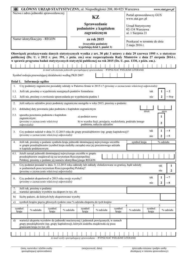 GŁÓWNY URZĄD STATYSTYCZNY, al. Niepodległości 208, 00-925 Warszawa Nazwa i adres jednostki sprawozdawczej KZ Sprawozdanie podmiotów z kapitałem zagranicznym za rok 2015 Numer identyfikacyjny - REGON (wszystkie podmioty wypełniają dział 1, punkt 1) www.stat.gov.pl Portal sprawozdawczy GUS www.stat.gov.pl Urząd Statystyczny 02-134 Warszawa ul. 1 Sierpnia 21 Przekazać w terminie do dnia 2 maja 2016 r. Obowiązek przekazywania danych statystycznych wynika z art. 30 pkt 3 ustawy z dnia 29 czerwca 1995 r. o statystyce publicznej (Dz. U. z 2012 r. poz. 591, z późn. zm.) oraz rozporządzenia Rady Ministrów z dnia 27 sierpnia 2014 r. w sprawie programu badań statystycznych statystyki publicznej na rok 2015 (Dz. U. poz. 1330, z późn. zm.). (e-mail sekretariatu jednostki sporządzającej sprawozdanie – WYPEŁNIAĆ WIELKIMI LITERAMI) Symbol rodzaju przeważającej działalności według PKD 2007 Dział 1. 1. Informacje ogólne Czy podmioty zagraniczne posiadały udziały w Państwa firmie w 2015 r.? (prosimy o zaznaczenie właściwej odpowiedzi) 1.1. Jeśli tak, prosimy o wypełnienie następnych punktów formularza tak 1 →2 1.2. Jeśli nie, prosimy o zwrócenie sprawozdania po wypełnieniu punktu 1 nie 2 → Stop 2. Jeśli nabycie udziałów przez podmioty zagraniczne nastąpiło w roku 2015, prosimy o podanie: 2.1. dokładnej daty powstania jako podmiotu z kapitałem zagranicznym 2.2. sposobu powstania podmiotu z kapitałem zagranicznym: (prosimy o zaznaczenie właściwej odpowiedzi) 3. 4. 4.1. 5. 6. dzień mies. a) podmiot nowy 1 b) w wyniku fuzji, przejęcia, wydzielenia, podziału innego podmiotu, nabycia udziałów 2 Czy podmiot należał w dniu 31.12.2015 roku do grupy przedsiębiorstw (np. grupy kapitałowej)? (prosimy o zaznaczenie właściwej odpowiedzi) Jeśli tak, prosimy o podanie symbolu kraju jednostki dominującej najwyższego szczebla w grupie przedsiębiorstw (symbol kraju siedziby zarządu) oraz jej procentowego udziału w kapitale podstawowym tak 1 →4 nie 2 →5 % udziału symbol kraju Jeżeli zarząd jednostki dominującej najwyższego szczebla w grupie przedsiębiorstw znajdował się na terytorium Rzeczypospolitej Polskiej, prosimy o podanie jej numeru identyfikacyjnego REGON Czy podmiot posiadał w dniu 31.12.2015 roku oddziały lub zakłady zlokalizowane za granicą, bądź udziały w podmiotach poza terytorium Rzeczypospolitej Polskiej? (prosimy o zaznaczenie właściwej odpowiedzi) Czy podmiot eksportował w 2015 roku swoje wyroby? (prosimy o zaznaczenie właściwej odpowiedzi) 7. a) Jeśli tak, prosimy o podanie: wartości sprzedaży wyrobów na eksport (w tys. zł) b) liczby państw, do których były eksportowane wyroby symboli krajów pięciu głównych rynków oraz % udziału eksportu do tych krajów 1 2 3 symbol symbol symbol symbol % udziału % udziału % udziału kraju kraju kraju kraju tak 1 nie 2 tak 1 →7 nie 2 →8 c) d) 4 5 % udziału symbol kraju % udziału wartości eksportu wyrobów do jednostki macierzystej i jednostek powiązanych, w ramach grupy przedsiębiorstw (np. grupy kapitałowej), których siedziba znajdowała się poza granicami kraju (w tys. zł) (e-mail osoby sporządzającej sprawozdanie – WYPEŁNIAĆ WIELKIMI LITERAMI) (imię, nazwisko i telefon osoby sporządzającej sprawozdanie) (miejscowość, data) (pieczątka imienna i podpis osoby działającej w imieniu sprawozdawcy) 8. Czy podmiot eksportował w 2015 roku swoje usługi? (prosimy o zaznaczenie właściwej odpowiedzi) 9. Jeśli tak, prosimy o podanie: a) wartości sprzedaży usług na eksport (w tys. zł) b) liczby państw, do których były eksportowane usługi symboli krajów pięciu głównych rynków oraz % udziału eksportu do tych krajów 1 2 3 symbol symbol symbol symbol % udziału % udziału % udziału kraju kraju kraju kraju tak 1 → 9 nie 2 → 10 c) d) wartości eksportu usług do jednostki macierzystej i jednostek powiązanych, w ramach grupy przedsiębiorstw (np. grupy kapitałowej), których siedziba znajdowała się poza granicami kraju (w tys. zł) 10. Czy podmiot eksportował w 2015 roku towary lub materiały? (prosimy o zaznaczenie właściwej odpowiedzi) 11. a) b) 4 5 % udziału symbol kraju % udziału tak 1 → 11 nie 2 → 12 Jeśli tak, prosimy o podanie: wartości sprzedaży towarów i materiałów na eksport (w tys. zł) liczby państw, do których były eksportowane towary i materiały symboli krajów pięciu głównych rynków oraz % udziału eksportu do tych krajów 1 2 3 symbol symbol symbol symbol % udziału % udziału % udziału kraju kraju kraju kraju c) d) wartości eksportu towarów i materiałów do jednostki macierzystej i jednostek powiązanych, w ramach grupy przedsiębiorstw (np. grupy kapitałowej), których siedziba znajdowała się poza granicami kraju (w tys. zł) 12. Czy podmiot dokonywał w 2015 roku zakupów z importu? (prosimy o zaznaczenie właściwej odpowiedzi) 4 5 % udziału symbol kraju % udziału tak 1 → 13 nie 2 → 14 tak 1 → 15 nie 2 → 16 tak 1 → 17 nie 2 → dział 2 13. Jeśli tak, prosimy o podanie: 13.1. wartości zakupów z importu ogółem (w tys. zł) w tym: a) import surowców, materiałów i półfabrykatów przeznaczonych na cele produkcyjne b) import towarów przeznaczonych do dalszej odsprzedaży c) import usług d) import środków trwałych z wartości 13.1 przypada na: 13.2. wartość importu od jednostki macierzystej i jednostek powiązanych w ramach grupy przedsiębiorstw (np. grupy kapitałowej) 14. Czy podmiot poniósł w 2015 r. nakłady na pozyskanie aktywów trwałych w Polsce? (prosimy o zaznaczenie właściwej odpowiedzi) 15. Jeśli tak, prosimy o podanie wartości nakładów poniesionych w Polsce w 2015 r. 16. Czy podmiot poniósł w 2015 r. nakłady na pozyskanie aktywów trwałych zlokalizowanych i pozostających za granicą (nie uwzględniając importu)? (prosimy o zaznaczenie właściwej odpowiedzi) 17. Jeśli tak, prosimy o podanie wartości nakładów poniesionych z