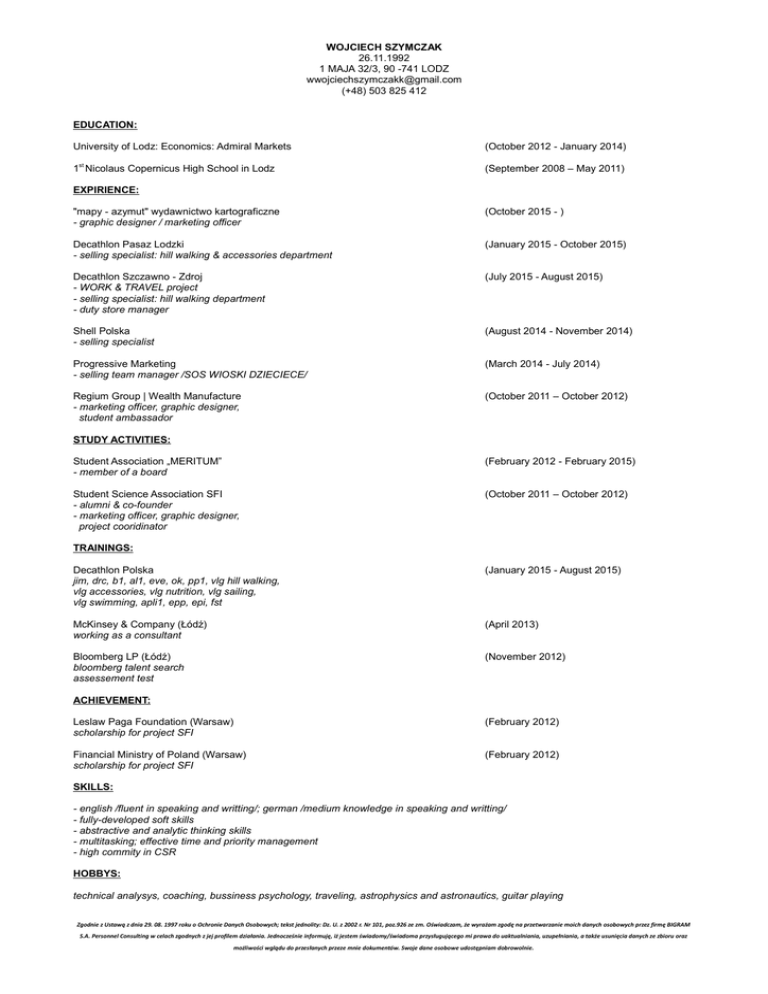WOJCIECH SZYMCZAK 26.11.1992 1 MAJA 32/3, 90 -741 LODZ [email protected] (+48) 503 825 412 EDUCATION: University of Lodz: Economics: Admiral Markets (October 2012 - January 2014) 1st Nicolaus Copernicus High School in Lodz (September 2008 – May 2011) EXPIRIENCE: "mapy - azymut" wydawnictwo kartograficzne - graphic designer / marketing officer (October 2015 - ) Decathlon Pasaz Lodzki - selling specialist: hill walking & accessories department (January 2015 - October 2015) Decathlon Szczawno - Zdroj - WORK & TRAVEL project - selling specialist: hill walking department - duty store manager (July 2015 - August 2015) Shell Polska - selling specialist (August 2014 - November 2014) Progressive Marketing - selling team manager /SOS WIOSKI DZIECIECE/ (March 2014 - July 2014) Regium Group | Wealth Manufacture - marketing officer, graphic designer, student ambassador (October 2011 – October 2012) STUDY ACTIVITIES: Student Association „MERITUM” - member of a board (February 2012 - February 2015) Student Science Association SFI - alumni & co-founder - marketing officer, graphic designer, project cooridinator (October 2011 – October 2012) TRAININGS: Decathlon Polska jim, drc, b1, al1, eve, ok, pp1, vlg hill walking, vlg accessories, vlg nutrition, vlg sailing, vlg swimming, apli1, epp, epi, fst (January 2015 - August 2015) McKinsey & Company (Łódź) working as a consultant (April 2013) Bloomberg LP (Łódź) bloomberg talent search assessement test (November 2012) ACHIEVEMENT: Leslaw Paga Foundation (Warsaw) scholarship for project SFI (February 2012) Financial Ministry of Poland (Warsaw) scholarship for project SFI (February 2012) SKILLS: - english /fluent in speaking and writting/; german /medium knowledge in speaking and writting/ - fully-developed soft skills - abstractive and analytic thinking skills - multitasking; effective time and priority management - high commity in CSR HOBBYS: technical analysys, coaching, bussiness psychology, traveling, astrophysics and astronautics, guitar playing Zgodnie z Ustawą z dnia 29. 08. 1997 roku o Ochronie Danych Osobowych; tekst jednolity: Dz. U. z 2002 r. Nr 101, poz.926 ze zm. Oświadczam, że wyrażam zgodę na przetwarzanie moich danych osobowych przez firmę BIGRAM S.A. Personnel Consulting w celach zgodnych z jej profilem działania. Jednocześnie informuję, iż jestem świadomy/świadoma przysługującego mi prawa do uaktualniania, uzupełniania, a także usunięcia danych ze zbioru oraz możliwości wglądu do przesłanych przeze mnie dokumentów. Swoje dane osobowe udostępniam dobrowolnie.