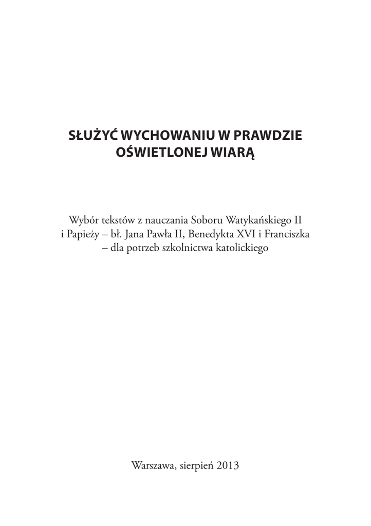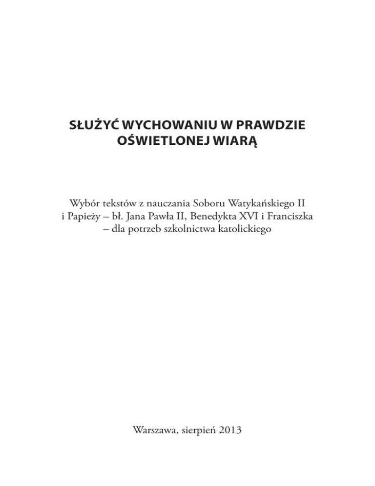 Służyć wychowaniu w prawdzie oświetlonej wiarą Wybór tekstów z nauczania Soboru Watykańskiego II i Papieży – bł. Jana Pawła II, Benedykta XVI i Franciszka – dla potrzeb szkolnictwa katolickiego Warszawa, sierpień 2013 Spis treści Wybór tekstów: s. Maksymiliana Wojnar, we współpracy z: s. Patrycja Garbacka, Agnieszka Skibicka Wydano staraniem Rady Szkół Katolickich z udziałem środków Renovabis Do użytku wewnętrznego szkół katolickich Tekst w wersji elektronicznej dostępny na stronie internetowej www.rsk.edu.pl ISBN 978-83-7864-380-7 Wydawnictwo AA ul. Swoboda 4 30-332 Kraków www.religijna.pl, [email protected] Rada Szkół Katolickich Skwer Kard. S. Wyszyńskiego 6 01-015 Warszawa www.rsk.edu.pl, [email protected] Wprowadzenie . . . . . . . . . . . . . . . . . . . . . . . . . . . . . . . . . . . . . . . . . . . . . . . . . . . . . . 7 Wrzesień WIARA I KULTURA . . . . . . . . . . . . . . . . . . . . . . . . . . . . . . . . . . . . 9 W rzeczywistości przenikania się kultur i religii . . . . . . . . . . . . . . . . 11 Człowiek żyje prawdziwie ludzkim życiem dzięki kulturze . . . . . . . . 11 By Ewangelia mogła przeniknąć w duszę kultury . . . . . . . . . . . . . . . 15 Szkoła wprowadza w dziedzictwo kultury . . . . . . . . . . . . . . . . . . . . . 18 Kultura straciła zdolność dostrzegania obecności Boga . . . . . . . . . . . 19 Trwajcie mocni w wierze . . . . . . . . . . . . . . . . . . . . . . . . . . . . . . . . . 20 Październik WIARA I ROZUM . . . . . . . . . . . . . . . . . . . . . . . . . . . . . . . . . . . . 23 „Człowiek jest sobą przez prawdę” . . . . . . . . . . . . . . . . . . . . . . . . . . 25 Wiara jest uczestnictwem w sposobie patrzenia Jezusa . . . . . . . . . . . 27 Aby poznawanie świata oświetlone było wiarą . . . . . . . . . . . . . . . . . 28 Możemy wychowywać z Chrystusem – dzięki sakramentom . . . . . . 31 Listopad WIARA I PRAWDA . . . . . . . . . . . . . . . . . . . . . . . . . . . . . . . . . . . 35 Świadectwo świętych żywym objawieniem Chrystusa . . . . . . . . . . . . 37 Spotkanie z Chrystusem rozjaśnia życie i zobowiązuje . . . . . . . . . . . 39 Dzielić się doświadczeniem Chrystusa – nowa ewangelizacja . . . . . . 40 Wychowywać do poznania prawdy . . . . . . . . . . . . . . . . . . . . . . . . . . 41 3 Szkoła katolicka miejscem spotkania z żyjącym Bogiem . . . . . . . . . . 43 Człowiek potrzebuje poznania, potrzebuje prawdy (…) Wiara bez prawdy nie zbawia . . . . . . . . . . . . . . . . . . . . . . . . . . . . . . 45 Prawda i przebaczenie w procesie kształcenia i wychowania – Jan Paweł II, Benedykt XVI . . . . . . . . . . . . . . . . . . . . . . . . . . . . . 46 Marzec Nie pragnijmy takiej Polski, która by nas nic nie kosztowała . . . . . . 50 Kwiecień Mówię, bo obowiązuje mnie prawda . . . . . . . . . . . . . . . . . . . . . . . . . . . 46 Przebaczamy i prosimy o przebaczenie . . . . . . . . . . . . . . . . . . . . . . . . . . 47 Przybyć tu musiałem. Był to i jest obowiązek wobec prawdy, wobec tych, którzy tu cierpieli, obowiązek wobec Boga . . . . . . . . . . . . . 48 Grudzień PRAWDA O CZŁOWIEKU . . . . . . . . . . . . . . . . . . . . . . . . . . . . . . 53 Chrystus objawia w pełni człowieka samemu człowiekowi . . . . . . . . 55 Prawda o człowieku jest podstawą wychowania i formacji . . . . . . . . 55 Człowiek drogą Kościoła (także szkoły) . . . . . . . . . . . . . . . . . . . . . . 57 Aby dążyć do pełnego rozwoju . . . . . . . . . . . . . . . . . . . . . . . . . . . . . 60 Wychowywać do wiary dojrzałej . . . . . . . . . . . . . . . . . . . . . . . . . . . . 61 Styczeń WIARA I MIŁOŚĆ . . . . . . . . . . . . . . . . . . . . . . . . . . . . . . . . . . . . 65 Bez Chrystusa „nic nie możemy uczynić” (por. J 15, 5) . . . . . . . . . . 67 Zakosztowanie Prawdy otwiera oczy . . . . . . . . . . . . . . . . . . . . . . . . . 68 Światło miłości, (…) może rozjaśnić pytania o prawdę . . . . . . . . . . . 70 Wiara w Chrystusa objawia się przez miłość . . . . . . . . . . . . . . . . . . . 71 Jan Paweł II – Świadek Chrystusa . . . . . . . . . . . . . . . . . . . . . . . . . . . 72 Eucharystia kształtuje, daje siłę wewnętrzną . . . . . . . . . . . . . . . . . . . 73 Luty 4 KOŚCIÓŁ JEST MATKĄ UCZĄCĄ NAS MÓWIĆ JĘZYKIEM WIARY . 75 Kościół „sakramentem” jedności, domem, wspólnotą . . . . . . . . . . . . 77 Kościół – Matka naszej wiary . . . . . . . . . . . . . . . . . . . . . . . . . . . . . . 78 Kościół żyje, (…) i rozwija się w duszach . . . . . . . . . . . . . . . . . . . . . 82 Musicie być mocni (…) mocą (…) wiary, nadziei i miłości . . . . . . . 83 Aby (…) trwać w wyznawaniu wiary (…) potrzebujecie Kościoła . . . . 84 TAJEMNICA ODKUPIENIA . . . . . . . . . . . . . . . . . . . . . . . . . . . . . 87 Aby na nowo ukazać człowiekowi oblicze Ojca, Jezus musiał (…) obarczyć się nawet „obliczem” grzechu . . . . . . . . . . . . . . . . . . . . . . . 89 Cierpienie w świetle spojrzenia Chrystusa . . . . . . . . . . . . . . . . . . . . 90 Bóg jest Miłością . . . . . . . . . . . . . . . . . . . . . . . . . . . . . . . . . . . . . . . 90 Aby służyć z taką miłością jak Bóg . . . . . . . . . . . . . . . . . . . . . . . . . . 93 Nauka zawarta w męce Chrystusa . . . . . . . . . . . . . . . . . . . . . . . . . . 94 MIŁOSIERDZIE . . . . . . . . . . . . . . . . . . . . . . . . . . . . . . . . . . . . . . 97 Miłość sercem Kościoła . . . . . . . . . . . . . . . . . . . . . . . . . . . . . . . . . . 99 Eucharystia i Pojednanie . . . . . . . . . . . . . . . . . . . . . . . . . . . . . . . . 100 Eucharystia – uczta, ofiara, nadzieja . . . . . . . . . . . . . . . . . . . . . . . . 102 Wyobraźnia miłosierdzia . . . . . . . . . . . . . . . . . . . . . . . . . . . . . . . . 103 Czynić miłosierdzie . . . . . . . . . . . . . . . . . . . . . . . . . . . . . . . . . . . . 104 Uka