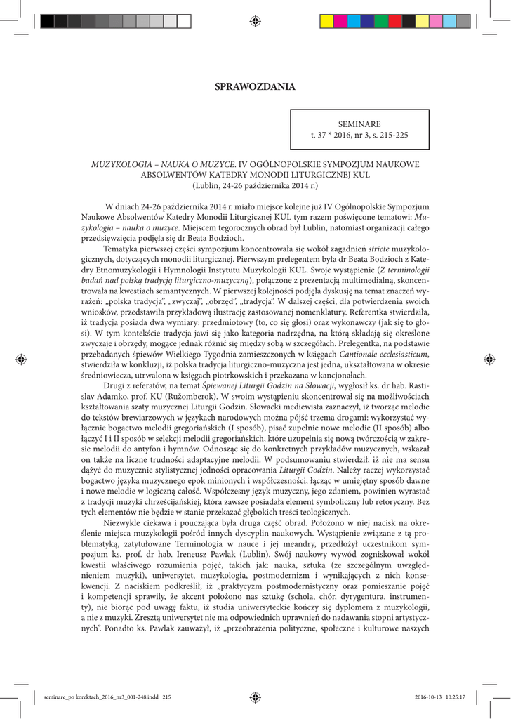 SPRAWOZDANIA SEMINARE t. 37 * 2016, nr 3, s. 215-225 MUZYKOLOGIA – NAUKA O MUZYCE. IV OGÓLNOPOLSKIE SYMPOZJUM NAUKOWE ABSOLWENTÓW KATEDRY MONODII LITURGICZNEJ KUL (Lublin, 24-26 października 2014 r.) W dniach 24-26 października 2014 r. miało miejsce kolejne już IV Ogólnopolskie Sympozjum Naukowe Absolwentów Katedry Monodii Liturgicznej KUL tym razem poświęcone tematowi: Muzykologia – nauka o muzyce. Miejscem tegorocznych obrad był Lublin, natomiast organizacji całego przedsięwzięcia podjęła się dr Beata Bodzioch. Tematyka pierwszej części sympozjum koncentrowała się wokół zagadnień stricte muzykologicznych, dotyczących monodii liturgicznej. Pierwszym prelegentem była dr Beata Bodzioch z Katedry Etnomuzykologii i Hymnologii Instytutu Muzykologii KUL. Swoje wystąpienie (Z terminologii badań nad polską tradycją liturgiczno-muzyczną), połączone z prezentacją multimedialną, skoncentrowała na kwestiach semantycznych. W pierwszej kolejności podjęła dyskusję na temat znaczeń wyrażeń: „polska tradycja”, „zwyczaj”, „obrzęd”, „tradycja”. W dalszej części, dla potwierdzenia swoich wniosków, przedstawiła przykładową ilustrację zastosowanej nomenklatury. Referentka stwierdziła, iż tradycja posiada dwa wymiary: przedmiotowy (to, co się głosi) oraz wykonawczy (jak się to głosi). W tym kontekście tradycja jawi się jako kategoria nadrzędna, na którą składają się określone zwyczaje i obrzędy, mogące jednak różnić się między sobą w szczegółach. Prelegentka, na podstawie przebadanych śpiewów Wielkiego Tygodnia zamieszczonych w księgach Cantionale ecclesiasticum, stwierdziła w konkluzji, iż polska tradycja liturgiczno-muzyczna jest jedna, ukształtowana w okresie średniowiecza, utrwalona w księgach piotrkowskich i przekazana w kancjonałach. Drugi z referatów, na temat Śpiewanej Liturgii Godzin na Słowacji, wygłosił ks. dr hab. Rastislav Adamko, prof. KU (Ružomberok). W swoim wystąpieniu skoncentrował się na możliwościach kształtowania szaty muzycznej Liturgii Godzin. Słowacki mediewista zaznaczył, iż tworząc melodie do tekstów brewiarzowych w językach narodowych można pójść trzema drogami: wykorzystać wyłącznie bogactwo melodii gregoriańskich (I sposób), pisać zupełnie nowe melodie (II sposób) albo łączyć I i II sposób w selekcji melodii gregoriańskich, które uzupełnia się nową twórczością w zakresie melodii do antyfon i hymnów. Odnosząc się do konkretnych przykładów muzycznych, wskazał on także na liczne trudności adaptacyjne melodii. W podsumowaniu stwierdził, iż nie ma sensu dążyć do muzycznie stylistycznej jedności opracowania Liturgii Godzin. Należy raczej wykorzystać bogactwo języka muzycznego epok minionych i współczesności, łącząc w umiejętny sposób dawne i nowe melodie w logiczną całość. Współczesny język muzyczny, jego zdaniem, powinien wyrastać z tradycji muzyki chrześcijańskiej, która zawsze posiadała element symboliczny lub retoryczny. Bez tych elementów nie będzie w stanie przekazać głębokich treści teologicznych. Niezwykle ciekawa i pouczająca była druga część obrad. Położono w niej nacisk na określenie miejsca muzykologii pośród innych dyscyplin naukowych. Wystąpienie związane z tą problematyką, zatytułowane Terminologia w nauce i jej meandry, przedłożył uczestnikom sympozjum ks. prof. dr hab. Ireneusz Pawlak (Lublin). Swój naukowy wywód zogniskował wokół kwestii właściwego rozumienia pojęć, takich jak: nauka, sztuka (ze szczególnym uwzględnieniem muzyki), uniwersytet, muzykologia, postmodernizm i wynikających z nich konsekwencji. Z naciskiem podkreślił, iż „praktycyzm postmodernistyczny oraz pomieszanie pojęć i kompetencji sprawiły, że akcent położono nas sztukę (schola, chór, dyrygentura, instrumenty), nie biorąc pod uwagę faktu, iż studia uniwersyteckie kończy się dyplomem z muzykologii, a nie z muzyki. Zresztą uniwersytet nie ma odpowiednich uprawnień do nadawania stopni artystycznych”. Ponadto ks. Pawlak zauważył, iż „przeobrażenia polityczne, społeczne i kulturowe naszych seminare_po korektach_2016_nr3_001-248.indd 215 2016-10-13 10:25:17 216 SPRAWOZDANIA czasów nie sprzyjają naukom humanistycznym, które wobec agresywnego pragmatyzmu zostały odsunięte w cień, na rzecz nauk ścisłych i przyrodniczych. Jaskrawym tego przykładem jest organizowany co roku tzw. festiwal nauki, który obejmuje głównie nauki doświadczalne (fizyka, matematyka, astronomia, biologia, geografia), informując o osiągnięciach w tych dziedzinach, zwracając uwagę na odkrycia, patenty itp., a nie na postęp myśli. Zapomniano przy tym, że przyczyną sprawczą nauk ścisłych jest właśnie myśl humanistyczna. Nauki ścisłe są bowiem narzędziami, środkami, a nie celami samymi w sobie”. Swoje wystąpienie zakończył apelem, iż w tej nowej rzeczywistości musimy się odnajdywać i tam, gdzie to możliwe, bronić nauki oraz przywracać właściwe rozumienie pojęć i poprawne używanie terminologii. Podsumowaniem całości obrad była ożywiona, merytoryczna dyskusja. Dotyczyła ona przede wszystkim miejsca muzykologii na uniwersytetach polskich i słowackich oraz szczegółowych problemów, które podjęli w swych przedłożeniach referenci. Spotkanie, obok warstwy naukowej, zostało pieczołowicie przygotowane od strony liturgicznej. Połączone było bowiem ze sprawowaniem każdego dnia uroczystych liturgii eucharystycznych i Nieszporów. Podczas celebrowanych Mszy św. wykorzystano obficie repertuar gregoriański oraz monodyczne śpiewy w języku ludowym rodzimych kompozytorów. Z kolei w wieczornej modlitwie Kościoła posłużono się w znacznej mierze melodiami napisanymi przez absolwentów Katedry Monodii Liturgicznej IM KUL. Miejscem wszystkich celebracji liturgicznych była kaplica akademicka KUL przy ul. Niecałej 8. Stałym już elementem sympo