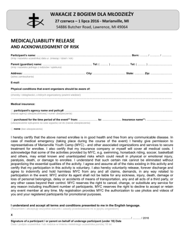 WAKACJE Z BOGIEM DLA MŁODZIEŻY 27 czerwca – 1 lipca 2016 - Marianville, MI 54886 Butcher Road, Lawrence, MI 49064 MEDICAL/LIABILITY RELEASE AND ACKNOWLEDGMENT OF RISK Participant’s name: …………………………………………………………………………………………… Born: ……... / ……..… / ….……. (imię i nazwisko uczestnika) data ur. (miesiąc / dzień / rok) Parent (guardian) name: ………………………………………………. Tel: ( ……… ) ………………… Tel: ( ……… ) ……….…………….. (imię i nazwisko jednego z rodziców / opiekuna) Address: …………………………………………………………… City: ……………………………… State: …..…… Zip: …………..………. (adres zamieszkania) E-mail: ……….……....…………………………………………………………………………………………..…………………………………….… Physical conditions that event organizers should be aware of: ..…..…………….…………………………………………..……………………………………………………………………………………………... (choroby i dolegliwości, o których organizatorzy powinni wiedzieć) ...................................................................................................................................................................................................................... Medical insurance: participant's agency name and policy#: ……………………………………………………………………….………….…………............... (nazwa agencji ubezpieczeniowej i numer ubezpieczenia) purchased for the time period of the event** from: ………………… to: ………………… Insurance name**: …….........….......…… (ubezpieczenie wykupione na czas wyjazdu) od do (nazwa ubezpieczenia) none (bez ubezpieczenia) I hereby certify that the above named enrollee is in good health and free from any communicable disease. In case of medical emergency (taking place during the course of the event) I hereby give permission to representatives of Marianville Youth Camp (MYC) - and other associated organizations and services to secure treatment for enrollee. I also certify that my insurance company or myself will cover all medical costs. I acknowledge that some of the activities provided by MYC, e.g. swimming, horseback riding, soccer, basketball and others, may entail known and unanticipated risks which could result in physical or emotional injury, paralysis, death, or damage to enrollee. I understand that such certain risk cannot be eliminated without jeopardizing the essential qualities of the activity. I agree and assume all of the risks existing in this activity and certify that my participation in this activity is voluntary. I also hereby voluntarily release, forever discharge and agree to indemnify and hold harmless MYC from any and all claims, demands, in any way related to participation in the event. MYC and/or its agent shall not be liable for any sickness, injury, death, damage or loss of personal belongings, delay or accidents of means of transportation, any and all acts of a third party, or any other cases beyond their control. MYC reserves the right to cancel, change, or substitute any service for any reason including insufficient number of participants. MYC reserves the right to decline to accept or retain any event member at any time. My registration provides MYC the authorization to use photos and videos of you and your registered participants for promotional purposes. I understand and accept all terms and conditions presented to me in the English language. (Rozumiem i akceptuję wszystkie warunki i zasady przedstawione mi w języku angielskim) X …...............................................................………..........................................................……....................... ……… / ……… / 2016 Signature of a participant / or parent on behalf of underage participant (under 18) Date Data i podpis uczestnika / lub rodzica w imieniu nieletniego uczestnika poniżej 18 lat