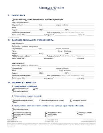 I. DANE KLIENTA □ osoba fizyczna □ osoba prawna lub inna jednostka organizacyjna Imię i Nazwisko/Nazwa:____________________________________________________________________________ Obywatelstwo*: _________________ Kraj: _______________ Miejsce urodzenia: _____________________________ Adres: _________________________________________________________________________________________ Regon*: ________________________ KRS*: ________________________ NIP*: _____________________________ PESEL lub data urodzenia*: _________________ Rodzaj dokumentu*: DO / DT/ PA/ Karta Pobytu/ inny____________ Seria i numer dok.*: ____________________ wydany przez*: __________________________ ważny do: __________ (*) jeśli dotyczy II. DANE OSÓB DZIAŁAJĄCYCH W IMIENIU KLIENTA Imię i Nazwisko:_________________________________________________________________________________ Stanowisko / podstawa umocowania: _________________________________________________________________ Obywatelstwo: _________________ Kraj: _______________ Miejsce urodzenia: _____________________________ Adres: ____________________________________________ Urząd Skarbowy:___________________________ Regon*: ________________________ KRS*: ________________________ NIP*: _____________________________ PESEL lub data urodzenia*: _________________ Rodzaj dokumentu*: DO / DT/ PA/ Karta Pobytu/ inny____________ Seria i numer dok.*: ____________________ wydany przez*: __________________________ ważny do: __________ Imię i Nazwisko:_________________________________________________________________________________ Stanowisko / podstawa umocowania: _________________________________________________________________ Obywatelstwo: _________________ Kraj: _______________ Miejsce urodzenia: _____________________________ Adres: _______________________________________________ Urząd Skarbowy:___________________________ Regon*: ________________________ KRS*: ________________________ NIP*: _____________________________ PESEL lub data urodzenia*: _________________ Rodzaj dokumentu*: DO / DT/ PA/ Karta Pobytu/ inny____________ Seria i numer dok.*: ____________________ wydany przez*: __________________________ ważny do: __________ III. INFORMACJE O INWESTYCJI 1. Proszę wskazać cel inwestycji: pomnażanie kapitału inny ________________________________________________________________ odmawiam podania 2. Proszę wskazać horyzont inwestycji: krótkookresowy (do 1 roku) długookresowy (powyżej 1 roku) odmawiam podania inny ________________________________________________________________________________________ 3. Proszę wskazać źródło pochodzenia środków (można zaznaczyć więcej niż jedną odpowiedź): odmawiam podania wynagrodzenie za pracę emerytura lub renta dochody z majątku sprzedaż nieruchomości oszczędności kredyt darowizna spadek inne________________________________________________________________________________________ 4. Czy klient reprezentuje jedną z wymienionych grup? odmawiam podania branża paliwowa branża antykwaryczna recykling pracownicy ambasady żegluga pełnomorska przemysł zbrojeniowy inne (proszę podać reprezentowaną branżę lub wykonywany zawód, nazwę pracodawcy) branża jubilerska branża hazardowa _______________________________________________________________________________________________ IV. OŚWIADCZENIE W SPRAWIE BENEFICJENTA RZECZYWISTEGO1 odmawiam podania beneficjentem rzeczywistym jest Klient beneficjent rzeczywisty nie jest mi znany osoba fizyczna 1 inna niż Klient: Imię: _________________________ Nazwisko: ______________________ Obywatelstwo: ______________________ Kod kraju: __________ PESEL lub data urodzenia: ____________________ Seria i numer dok. tożsamości.: ________ ważny do: ________ Adres zameldowania _____________________________________________________________ osoba nie będąca podatnikiem USA2 osoba będąca podatnikiem USA2 i posiadająca następujący Tax Identyfication Nuber osoba fizyczna 2 inna niż Klient: Imię: _________________________ Nazwisko: ______________________ Obywatelstwo: ______________________ Kod kraju: __________ PESEL lub data urodzenia: ____________________ Seria i numer dok. tożsamości.: ________ ważny do: ________ Adres zameldowania _____________________________________________________________ osoba nie będąca podatnikiem USA2 osoba będąca podatnikiem USA2 i posiadająca następujący Tax Identyfication Nuber osoba fizyczna 3 inna niż Klient: Imię: _________________________ Nazwisko: ______________________ Obywatelstwo: ______________________ Kod kraju: __________ PESEL lub data urodzenia: ____________________ Seria i numer dok. tożsamości.: ________ ważny do: ________ Adres zameldowania _____________________________________________________________ osoba nie będąca podatnikiem USA2 osoba będąca podatnikiem USA2 i posiadająca następujący Tax Identyfication Nuber osoba fizyczna 4 inna niż Klient: Imię: _________________________ Nazwisko: ______________________ Obywatelstwo: ______________________ Kod kraju: __________ PESEL lub data urodzenia: ____________________ Seria i numer dok. tożsamości.: ________ ważny do: ________ Adres zameldowania _____________________________________________________________ osoba nie będąca podatnikiem USA2 osoba będąca podatnikiem USA2 i posiadająca następujący Tax Identyfication Nuber V. OŚWIADCZENIE FATCA2 Pod rygorem odpowiedzialności karnej za podanie danych niezgodnych ze stanem faktycznym, oświadczam, że jestem (można wybrać tylko jedną odpowiedź): osoba fizyczna nie jestem podatnikiem USA jestem podatnikiem USA i posiadam następujący Tax Identyfication Nuber osoba prawa lub inna jednostka organizacyjna podatnik USA (będący szczególną Osobą Amerykańską) Tax Identyfication Nuber podatnik USA (nie będący szczególną Osobą Amerykańską) raportującą/uczestniczącą Instytucją Finansową z następującym nr GIIN podmiotem niefinansowym z siedzibą poza USA o aktywnych dochod