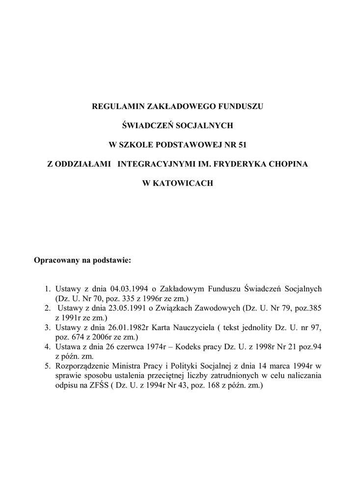 REGULAMIN ZAKŁADOWEGO FUNDUSZU ŚWIADCZEŃ SOCJALNYCH W SZKOLE PODSTAWOWEJ NR 51 Z ODDZIAŁAMI INTEGRACYJNYMI IM. FRYDERYKA CHOPINA W KATOWICACH Opracowany na podstawie: 1. Ustawy z dnia 04.03.1994 o Zakładowym Funduszu Świadczeń Socjalnych (Dz. U. Nr 70, poz. 335 z 1996r ze zm.) 2. Ustawy z dnia 23.05.1991 o Związkach Zawodowych (Dz. U. Nr 79, poz.385 z 1991r ze zm.) 3. Ustawy z dnia 26.01.1982r Karta Nauczyciela ( tekst jednolity Dz. U. nr 97, poz. 674 z 2006r ze zm.) 4. Ustawa z dnia 26 czerwca 1974r – Kodeks pracy Dz. U. z 1998r Nr 21 poz.94 z późn. zm. 5. Rozporządzenie Ministra Pracy i Polityki Socjalnej z dnia 14 marca 1994r w sprawie sposobu ustalenia przeciętnej liczby zatrudnionych w celu naliczania odpisu na ZFŚS ( Dz. U. z 1994r Nr 43, poz. 168 z późn. zm.) I. POSTANOWIENIA OGÓLNE §1 1. Regulamin zakładowego funduszu świadczeń socjalnych, zwanego dalej „Funduszem”, określa zasady przeznaczenia środków na poszczególne cele i rodzaje działalności socjalnej oraz zasady i warunki korzystania z usług i świadczeń finansowych z Funduszu. 2. Ilekroć w regulaminie mowa jest o: a) szkole, rozumie się przez to Szkołę Podstawową nr 51 z Oddziałami Integracyjnymi im. Fryderyka Chopina w Katowicach, b) dyrektorze, rozumie się przez to dyrektora Szkoły Podstawowej nr 51 z Oddziałami Integracyjnymi w Katowicach, c) pracowniku, rozumie się przez to pracowników pedagogicznych i niepedagogicznych zatrudnionych w Szkole Podstawowej nr 51 z Oddziałami Integracyjnymi w Katowicach w pełnym i niepełnym wymiarze czasu pracy, na czas określony lub nieokreślony na podstawie umowy o pracę lub mianowania. 3. Funduszem administruje dyrektor Szkoły Podstawowej nr 51 z Oddziałami Integracyjnymi im. F. Chopina w Katowicach przy pomocy Szkolnej Komisji Socjalnej. 4. Skład, tryb powoływania oraz szczegółowe zadania Komisji Socjalnej określa § 22 niniejszego regulaminu. II. TWORZENIE FUNDUSZU § 2 1. Fundusz tworzy się z corocznego odpisu podstawowego naliczonego w stosunku do przeciętnej liczby zatrudnionych pracowników oraz odpisów dodatkowych na pracowników niepełnosprawnych oraz na objętych opieką socjalną emerytów i rencistów. 2. Jego wysokość dla nauczycieli określa art.53 Karty Nauczyciela, a dla pozostałych pracowników art. 5 ustawy o zakładowym funduszu świadczeń socjalnych. 3. Zwiększa się odpis dla emerytów i rencistów , inwalidów I i II grupy nie będących nauczycielami, zgodnie z ustaleniami ustawy o 6,5%. 4. Środki funduszu mogą być zwiększone o: 1) wpływy z opłat osób i instytucji korzystających z działalności socjalnej, 2) darowizny i zapisy osób fizycznych i prawnych, 3) przychody z tytułu sprzedaży , dzierżawy i likwidacji środków trwałych służących działalności socjalnej szkoły, 4) odsetki od środków funduszu, 5) wpływ z oprocentowania pożyczek udzielonych na cele mieszkaniowe, 6) inne środki określone w przepisach. 5.Środki Funduszu niewykorzystane w danym roku kalendarzowym przechodzą na rok następny. 6. Dopuszcza się możliwość przesunięcia środków pomiędzy poszczególnymi celami świadczeń wymienionymi w § 7 ust. 1 z wyjątkiem pkt 1, w zależności od potrzeb i sytuacji uprawnionych do korzystania z Funduszu w danym roku kalendarzowym III. PRZEZNACZENIE FUNDUSZU §3 1. Zgodnie z art.53 ust. 1a Karty Nauczyciela z odpisu na ZFŚC wypłacane jest nauczycielowi do końca sierpnia każdego roku świadczenie urlopowe w wysokości odpisu podstawowego, o którym mowa w przepisach o Funduszu. Wysokość świadczenia jest ustalana proporcjonalnie do wymiaru czasu pracy i okresu zatrudnienia nauczyciela w danym roku szkolnym. 2. Przyznanie świadczeń oraz wysokość dopłat z Funduszu uzależnia się od sytuacji życiowej , rodzinnej i materialnej osoby uprawnionej do korzystania z Funduszu. 3. Fundusz służy wykorzystaniu zbiorowemu. Niekorzystanie z niego przez uprawnioną osobę nie jest podstawą do żądania jakiegokolwiek ekwiwalentu lub odszkodowania. 4. Dyrektor szkoły w uzgodnieniu ze związkami zawodowymi ustala w terminie do 31 marca każdego roku plan finansowy Funduszu ( załącznik nr 1 ) oraz roczny preliminarz dochodów i wydatków Funduszu ( załącznik nr 2 ). 5. Środki Funduszu nie mogą być wykorzystane na inne , niż zawarte w regulaminie cele , a zobowiązania Funduszu nie mogą przekraczać zgromadzonych na rachunku bankowym środków. 6. W przypadku likwidacji szkoły organ prowadzący szkołę wskaże inną szkołę, w której będzie naliczany odpis na ZFŚC na każdego nauczyciela będącego emerytem lub rencistą zlikwidowanej szkoły. Osoby te korzystają z usług i świadczeń finansowanych z Funduszu na zasadach i warunkach ustalonych w regulaminie obowiązującym w danej szkole. 7. Środkami Funduszu administruje dyrektor szkoły , podejmując decyzję o przyznaniu uprawnionym osobom usług, świadczeń i dopłat. W przypadku ubiegania się o świadczenie przez dyrektora , decyzje podejmuje przewodniczący komisji . Decyzję swoją uzgadnia jak w ust. 4. Dyrektor może zlecić komisji socjalnej lub upoważnionym pracownikom zadanie zbierania , rejestracji i kwalifikowania złożonych wniosków i podań zgodnie z postanowieniami niniejszego Regulaminu. 8. Pracownik , któremu nie przyznano usług, świadczeń i dopłat z Funduszu, może wystąpić do dyrektora szkoły z wnioskiem o ponowne rozpatrzenie jego podania, zwracając uwagę na naruszenie Regulaminu. 9. Wniosek pracownika o ponowne rozpatrzenie powinien zawierać : 1) dane personalne wnioskodawcy, 2) wskazanie usług, świadczeń lub dopłat będących przedmiotem wniosku, 3) wskazanie punktu Regulaminu , który został naruszony. 10. Wniosek winien być złożony w terminie 7 dni od daty podjęcia przez dyrektora decyzji o nieprzyznaniu świadczenia. 11. Dyrektor szkoły w terminie 14 dni rozpatruje wniosek i po zasięgnięciu opinii jak w ust. 4 podejmuje decyzję , powiadamiając