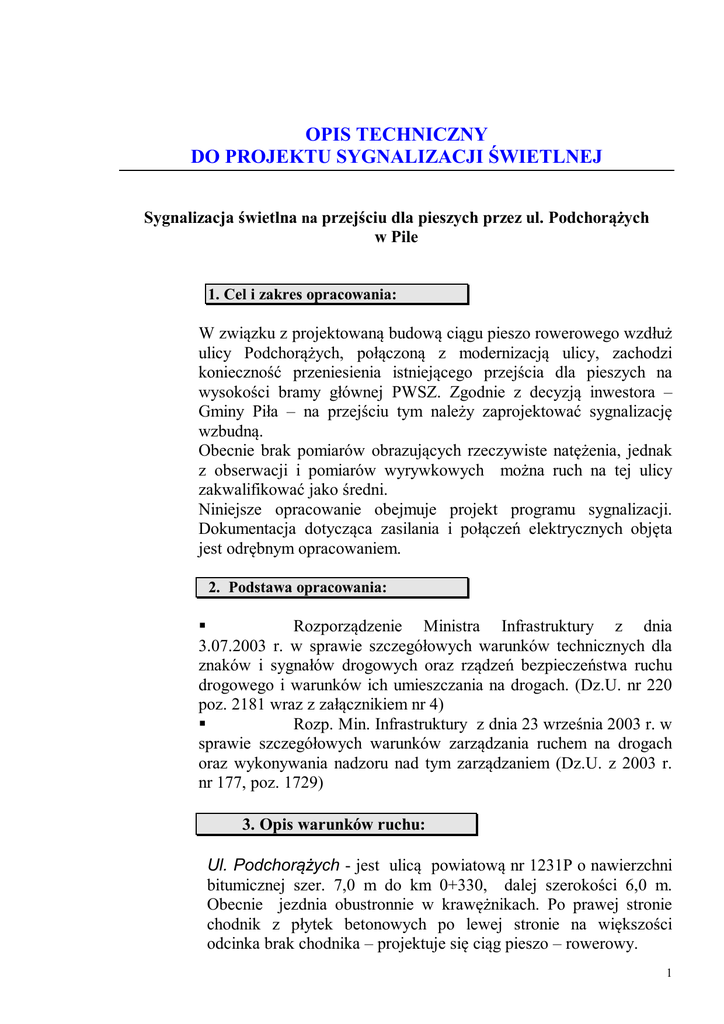 OPIS TECHNICZNY DO PROJEKTU SYGNALIZACJI ŚWIETLNEJ Sygnalizacja świetlna na przejściu dla pieszych przez ul. Podchorążych w Pile 1. Cel i zakres opracowania: W związku z projektowaną budową ciągu pieszo rowerowego wzdłuż ulicy Podchorążych, połączoną z modernizacją ulicy, zachodzi konieczność przeniesienia istniejącego przejścia dla pieszych na wysokości bramy głównej PWSZ. Zgodnie z decyzją inwestora – Gminy Piła – na przejściu tym należy zaprojektować sygnalizację wzbudną. Obecnie brak pomiarów obrazujących rzeczywiste natężenia, jednak z obserwacji i pomiarów wyrywkowych można ruch na tej ulicy zakwalifikować jako średni. Niniejsze opracowanie obejmuje projekt programu sygnalizacji. Dokumentacja dotycząca zasilania i połączeń elektrycznych objęta jest odrębnym opracowaniem. 2. Podstawa opracowania: Rozporządzenie Ministra Infrastruktury z dnia 3.07.2003 r. w sprawie szczegółowych warunków technicznych dla znaków i sygnałów drogowych oraz rządzeń bezpieczeństwa ruchu drogowego i warunków ich umieszczania na drogach. (Dz.U. nr 220 poz. 2181 wraz z załącznikiem nr 4) Rozp. Min. Infrastruktury z dnia 23 września 2003 r. w sprawie szczegółowych warunków zarządzania ruchem na drogach oraz wykonywania nadzoru nad tym zarządzaniem (Dz.U. z 2003 r. nr 177, poz. 1729) 3. Opis warunków ruchu: Ul. Podchorążych - jest ulicą powiatową nr 1231P o nawierzchni bitumicznej szer. 7,0 m do km 0+330, dalej szerokości 6,0 m. Obecnie jezdnia obustronnie w krawężnikach. Po prawej stronie chodnik z płytek betonowych po lewej stronie na większości odcinka brak chodnika – projektuje się ciąg pieszo – rowerowy. 1 Po prawej stronie za chodnikiem płot stalowy na podmurówce betonowej, dalej trawnik. Po lewej stronie za chodnikiem trawnik i częściowo pozostałość po ogrodzeniu w postaci podmurówki betonowej podmurówki. Tam, gdzie brak chodnika – pobocze gruntowe i trawnik. 4. Opis organizacji ruchu: Docelowa organizacja ruchu na projektowanej ścieżce rowerowej i chodniku oraz na ulicy w rejonie tego ciągu stanowi przedmiot odrębnego opracowania. 5. Sygnalizacja świetlna: Zaprojektowano sygnalizację wzbudzaną dwufazową z wydzielonymi dwoma grupami sygnalizacyjnymi. Detekcją objęto tylko potoki ruchu pieszego. Ruch kołowy posiada przydzielony stały sygnał zielony do momentu zgłoszenia zapotrzebowania ze strony pieszych. Graficzne przedstawienie faz ruchu pokazano na załączonym rysunku. Zestawienie grup sygnalizacyjnych oraz współpracujących z nimi detektorów pokazano w tabeli nr 1. Dla ruchu pieszego zaprojektowano detektory w postaci przycisków zgłaszających zapotrzebowanie na sygnał zielony umieszczonych na słupach lamp sygnałowych. Zaleca się zastosowanie sygnału dźwiękowego nadawanego równolegle z sygnałem zielonym dla pieszych. Rozmieszczenie i oznaczenie sygnalizatorów pokazano na rysunku nr 1S. Zaprojektowano następujące programy sygnalizacji: Program roboczy przedstawiono w załączeniu w formie graficznej. Program zakłada permanentny sygnał zielony dla ruchu kołowego. Po zgłoszeniu ze strony pieszych otrzymują oni sygnał zielony na 11 sek. (łącznie z zielonym migającym). Po wyczerpaniu sygnału zielonego na kierunku podrzędnym, otrzymuje go kierunek zasadniczy (kołowy) na okres do następnego zgłoszenia, nie mniej niż 30 sek. Program awaryjny przewiduje przełączenie sygnalizatorów grupy K1 (kołowej) na stały sygnał żółty pulsujący oraz wyłączenie sygnalizatorów grupy P1 (pieszej). Program startowy przewiduje włączenie sygnału żółtego dla grupy K1 na okres 5 sek., następnie czerwonego na 12 sek, czerwony z żółtym na 1 sek. i zielony – do czasu zgłoszenia zapotrzebowania na sygnał zielony przez grupę P1. W tym samym czasie, dla grupy P1 wyświetlany jest sygnał czerwony. Program końcowy przewiduje jednoczesne przełączenie dla grupy K1 sygnału zielonego na żółty pulsujący i wyłączenie sygnału dla grupy P1. 2 Na podstawie dokonanych obliczeń oraz wytycznych zawartych w zał. Nr 3 do rozporządzenia MI z dnia 3 lipca 2003 r (wym. wyżej w punkcie 2) przyjęto czasy międzyzielone pomiędzy poszczególnymi fazami wyszczególnione w tabeli nr 2. Wartości te pozwalają na bezpieczną ewakuację pojazdów i pieszych i nie powodują nadmiernych strat czasu. Długości poszczególnych faz zdaniem autora powinny zapewnić regularny i bezkolizyjny przepływ poszczególnych strumieni ruchu jednak, zaleca się prowadzenie obserwacji funkcjonowania sygnalizacji po jej uruchomieniu i wprowadzenie ewentualnych korekt w jej programie. 6. Przepustowość ulicy: Na dzień dzisiejszy nie funkcjonuje instrukcja, która określałaby metodę i pozwałaby na uzyskanie miarodajnych wyników określających przepustowości odcinka ulicy pomiędzy skrzyżowaniami przy funkcjonującej sygnalizacji wzbudzanej. Obecnie natężenia ruchu na ul. Podchorążych nawet w najbardziej niekorzystnych godzinach szczytu mają wartości znacznie poniżej wartości krytycznych. Przewidywane natężenie ruchu pieszego również nie będzie osiągało znacznych wartości. W tej sytuacji można z bardzo dużym prawdopodobieństwem stwierdzić, że projektowana sygnalizacja nie będzie miała znaczącego wpływu na warunki ruchu na ul Podchorążych. 6. Termin wprowadzenia: Przewiduje się wprowadzenie sygnalizacji po wybudowaniu i oddaniu do ruchu ciągu pieszo- rowerowego, tj. w 2014 roku. Piła, grudzień 2013 r. Opracował mgr inż. Jarosław Wagiel 3