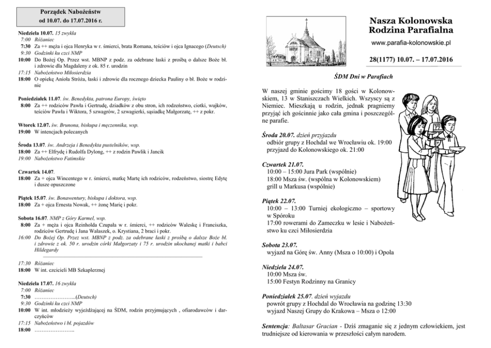 Porządek Nabożeństw Nasza Kolonowska Rodzina Parafialna od 10.07. do 17.07.2016 r. Niedziela 10.07. 15 zwykła 7:00 Różaniec 7:30 Za ++ męża i ojca Henryka w r. śmierci, brata Romana, teściów i ojca Ignacego (Deutsch) 9:30 Godzinki ku czci NMP 10:00 Do Bożej Op. Przez wst. MBNP z podz. za odebrane łaski z prośbą o dalsze Boże bł. i zdrowie dla Magdaleny z ok. 85 r. urodzin 17:15 Nabożeństwo Miłosierdzia 18:00 O opiekę Anioła Stróża, łaski i zdrowie dla rocznego dziecka Pauliny o bł. Boże w rodzinie Poniedziałek 11.07. św. Benedykta, patrona Europy, święto 8:00 Za ++ rodziców Pawła i Gertrudę, dziadków z obu stron, ich rodzeństwo, ciotki, wujków, teściów Pawła i Wiktora, 5 szwagrów, 2 szwagierki, sąsiadkę Małgorzatę, ++ z pokr. Wtorek 12.07. św. Brunona, biskupa i męczennika, wsp. 19:00 W intencjach polecanych Środa 13.07. św. Andrzeja i Benedykta pustelników, wsp. 18:00 Za ++ Elfrydę i Rudolfa Dylong, ++ z rodzin Pawlik i Jancik 19:00 Nabożeństwo Fatimskie Czwartek 14.07. 18:00 Za + ojca Wincentego w r. śmierci, matkę Martę ich rodziców, rodzeństwo, siostrę Edytę i dusze opuszczone Piątek 15.07. św. Bonawentury, biskupa i doktora, wsp. 18:00 Za + ojca Ernesta Nowak, ++ żonę Marię i pokr. Sobota 16.07. NMP z Góry Karmel, wsp. 8:00 Za + męża i ojca Reinholda Czupała w r. śmierci, ++ rodziców Waleskę i Franciszka, rodziców Gertrudę i Jana Walaszek, o. Krystiana, 2 braci i pokr. 16:00 Do Bożej Op. Przez wst. MBNP z podz. za odebrane łaski z prośbą o dalsze Boże bł. i zdrowie z ok. 50 r. urodzin córki Małgorzaty i 75 r. urodzin ukochanej matki i babci Hildegardy ——–—–——–—–—————————–—————–——————— 17:30 Różaniec 18:00 W int. czcicieli MB Szkaplerznej Niedziela 17.07. 16 zwykła 7:00 Różaniec 7:30 …………………...(Deutsch) 9:30 Godzinki ku czci NMP 10:00 W int. młodzieży wyjeżdżającej na ŚDM, rodzin przyjmujących , ofiarodawców i darczyńców 17:15 Nabożeństwo i bł. pojazdów 18:00 ………………….. www.parafia-kolonowskie.pl 28(1177) 10.07. – 17.07.2016 ŚDM Dni w Parafiach W naszej gminie gościmy 18 gości w Kolonowskiem, 13 w Staniszczach Wielkich. Wszyscy są z Niemiec. Mieszkają u rodzin, jednak pragniemy przyjąć ich gościnnie jako cała gmina i poszczególne parafie. Środa 20.07. dzień przyjazdu odbiór grupy z Hochdal we Wrocławiu ok. 19:00 przyjazd do Kolonowskiego ok. 21:00 Czwartek 21.07. 10:00 – 15:00 Jura Park (wspólnie) 18:00 Msza św. (wspólna w Kolonowskiem) grill u Markusa (wspólnie) Piątek 22.07. 10:00 – 13:00 Turniej ekologiczno – sportowy w Spóroku 17:00 rowerami do Zameczku w lesie i Nabożeństwo ku czci Miłosierdzia Sobota 23.07. wyjazd na Górę św. Anny (Msza o 10:00) i Opola Niedziela 24.07. 10:00 Msza św. 15:00 Festyn Rodzinny na Granicy Poniedziałek 25.07. dzień wyjazdu powrót grupy z Hochdal do Wrocławia na godzinę 13:30 wyjazd Naszej Grupy do Krakowa – Msza o 12:00 Sentencja: Baltasar Gracian - Dziś zmaganie się z jednym człowiekiem, jest trudniejsze od kierowania w przeszłości całym narodem. 28/2016 Na wesoło Bogaty właściciel majątku miał dość leniwego ogrodnika. Pewnego razu zauważył go spokojnie leżącego w ogrodzie w godzinach pracy. Był to gorący, letni dzień. - A ty, nicponiu jeden! – woła właściciel. – Nie jesteś godny, żeby to Boże słońce świeciło nad tobą. - Wiem o tym, panie – odrzekł ogrodnik – i dlatego położyłem się w cieniu. Burza na morzu. Niewielkim statkiem pasażerskim miotają fale. Obecny wśród pasażerów ksiądz pyta kapitana: - Czy zdoła pan nas ocalić? - Jesteśmy w ręku Boga. - To już do tego doszliśmy – mówi zaniepokojony duchowny. - W każdej chwili możemy znaleźć się w raju. - O Boże, broń nas od tego – wzdycha ksiądz. ——–—–———————————–————————–———–————— Opowiadanie W lasach wysoko ponad austriackim miasteczkiem leżącym na wschodnich stokach Alp mieszkał pewien starszy człowiek. Przed laty poprzednia rada miejska zleciła mu oczyszczanie krystalicznych górskich źródeł z butwiejących liści i gałęzi. Źródła te zasilały zbiornik, z którego miasto czerpało wodę poprzez sieć kanałów. Staruszek regularnie obchodził okoliczne wzgórza usuwając opadłe liście i połamane gałęzie i oczyszczając ujęcie wody ze szlamu, który w przeciwnym razie zanieczyściłby ją. Z czasem miasteczko stało się atrakcją turystyczną i ulubionym miejscem urlopowiczów. Po kanałach pływały z gracją łabędzie. Dniem i nocą kręciły się młyńskie koła wielu zakładów, pola były dobrze nawodnione, a miasteczko wyglądało jak z obrazka. Mijały lata. Pewnego dnia na posiedzeniu rady miejskiej poświęconym kwestiom budżetowym jeden z jej członków zwrócił uwagę na sumę wymienioną jako wynagrodzenie dla bliżej nieznanego strażnika źródeł. Skarbnik zakwestionował ten wydatek, pytając: A to co za jeden? Dlaczego rokrocznie płacimy mu pensję? Czy ktoś go w ogóle widział? - I ciągnął dalej: - Z tego co wiemy, ten człowiek równie dobrze może już nie żyje. Tak czy inaczej, nie jest nam już potrzebny. Więc radni jednogłośnie uznali, że zrezygnują z usług strażnika. Przez kilka tygodni nic się nie zmieniło. Jednak z początkiem jesieni drzewa zaczęły zrzucać liście. Odłamywały się małe gałązki, a spadając do wody, tamowały wartki prąd strumieni. Wreszcie pewnego popołudnia ktoś dostrzegł lekko żółtawe zabarwienie wody w stawie. Parę dni później stała się ona jeszcze ciemniejsza. Potem wzdłuż brzegów kanału zaczął gromadzić się oślizgły osad i wkrótce można było wyczuć narastający smród. Młyńskie koła obracały się coraz wolniej, aż w końcu stanęły. Łabędzie znikły, podobnie jak turyści. Lepkie palce choroby wsuwały