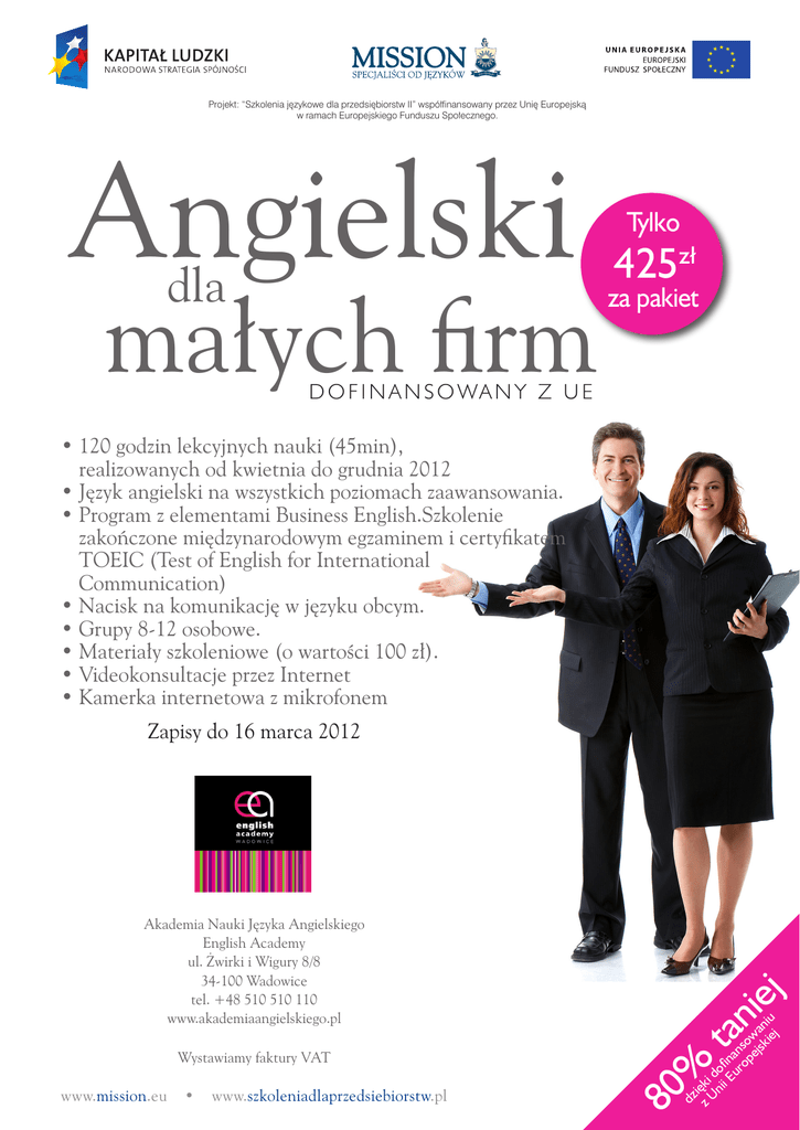 EUROPEJSKI EUROPEJSKI FUNDUSZ FUNDUSZ SPOŁECZNY SPOŁECZNY Projekt: “Szkolenia językowe dla przedsiębiorstw II” współfinansowany przez Unię Europejską w ramach Europejskiego Funduszu Społecznego. sowy wy program program szkoleniowy szkoleniowy drogą drogą dodo zmian zmian jakościowych jakościowych Projekt: w Banku w Kompleksowy Banku PEKAO PEKAO S.A. program S.A. szkoleniowy drogą do zmian jakościowych w ny any przez przez Unię Unię Europejską Europejską w ramach w ramach Europejskiego Europejskiego Funduszu Funduszu współfinansowany Społecznego Społecznego przez Unię Europejską w ramach Europejskiego Fundus Angielski dla małych firm Tylko 425zł za pakiet D O F I N A N S O WA N Y Z U E • 120 godzin lekcyjnych nauki (45min), realizowanych od kwietnia do grudnia 2012 • Język angielski na wszystkich poziomach zaawansowania. • Program z elementami Business English.Szkolenie zakończone międzynarodowym egzaminem i certyfikatem TOEIC (Test of English for International Communication) • Nacisk na komunikację w języku obcym. • Grupy 8-12 osobowe. • Materiały szkoleniowe (o wartości 100 zł). • Videokonsultacje przez Internet • Kamerka internetowa z mikrofonem www.mission.eu • www.szkoleniadlaprzedsiebiorstw.pl ni % ta dz z Uięki ni dofi iE n ur an op so ejs wa kie niu j Wystawiamy faktury VAT 80 Akademia Nauki Języka Angielskiego English Academy ul. Żwirki i Wigury 8/8 34-100 Wadowice tel. +48 510 510 110 www.akademiaangielskiego.pl ej Zapisy do 16 marca 2012