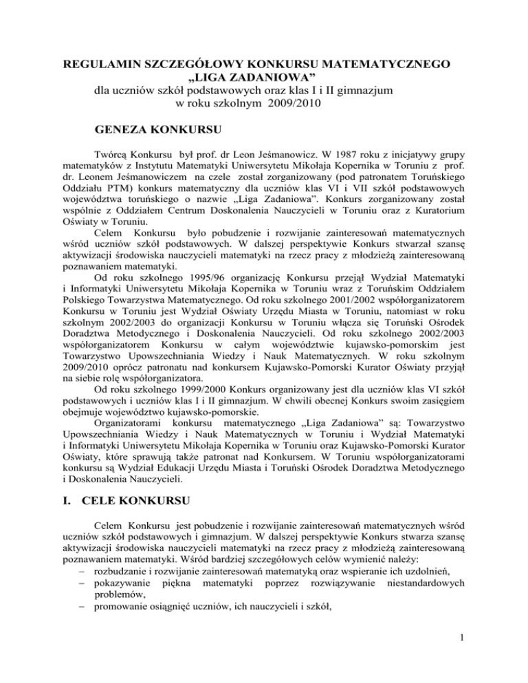 REGULAMIN SZCZEGÓŁOWY KONKURSU MATEMATYCZNEGO „LIGA ZADANIOWA” dla uczniów szkół podstawowych oraz klas I i II gimnazjum w roku szkolnym 2009/2010 GENEZA KONKURSU Twórcą Konkursu był prof. dr Leon Jeśmanowicz. W 1987 roku z inicjatywy grupy matematyków z Instytutu Matematyki Uniwersytetu Mikołaja Kopernika w Toruniu z prof. dr. Leonem Jeśmanowiczem na czele został zorganizowany (pod patronatem Toruńskiego Oddziału PTM) konkurs matematyczny dla uczniów klas VI i VII szkół podstawowych województwa toruńskiego o nazwie „Liga Zadaniowa”. Konkurs zorganizowany został wspólnie z Oddziałem Centrum Doskonalenia Nauczycieli w Toruniu oraz z Kuratorium Oświaty w Toruniu. Celem Konkursu było pobudzenie i rozwijanie zainteresowań matematycznych wśród uczniów szkół podstawowych. W dalszej perspektywie Konkurs stwarzał szansę aktywizacji środowiska nauczycieli matematyki na rzecz pracy z młodzieŜą zainteresowaną poznawaniem matematyki. Od roku szkolnego 1995/96 organizację Konkursu przejął Wydział Matematyki i Informatyki Uniwersytetu Mikołaja Kopernika w Toruniu wraz z Toruńskim Oddziałem Polskiego Towarzystwa Matematycznego. Od roku szkolnego 2001/2002 współorganizatorem Konkursu w Toruniu jest Wydział Oświaty Urzędu Miasta w Toruniu, natomiast w roku szkolnym 2002/2003 do organizacji Konkursu w Toruniu włącza się Toruński Ośrodek Doradztwa Metodycznego i Doskonalenia Nauczycieli. Od roku szkolnego 2002/2003 współorganizatorem Konkursu w całym województwie kujawsko-pomorskim jest Towarzystwo Upowszechniania Wiedzy i Nauk Matematycznych. W roku szkolnym 2009/2010 oprócz patronatu nad konkursem Kujawsko-Pomorski Kurator Oświaty przyjął na siebie rolę współorganizatora. Od roku szkolnego 1999/2000 Konkurs organizowany jest dla uczniów klas VI szkół podstawowych i uczniów klas I i II gimnazjum. W chwili obecnej Konkurs swoim zasięgiem obejmuje województwo kujawsko-pomorskie. Organizatorami konkursu matematycznego „Liga Zadaniowa” są: Towarzystwo Upowszechniania Wiedzy i Nauk Matematycznych w Toruniu i Wydział Matematyki i Informatyki Uniwersytetu Mikołaja Kopernika w Toruniu oraz Kujawsko-Pomorski Kurator Oświaty, które sprawują takŜe patronat nad Konkursem. W Toruniu współorganizatorami konkursu są Wydział Edukacji Urzędu Miasta i Toruński Ośrodek Doradztwa Metodycznego i Doskonalenia Nauczycieli. I. CELE KONKURSU Celem Konkursu jest pobudzenie i rozwijanie zainteresowań matematycznych wśród uczniów szkół podstawowych i gimnazjum. W dalszej perspektywie Konkurs stwarza szansę aktywizacji środowiska nauczycieli matematyki na rzecz pracy z młodzieŜą zainteresowaną poznawaniem matematyki. Wśród bardziej szczegółowych celów wymienić naleŜy: − rozbudzanie i rozwijanie zainteresowań matematyką oraz wspieranie ich uzdolnień, − pokazywanie piękna matematyki poprzez rozwiązywanie niestandardowych problemów, − promowanie osiągnięć uczniów, ich nauczycieli i szkół, 1 − motywowanie szkół do podejmowania róŜnorodnych działań w pracy z uczniem zainteresowanym matematyką, − promowanie wartości pracy nad rozwojem swoich uzdolnień, − stwarzanie sytuacji pobudzających uczniów do twórczego myślenia. II. ORGANIZACJA I PRZEBIEG KONKURSU 1. Konkurs na terenie województwa kujawsko-pomorskiego organizuje Komitet Organizacyjny powołany przez Dziekana Wydziału Matematyki i Informatyki Uniwersytetu Mikołaja Kopernika w Toruniu. Skład Komitetu Organizacyjnego zawarty jest w załączniku nr 1 do niniejszego regulaminu. 2. Konkurs jest trzyetapowy składający się z etapu szkolnego i pięciu spotkań rozłoŜonych równomiernie w ciągu roku szkolnego. 3. Etap pierwszy – szkolny polega na przeprowadzeniu konkursu w szkołach w oparciu o dostarczone przez organizatorów konkursu zadania: test dla klasy VI oraz zadania ćwiczenia dla klas I i II gimnazjum. Etap szkolny powinien odbyć się do 20.10.2009 r. Szkoły zgłaszają uczniów do udziału w konkursie na etapie rejonowym. Ostateczny termin zgłoszeń upływa dnia 3.11.2009 r. Zgłoszenia naleŜy przesyłać na adres: Wydział Matematyki i Informatyki Uniwersytetu Mikołaja Kopernika, ul. Chopina 12/18, 87 – 100 Toruń, „Liga Zadaniowa” Komitet Organizacyjny. Komitet Organizacyjny moŜe dopuścić do etapu rejonowego takŜe uczniów ze szkół, w których nie przeprowadzono etapu pierwszego. Etap drugi – rejonowy składa się z trzech oddzielnych spotkań konkursowych. W tym roku terminy spotkań etapu rejonowego: 21.11.2009 r, 9.01.2010 r., 13.02.2010 r. o godz. 10.00. Czas trwania kaŜdego z tych spotkań (czas rozwiązywania zadań) 90 minut. Do kaŜdego ze spotkań etapu rejonowego uczeń otrzymuje zestaw zadań przygotowawczych (nie ma zadań przygotowawczych do etapu finałowego). Zadania konkursowe przygotowane są przez Komitet Organizacyjny na podstawie zadań przygotowawczych doręczonych uczniom wcześniej. W trakcie kaŜdego z tych spotkań uczeń rozwiązuje zestaw zadań konkursowych w formie pisemnej. Po zakończeniu etapu rejonowego Komitet Organizacyjny ustala listy zdobywców I, II i III miejsca oraz wyróŜnionych. Zdobywcy I miejsca i II miejsca z klas VI szkół podstawowych i klas II gimnazjum są zakwalifikowani do etapu finałowego – wojewódzkiego. Etap finałowy – wojewódzki odbędzie się w Toruniu na Wydziale Matematyki i Informatyki UMK w dniu 6.03.2010 r. (sobota) o godz. 11.00. KaŜdy z uczniów w zawodach finałowych rozwiązuje zestaw zadań w formie pisemnej. Uczniowie nagrodzeni w tym etapie, zgodnie wymogami obowiązującymi w finale wojewódzkiego konkursu przedmiotowego z matematyki, otrzymują tytuł Laureata konkursu „Liga Zadaniowa”, a pozostali uczestnicy etapu finałowego otrzymują tytuł finalisty tego konkursu. Laureatom przysługuje zwolnienie z egzaminu zewnętrznego na odpowiednim etapie edukacji, a finalistom dodatkowe punkty przy ubieganiu się o przyj