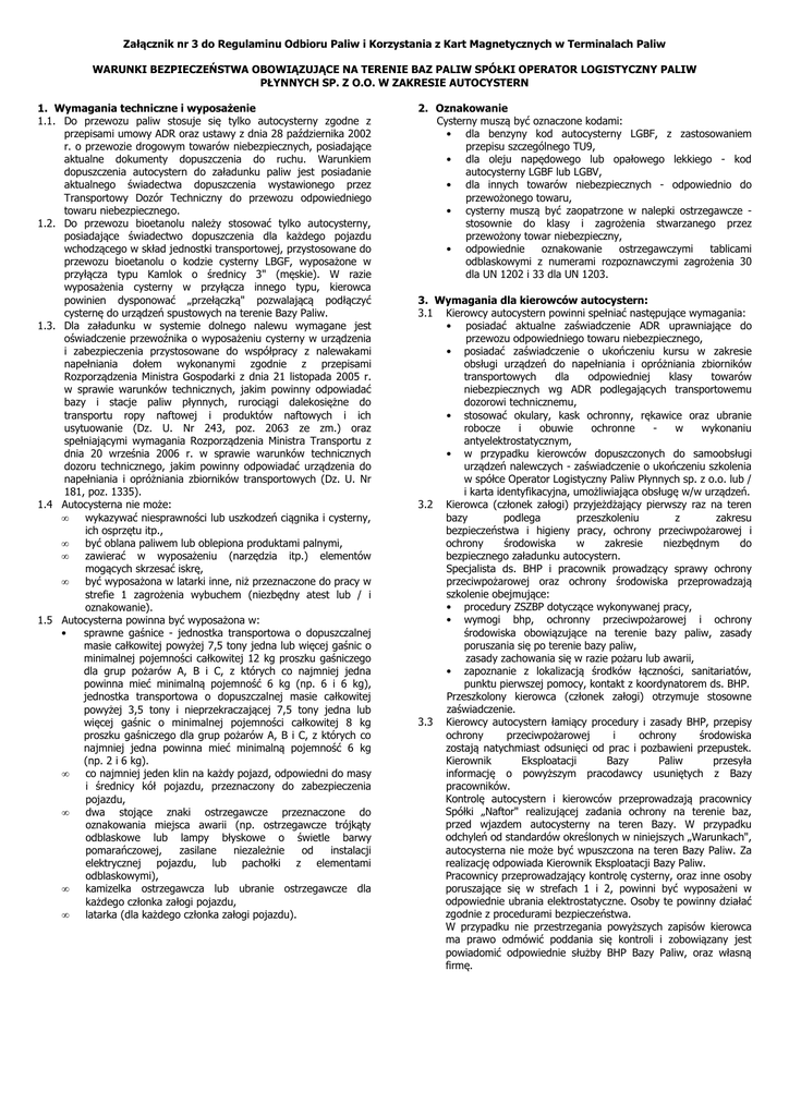 Załącznik nr 3 do Regulaminu Odbioru Paliw i Korzystania z Kart Magnetycznych w Terminalach Paliw WARUNKI BEZPIECZEŃSTWA OBOWIĄZUJĄCE NA TERENIE BAZ PALIW SPÓŁKI OPERATOR LOGISTYCZNY PALIW PŁYNNYCH SP. Z O.O. W ZAKRESIE AUTOCYSTERN 1. Wymagania techniczne i wyposażenie 1.1. Do przewozu paliw stosuje się tylko autocysterny zgodne z przepisami umowy ADR oraz ustawy z dnia 28 października 2002 r. o przewozie drogowym towarów niebezpiecznych, posiadające aktualne dokumenty dopuszczenia do ruchu. Warunkiem dopuszczenia autocystern do załadunku paliw jest posiadanie aktualnego świadectwa dopuszczenia wystawionego przez Transportowy Dozór Techniczny do przewozu odpowiedniego towaru niebezpiecznego. 1.2. Do przewozu bioetanolu należy stosować tylko autocysterny, posiadające świadectwo dopuszczenia dla każdego pojazdu wchodzącego w skład jednostki transportowej, przystosowane do przewozu bioetanolu o kodzie cysterny LBGF, wyposażone w przyłącza typu Kamlok o średnicy 3" (męskie). W razie wyposażenia cysterny w przyłącza innego typu, kierowca powinien dysponować „przełączką" pozwalającą podłączyć cysternę do urządzeń spustowych na terenie Bazy Paliw. 1.3. Dla załadunku w systemie dolnego nalewu wymagane jest oświadczenie przewoźnika o wyposażeniu cysterny w urządzenia i zabezpieczenia przystosowane do współpracy z nalewakami napełniania dołem wykonanymi zgodnie z przepisami Rozporządzenia Ministra Gospodarki z dnia 21 listopada 2005 r. w sprawie warunków technicznych, jakim powinny odpowiadać bazy i stacje paliw płynnych, rurociągi dalekosiężne do transportu ropy naftowej i produktów naftowych i ich usytuowanie (Dz. U. Nr 243, poz. 2063 ze zm.) oraz spełniającymi wymagania Rozporządzenia Ministra Transportu z dnia 20 września 2006 r. w sprawie warunków technicznych dozoru technicznego, jakim powinny odpowiadać urządzenia do napełniania i opróżniania zbiorników transportowych (Dz. U. Nr 181, poz. 1335). 1.4 Autocysterna nie może: • wykazywać niesprawności lub uszkodzeń ciągnika i cysterny, ich osprzętu itp., • być oblana paliwem lub oblepiona produktami palnymi, • zawierać w wyposażeniu (narzędzia itp.) elementów mogących skrzesać iskrę, • być wyposażona w latarki inne, niż przeznaczone do pracy w strefie 1 zagrożenia wybuchem (niezbędny atest lub / i oznakowanie). 1.5 Autocysterna powinna być wyposażona w: • sprawne gaśnice - jednostka transportowa o dopuszczalnej masie całkowitej powyżej 7,5 tony jedna lub więcej gaśnic o minimalnej pojemności całkowitej 12 kg proszku gaśniczego dla grup pożarów A, B i C, z których co najmniej jedna powinna mieć minimalną pojemność 6 kg (np. 6 i 6 kg), jednostka transportowa o dopuszczalnej masie całkowitej powyżej 3,5 tony i nieprzekraczającej 7,5 tony jedna lub więcej gaśnic o minimalnej pojemności całkowitej 8 kg proszku gaśniczego dla grup pożarów A, B i C, z których co najmniej jedna powinna mieć minimalną pojemność 6 kg (np. 2 i 6 kg). • co najmniej jeden klin na każdy pojazd, odpowiedni do masy i średnicy kół pojazdu, przeznaczony do zabezpieczenia pojazdu, • dwa stojące znaki ostrzegawcze przeznaczone do oznakowania miejsca awarii (np. ostrzegawcze trójkąty odblaskowe lub lampy błyskowe o świetle barwy pomarańczowej, zasilane niezależnie od instalacji elektrycznej pojazdu, lub pachołki z elementami odblaskowymi), • kamizelka ostrzegawcza lub ubranie ostrzegawcze dla każdego członka załogi pojazdu, • latarka (dla każdego członka załogi pojazdu). 2. Oznakowanie Cysterny muszą być oznaczone kodami: • dla benzyny kod autocysterny LGBF, z zastosowaniem przepisu szczególnego TU9, • dla oleju napędowego lub opałowego lekkiego - kod autocysterny LGBF lub LGBV, • dla innych towarów niebezpiecznych - odpowiednio do przewożonego towaru, • cysterny muszą być zaopatrzone w nalepki ostrzegawcze stosownie do klasy i zagrożenia stwarzanego przez przewożony towar niebezpieczny, • odpowiednie oznakowanie ostrzegawczymi tablicami odblaskowymi z numerami rozpoznawczymi zagrożenia 30 dla UN 1202 i 33 dla UN 1203. 3. Wymagania dla kierowców autocystern: 3.1 Kierowcy autocystern powinni spełniać następujące wymagania: • posiadać aktualne zaświadczenie ADR uprawniające do przewozu odpowiedniego towaru niebezpiecznego, • posiadać zaświadczenie o ukończeniu kursu w zakresie obsługi urządzeń do napełniania i opróżniania zbiorników transportowych dla odpowiedniej klasy towarów niebezpiecznych wg ADR podlegających transportowemu dozorowi technicznemu, • stosować okulary, kask ochronny, rękawice oraz ubranie robocze i obuwie ochronne w wykonaniu antyelektrostatycznym, • w przypadku kierowców dopuszczonych do samoobsługi urządzeń nalewczych - zaświadczenie o ukończeniu szkolenia w spółce Operator Logistyczny Paliw Płynnych sp. z o.o. lub / i karta identyfikacyjna, umożliwiająca obsługę w/w urządzeń. 3.2 Kierowca (członek załogi) przyjeżdżający pierwszy raz na teren bazy podlega przeszkoleniu z zakresu bezpieczeństwa i higieny pracy, ochrony przeciwpożarowej i ochrony środowiska w zakresie niezbędnym do bezpiecznego załadunku autocystern. Specjalista ds. BHP i pracownik prowadzący sprawy ochrony przeciwpożarowej oraz ochrony środowiska przeprowadzają szkolenie obejmujące: • procedury ZSZBP dotyczące wykonywanej pracy, • wymogi bhp, ochronny przeciwpożarowej i ochrony środowiska obowiązujące na terenie bazy paliw, zasady poruszania się po terenie bazy paliw, zasady zachowania się w razie pożaru lub awarii, • zapoznanie z lokalizacją środków łączności, sanitariatów, punktu pierwszej pomocy, kontakt z koordynatorem ds. BHP. Przeszkolony kierowca (członek załogi) otrzymuje stosowne zaświadczenie. 3.3 Kierowcy autocystern łamiący procedury i zasady BHP, przepisy ochrony przeciwpożarowej i ochrony środowiska zostają natychmias