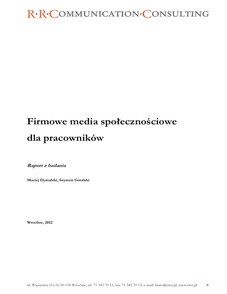 Firmowe media społecznościowe dla pracowników Raport z badania Maciej Dymalski, Szymon Góralski Wrocław, 2012 ul. Więzienna 21c/8, 50-118 Wrocław, tel. 71 343 70 15, fax: 71 343 70 13, e-mail: [email protected], www.rrcc.pl ● RRCC Media społecznościowe są od kilku lat coraz powszechniej wykorzystywane do celów biznesowych. Firmy głównie stosują takie narzędzia, by budować relacje z klientami, ale coraz częściej zaczynają je również stosować jako narzędzia skierowane do pracowników. Ponieważ media społecznościowe to platformy komunikacji pozwalające na wielostronną wymianę informacji pomiędzy użytkownikami, firmy mogą korzystać z ich interakcyjnego charakteru, aby ułatwiać oraz usprawniać komunikację pomiędzy pracownikami. Niektóre firmy zgromadziły już wiele doświadczeń w ciągu kilku lat od wdrożenia takich rozwiązań, inne wciąż się wahają, czy media społecznościowe wdrażać. Aby sprawdzić, jak wygląda stan mediów społecznościowych w polskich firmach, RR Communication Consulting przeprowadziło badania mające na celu określenie zastosowania tych narzędzi wewnątrz organizacji oraz poznanie najważniejszych trendów i opinii na ich temat. W lipcu i sierpniu 2012 roku przeprowadziliśmy wywiady telefoniczne z respondentami ze 154 firm. Były to osoby odpowiedzialne za komunikację wewnętrzną w tych organizacjach. Czy firmy korzystają z mediów społecznościowych w komunikacji wewnętrznej? Media społecznościowe w firmach są wciąż stosowane na dużo mniejszą skalę niż w przypadku rozwiązań skierowanych do społeczności zewnętrznych. Co druga firma wciąż nie korzysta z nich wewnątrz organizacji, zdarzają się również przypadki rezygnacji z ich stosowania. Wielkość firmy istotnie przekładała na się na stosowanie mediów społecznościowych: im większa firma, tym częściej są stosowane. Co zaskakujące, nie było różnic pomiędzy polskimi firmami a polskimi oddziałami międzynarodowych korporacji, jeżeli chodzi o stosowanie takich narzędzi. Wykres 1. Zastosowanie mediów społecznościowych wewnątrz organizacji © RR COMMUNICATION CONSULTING 2012 •2• RRCC Rodzaje mediów społecznościowych stosowanych w firmach Najczęściej podawanym rodzajem medium społecznościowego był interaktywny intranet. Taki intranet zawiera rozwiązania społecznościowe, jak np.: dodawanie komentarzy przez pracowników, wymianę opinii i informacji, tworzenie profili osobistych. Na drugim miejscu respondenci wymieniali fora (14%), a następnie portale pracownicze (13%). Warto podkreślić rozróżnienie pomiędzy portalem pracowniczym a portalem społecznościowym. Ten pierwszy jest dostępnym jedynie dla pracowników, wielomodułowym zestawem narzędzi pracy i aplikacji, umożliwiającym pracownikom personalizację i publikowanie informacji. Portal społecznościowy jest natomiast dostępny z poziomu Internetu, lecz skierowany jest do pracowników (przeważnie o charakterze zamkniętym, wymaga logowania). Wiedza na temat mediów społecznościowych wśród wielu osób, nawet tych zajmujących się komunikacją, bywa niewystarczająca – mimo przedstawienia dokładnej definicji mediów społecznościowych, niektórzy z respondentów wymieniali tradycyjny informacyjny intranet 1.0 jako przykład medium społecznościowego w ich firmie, mimo że nie posiadał on żadnych możliwości publikowania treści, bądź ich komentowania przez pracowników. W jednej z firm wymieniony został również radiowęzeł. Wykres 2. Rodzaje mediów społecznościowych stosowane w organizacji (dla firm posiadających media społecznościowe dla pracowników) © RR COMMUNICATION CONSULTING 2012 •3• RRCC Powody niestosowania mediów społecznościowych w firmach Jakie są powody, dla których firmy nieposiadające mediów społecznościowych nie decydują się na ich wprowadzenie? Takie firmy nie wykorzystują tych rozwiązań, bo przeważnie twierdzą, że nie potrzebują ich. Twierdzi tak ponad połowa ankietowanych, którzy zadeklarowali, że nie korzystają z mediów społecznościowych w firmie. Tylko 12% tę decyzję motywuje brakiem działu lub osoby odpowiadającej za takie działania czy niechęcią zarządu. Z kolei 8% badanych tłumaczy się brakiem odpowiedniego budżetu, a 4% brakiem czasu. Brak potrzeb stał się również przyczyną zaprzestania korzystania z mediów społecznościowych w przypadku firm, które z nich zrezygnowały – w jednej z firm były one potrzebne do jednorazowego projektu, potem nie pełniły żadnej roli i nie angażowały pracowników, więc zrezygnowano z nich. Wykres 3. Powody niestosowania mediów społecznościowych w firmach © RR COMMUNICATION CONSULTING 2012 •4• RRCC Oczekiwania wobec mediów społecznościowych w firmie Firmy, które zadeklarowały korzystanie z mediów społecznościowych wewnątrz organizacji, podały następujące cele, które chciały zrealizować dzięki ich wdrożeniu: Wykres 4. Cele wdrożenia mediów społecznościowych w firmach (dla firm posiadających media społecznościowe dla pracowników) Głównym powodem wdrożenia mediów społecznościowych było usprawnienie komunikacji i stworzenie nowego kanału komunikacyjnego dla pracowników. Większe firmy nieco częściej kładły nacisk na rolę mediów społecznościowych we wzmacnianiu zaangażowania pracowników i budowaniu relacji między nimi. Media społecznościowe w tych firmach były także częściej wdrażane jako potencjalne źródło opinii i pomysłów, pochodzących od pracowników. Wykres 5. Cele wdrożenia mediów społecznościowych (w podziale ze względu na wielkość firmy, dla firm posiadających media społecznościowe dla pracowników) Zdecydowana większość firm, bo aż ¾ stosujących media społecznościowe zadeklarowało, że spełniły one pokładane w nich oczekiwania. To pokazuje, że media społecznościowe rzeczywiście pomagają w realizacji celów, które był