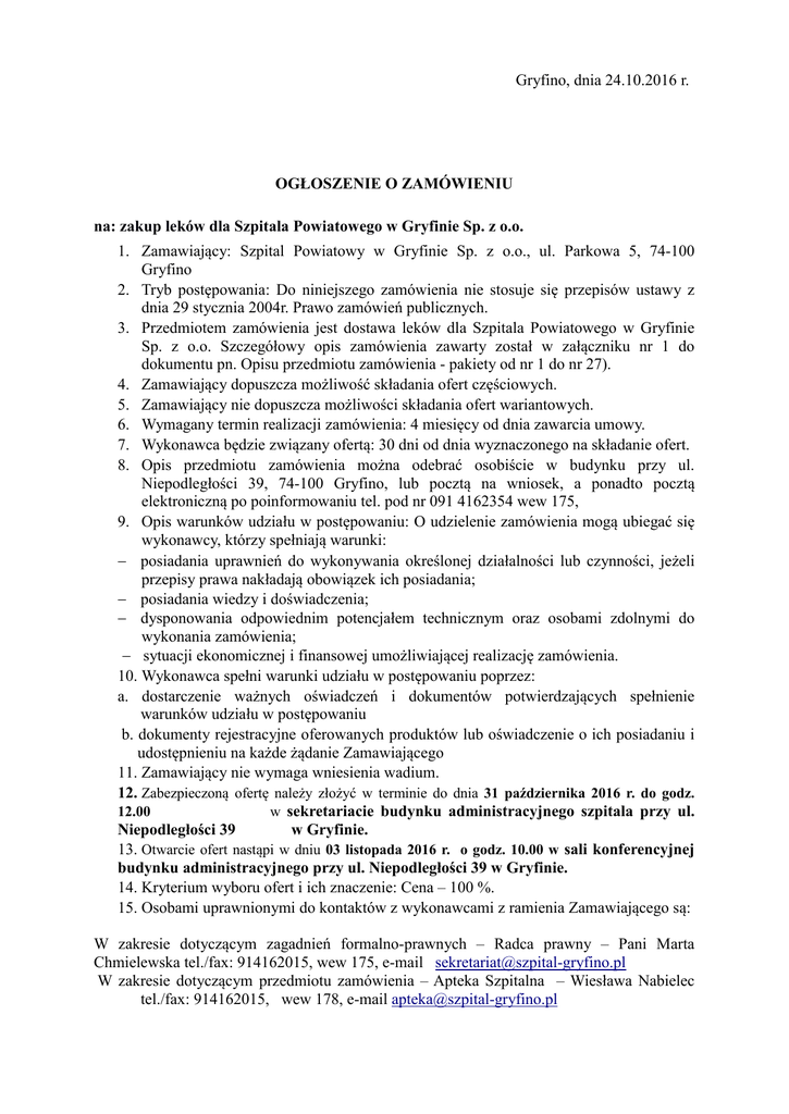 Gryfino, dnia 24.10.2016 r. OGŁOSZENIE O ZAMÓWIENIU na: zakup leków dla Szpitala Powiatowego w Gryfinie Sp. z o.o. 1. Zamawiający: Szpital Powiatowy w Gryfinie Sp. z o.o., ul. Parkowa 5, 74-100 Gryfino 2. Tryb postępowania: Do niniejszego zamówienia nie stosuje się przepisów ustawy z dnia 29 stycznia 2004r. Prawo zamówień publicznych. 3. Przedmiotem zamówienia jest dostawa leków dla Szpitala Powiatowego w Gryfinie Sp. z o.o. Szczegółowy opis zamówienia zawarty został w załączniku nr 1 do dokumentu pn. Opisu przedmiotu zamówienia - pakiety od nr 1 do nr 27). 4. Zamawiający dopuszcza możliwość składania ofert częściowych. 5. Zamawiający nie dopuszcza możliwości składania ofert wariantowych. 6. Wymagany termin realizacji zamówienia: 4 miesięcy od dnia zawarcia umowy. 7. Wykonawca będzie związany ofertą: 30 dni od dnia wyznaczonego na składanie ofert. 8. Opis przedmiotu zamówienia można odebrać osobiście w budynku przy ul. Niepodległości 39, 74-100 Gryfino, lub pocztą na wniosek, a ponadto pocztą elektroniczną po poinformowaniu tel. pod nr 091 4162354 wew 175, 9. Opis warunków udziału w postępowaniu: O udzielenie zamówienia mogą ubiegać się wykonawcy, którzy spełniają warunki: posiadania uprawnień do wykonywania określonej działalności lub czynności, jeżeli przepisy prawa nakładają obowiązek ich posiadania; posiadania wiedzy i doświadczenia; dysponowania odpowiednim potencjałem technicznym oraz osobami zdolnymi do wykonania zamówienia; sytuacji ekonomicznej i finansowej umożliwiającej realizację zamówienia. 10. Wykonawca spełni warunki udziału w postępowaniu poprzez: a. dostarczenie ważnych oświadczeń i dokumentów potwierdzających spełnienie warunków udziału w postępowaniu b. dokumenty rejestracyjne oferowanych produktów lub oświadczenie o ich posiadaniu i udostępnieniu na każde żądanie Zamawiającego 11. Zamawiający nie wymaga wniesienia wadium. 12. Zabezpieczoną ofertę należy złożyć w terminie do dnia 31 października 2016 r. do godz. 12.00 w sekretariacie budynku administracyjnego szpitala przy ul. Niepodległości 39 w Gryfinie. 13. Otwarcie ofert nastąpi w dniu 03 listopada 2016 r. o godz. 10.00 w sali konferencyjnej budynku administracyjnego przy ul. Niepodległości 39 w Gryfinie. 14. Kryterium wyboru ofert i ich znaczenie: Cena – 100 %. 15. Osobami uprawnionymi do kontaktów z wykonawcami z ramienia Zamawiającego są: W zakresie dotyczącym zagadnień formalno-prawnych – Radca prawny – Pani Marta Chmielewska tel./fax: 914162015, wew 175, e-mail [email protected] W zakresie dotyczącym przedmiotu zamówienia – Apteka Szpitalna – Wiesława Nabielec tel./fax: 914162015, wew 178, e-mail [email protected] 16. Pytania prosimy zgłaszać najpóźniej do 26.10.2016 r do godz 11.00 17. Wszystkie odpowiedzi ukarzą się na stronie Szpitala do 28.10.2016 r do godz 15.00 18. Informacje dotyczące zawierania umowy: W terminie wyznaczonym przez Zamawiającego w powiadomieniu o wyborze wykonawcy, wybrany wykonawca zobowiązany jest do podpisania umowy na realizację dostawy, usługi.