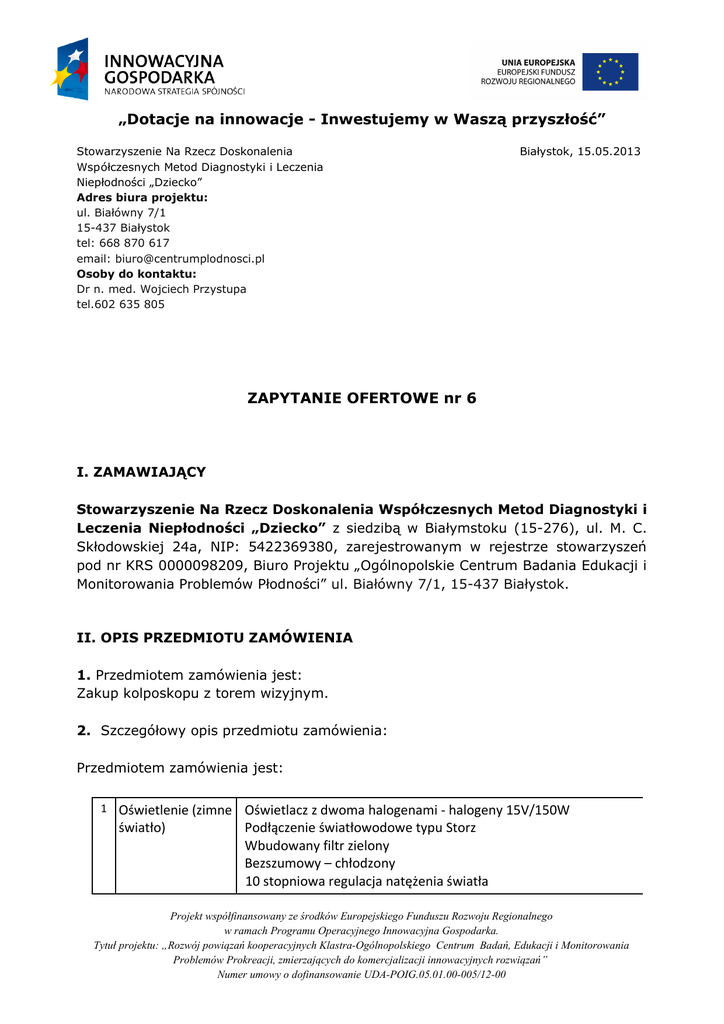 „Dotacje na innowacje - Inwestujemy w Waszą przyszłość” Stowarzyszenie Na Rzecz Doskonalenia Współczesnych Metod Diagnostyki i Leczenia Niepłodności „Dziecko” Adres biura projektu: ul. Białówny 7/1 15-437 Białystok tel: 668 870 617 email: [email protected] Osoby do kontaktu: Dr n. med. Wojciech Przystupa tel.602 635 805 Białystok, 15.05.2013 ZAPYTANIE OFERTOWE nr 6 I. ZAMAWIAJĄCY Stowarzyszenie Na Rzecz Doskonalenia Współczesnych Metod Diagnostyki i Leczenia Niepłodności „Dziecko” z siedzibą w Białymstoku (15-276), ul. M. C. Skłodowskiej 24a, NIP: 5422369380, zarejestrowanym w rejestrze stowarzyszeń pod nr KRS 0000098209, Biuro Projektu „Ogólnopolskie Centrum Badania Edukacji i Monitorowania Problemów Płodności” ul. Białówny 7/1, 15-437 Białystok. II. OPIS PRZEDMIOTU ZAMÓWIENIA 1. Przedmiotem zamówienia jest: Zakup kolposkopu z torem wizyjnym. 2. Szczegółowy opis przedmiotu zamówienia: Przedmiotem zamówienia jest: 1 Oświetlenie (zimne Oświetlacz z dwoma halogenami - halogeny 15V/150W światło) Podłączenie światłowodowe typu Storz Wbudowany filtr zielony Bezszumowy – chłodzony 10 stopniowa regulacja natężenia światła Projekt współfinansowany ze środków Europejskiego Funduszu Rozwoju Regionalnego w ramach Programu Operacyjnego Innowacyjna Gospodarka. Tytuł projektu: „Rozwój powiązań kooperacyjnych Klastra-Ogólnopolskiego Centrum Badań, Edukacji i Monitorowania Problemów Prokreacji, zmierzających do komercjalizacji innowacyjnych rozwiązań” Numer umowy o dofinansowanie UDA-POIG.05.01.00-005/12-00 „Dotacje na innowacje - Inwestujemy w Waszą przyszłość” Możliwość łatwego wymontowania ze stojaka 2 Głowica mikroskopu Stereoskopowa - wbudowana 5 stopniowa lunetka Galileusza. 3 Typ optyki apochromatyczna Zakres pochylenia 4 głowicy w pł pionowej Zakres +12/ -25 5 Zakres przesuwu głowicy w pionie Zakres 730 min / 980 max 6 Obrót głowicy prawo / lewo 90/ 90 Obrót ramienia 7 podstawy kolposkopu 8 Max wysuw głowicy w poziomie 360 920mm Regulacja przeciwwagi 9 ciężaru głowicy kolposkopu Pokrętło regulacyjne min /max Zmieniacz 10 powiększeń pięciopozycyjny Powiększenia osiągane: 18x, 11x, 7x, 5x, 3x 11 Średnica pola widzenia 14mm, 25mm, 35mm, 50mm, 85mm 12 Głębia pola 3-32mm Regulacja micro W obiektywie, bez konieczności przesuwu głowicy – zakres regulacji 25mm 14 Obiektyw stereoskopowy Ogniskowa f=300mm 15 Okulary stereoskopowe o pow. 10x 10x 13 16 Oświetlenie koaksjalne przez Odchylenie ±0,5° Projekt współfinansowany ze środków Europejskiego Funduszu Rozwoju Regionalnego w ramach Programu Operacyjnego Innowacyjna Gospodarka. Tytuł projektu: „Rozwój powiązań kooperacyjnych Klastra-Ogólnopolskiego Centrum Badań, Edukacji i Monitorowania Problemów Prokreacji, zmierzających do komercjalizacji innowacyjnych rozwiązań” Numer umowy o dofinansowanie UDA-POIG.05.01.00-005/12-00 „Dotacje na innowacje - Inwestujemy w Waszą przyszłość” obiektyw 17 Średnica pola oświetlonego 93mm 18 Regulacja dioptryjna na obu okularach, Zakres +/- 6 dioptrii Mocowanie Stabilny podłogowy uchwyt z dwoma punktami podparcia do mocowania do fotela ginekologicznego GOLEM na lewą lub prawą stronę; Kamera CCD wbudowana w głowicę kolposkopu Wysokorozdzielcza kamera CCD 1/3”, rozdz. 470 linii, kontrola balansu bieli, manualne ustawienie kolorów Opcje balansu bieli kamery Automatyczny i manualny 19 20 21 22 22 monitor panoramiczny wbudowanym tunerem TV Program 20” , Posiada złącza D-SUB, DVI-D, 2xHDMI – HDCP wersja 1.3, SCART, z Component, Złącze DVI, tuner telewizyjny, wbudowane 3-watowe głośniki szeroki kąt widzenia ( poziom, pion 170º ) , Program do archiwizacji obrazu z kamery kolposkopu Projekt współfinansowany ze środków Europejskiego Funduszu Rozwoju Regionalnego w ramach Programu Operacyjnego Innowacyjna Gospodarka. Tytuł projektu: „Rozwój powiązań kooperacyjnych Klastra-Ogólnopolskiego Centrum Badań, Edukacji i Monitorowania Problemów Prokreacji, zmierzających do komercjalizacji innowacyjnych rozwiązań” Numer umowy o dofinansowanie UDA-POIG.05.01.00-005/12-00 „Dotacje na innowacje - Inwestujemy w Waszą przyszłość” Dostawa i montaż na koszt wykonawcy realizującego zlecenie. Sprzedający gwarantuje specjalistyczne szkolenie dotyczące sprzętu w ramach zakupu. obsługi III. TERMIN WYKONANIA ZAMÓWIENIA I WARUNKI PŁATNOŚCI 1. Termin wykonania przedmiotu zamówienia: od 01.06.2013 do 01.09.2013 r. 2. Płatność za wykonywane przedmiotu zamówienia będzie miała miejsce w październiku 2013 r., chyba że strony uzgodnią inaczej. IV. OPIS SPOSBU PRZYGOTOWANIA OFERTY 1. Oferent powinien stworzyć ofertę, która powinna zawierać minimum: - opis doświadczenia jakim dysponuje Oferent przy działaniach związanych z przedmiotem zamówienia, cenę brutto za wykonanie przedmiotu zamówienia, okres gwarancyjny sprzętu warunki gwarancji warunki serwisu pogwarancyjnego termin dostarczenia sprzętu, których dotyczy niniejsze zapytanie, podpis osoby upoważnionej, 2. Oferta musi być ważna co najmniej 30 dni od daty jej wystawienia. 3. Oferent poniesie wszystkie koszty związane z przygotowaniem i złożeniem oferty. V. MIEJSCE ORAZ TERMIN SKŁADANIA OFERT 1. Oferta powinna być przesłana za pośrednictwem: poczty, kuriera lub też dostarczona osobiście na adres biura Projektu „Ogólnopolskie Centrum Badania, Edukacji i Monitorowania Problemów Płodności”: ul. Białówny 7/1, 15-437 Białystok do dnia 27.05.2013 do godz. 12.00 (decyduje data otrzymania oferty przez Zamawiającego). 2. Ocena ofert zostanie dokonana w dniu 28.05.2013 o godz. 16.00, a wyniki i wybór najkorzystniejszej oferty zostanie ogłoszony 31.05.2013 do godziny 16:00 w siedzibie Zamawiającego. 3. Oferty złożone po terminie nie będą rozpatrywane. Projekt współfinansowany ze środków Europejskiego Funduszu Rozwoju Regionalnego w ramach Programu Operacyjnego In
