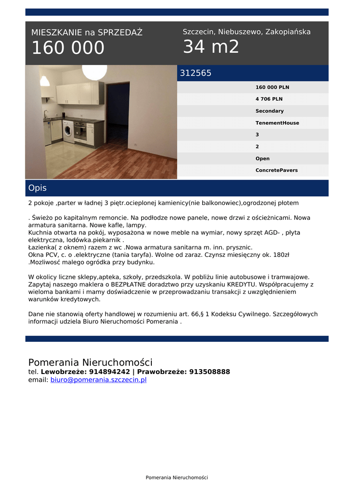 Szczecin, Niebuszewo, Zakopiańska MIESZKANIE na SPRZEDAŻ 34 m2 160 000 312565 160 000 PLN 4 706 PLN Secondary TenementHouse 3 2 Open ConcretePavers Opis 2 pokoje ,parter w ładnej 3 piętr.ocieplonej kamienicy(nie balkonowiec),ogrodzonej płotem . Świeżo po kapitalnym remoncie. Na podłodze nowe panele, nowe drzwi z ościeżnicami. Nowa armatura sanitarna. Nowe kafle, lampy. Kuchnia otwarta na pokój, wyposażona w nowe meble na wymiar, nowy sprzęt AGD- , płyta elektryczna, lodówka.piekarnik . Łazienka( z oknem) razem z wc .Nowa armatura sanitarna m. inn. prysznic. Okna PCV, c. o .elektryczne (tania taryfa). Wolne od zaraz. Czynsz miesięczny ok. 180zł .Mozliwosć malego ogródka przy budynku. W okolicy liczne sklepy,apteka, szkoły, przedszkola. W pobliżu linie autobusowe i tramwajowe. Zapytaj naszego maklera o BEZPŁATNE doradztwo przy uzyskaniu KREDYTU. Współpracujemy z wieloma bankami i mamy doświadczenie w przeprowadzaniu transakcji z uwzględnieniem warunków kredytowych. Dane nie stanowią oferty handlowej w rozumieniu art. 66,§ 1 Kodeksu Cywilnego. Szczegółowych informacji udziela Biuro Nieruchomości Pomerania . Pomerania Nieruchomości tel. Lewobrzeże: 914894242 | Prawobrzeże: 913508888 email: [email protected] Pomerania Nieruchomości Powered by TCPDF (www.tcpdf.org)