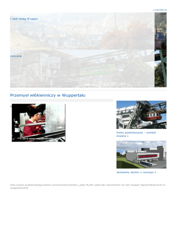 standox.pl nchester nad rzeką W upper ej podwieszana Przemysł włókienniczy w Wuppertalu Video-Source: w w w .w uppertalvideo.de Kolej podwieszana - symbol miasta Jesteśmy dumni z rozwoju http://www.axaltacoatingsystems.com/content/standox_pl/pl_PL/60-years/als-manchester-an-der-wupper-lag/textilindustrie-inwuppertal.html