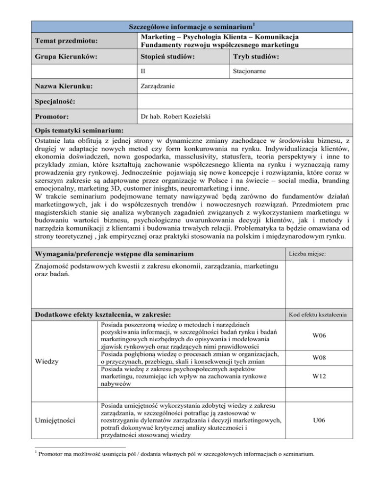 Szczegółowe informacje o seminarium Temat przedmiotu: Marketing