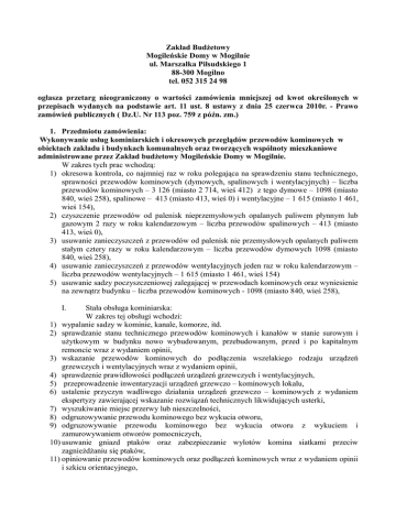 Zakład Budżetowy Mogileńskie Domy w Mogilnie ul. Marszałka Piłsudskiego 1 88-300 Mogilno tel. 052 315 24 98 ogłasza przetarg nieograniczony o wartości zamówienia mniejszej od kwot określonych w przepisach wydanych na podstawie art. 11 ust. 8 ustawy z dnia 25 czerwca 2010r. - Prawo zamówień publicznych ( Dz.U. Nr 113 poz. 759 z późn. zm.) 1. Przedmiotu zamówienia: Wykonywanie usług kominiarskich i okresowych przeglądów przewodów kominowych w obiektach zakładu i budynkach komunalnych oraz tworzących wspólnoty mieszkaniowe administrowane przez Zakład budżetowy Mogileńskie Domy w Mogilnie. W zakres tych prac wchodzą: 1) okresowa kontrola, co najmniej raz w roku polegająca na sprawdzeniu stanu technicznego, sprawności przewodów kominowych (dymowych, spalinowych i wentylacyjnych) – liczba przewodów kominowych – 3 126 (miasto 2 714, wieś 412) z tego dymowe – 1098 (miasto 840, wieś 258), spalinowe – 413 (miasto 413, wieś 0) i wentylacyjne – 1 615 (miasto 1 461, wieś 154), 2) czyszczenie przewodów od palenisk nieprzemysłowych opalanych paliwem płynnym lub gazowym 2 razy w roku kalendarzowym – liczba przewodów spalinowych – 413 (miasto 413, wieś 0), 3) usuwanie zanieczyszczeń z przewodów od palenisk nie przemysłowych opalanych paliwem stałym cztery razy w roku kalendarzowym – liczba przewodów dymowych 1098 (miasto 840, wieś 258), 4) usuwanie zanieczyszczeń z przewodów wentylacyjnych jeden raz w roku kalendarzowym – liczba przewodów wentylacyjnych – 1 615 (miasto 1 461, wieś 154) 5) usuwanie sadzy poczyszczeniowej zalegającej w przewodach kominowych oraz wyniesienie na zewnątrz budynku – liczba przewodów kominowych - 1098 (miasto 840, wieś 258), I. Stała obsługa kominiarska: W zakres tej obsługi wchodzi: 1) wypalanie sadzy w kominie, kanale, komorze, itd. 2) sprawdzanie stanu technicznego przewodów kominowych i kanałów w stanie surowym i użytkowym w budynku nowo wybudowanym, przebudowanym, przed i po kapitalnym remoncie wraz z wydaniem opinii, 3) wskazanie przewodów kominowych do podłączenia wszelakiego rodzaju urządzeń grzewczych i wentylacyjnych wraz z wydaniem opinii, 4) sprawdzenie prawidłowości podłączeń urządzeń grzewczych i wentylacyjnych, 5) przeprowadzenie inwentaryzacji urządzeń grzewczo – kominowych lokalu, 6) ustalenie przyczyn wadliwego działania urządzeń grzewczo – kominowych z wydaniem ekspertyzy zawierającej wskazanie rozwiązań technicznych likwidujących usterki, 7) wyszukiwanie miejsc przerwy lub nieszczelności, 8) odgruzowywanie przewodu kominowego bez wykucia otworu, 9) odgruzowywanie przewodu kominowego bez wykucia otworu z wykuciem i zamurowywaniem otworów pomocniczych, 10) usuwanie gniazd ptaków oraz zabezpieczanie wylotów komina siatkami przeciw zagnieżdżaniu się ptaków, 11) opiniowanie przewodów kominowych oraz podłączeń kominowych wraz z wydaniem opinii i szkicu orientacyjnego, 12) uszczelnianie przewodów wentylacyjnych i kominowych, Kod CPV: 45.21.00.00-2, 45.26.25.00-6, 45.45.30.00-7, 50.71.10.00-2, 71.35.61.00-9, 90.91.50.004, 90.51.34.00-0, 90.51.36.00-2. 1. Zamawiający nie przewiduje składania ofert częściowych, wariantowych, uzupełniających i nie zamierza ustanowić dynamicznego systemu zakupów,. 2. Przedmiotem niniejszego postępowania nie jest zawarcie umowy ramowej 2. SIWZ zamieszczona jest: na stronie www.md.mogilno.bip.net.pl lub odebrać można w siedzibie Mogileńskich Domów w Mogilnie, sekretariat. 3. Termin wykonania zamówienia Proponuje się od dnia pierwszy dzień po podpisaniu umowy do 31.12.2012r. 4. Warunki udziału w postępowaniu oraz opis sposobu dokonywania oceny spełniania tych warunków. 1) posiadania uprawnień do wykonywania określonej działalności lub czynności, jeżeli przepisy prawa nakładają obowiązek ich posiadania; W celu potwierdzenia spełniania niniejszego warunku Wykonawca powinien złożyć oświadczenie o spełnianiu tego warunku – załącznik nr 3 do SIWZ. 2) posiadania wiedzy i doświadczenia: a) W celu potwierdzenia spełniania niniejszego warunku Wykonawca powinien złożyć oświadczenie o spełnianiu tego warunku – załącznik nr 3 do SIWZ oraz, b) Wykonawca musi wykazać, że w okresie ostatnich 3 lat przed dniem wszczęcia niniejszego postępowania, a jeżeli okres prowadzenia działalności jest krótszy to w tym okresie, co najmniej 1 zamówienie o tożsamym charakterze do przedmiotu zamówienia (zrealizowane w ramach jednej umowy) tj. obejmujące wykonywanie usług w zakresie czyszczenia przewodów kominowych oraz w zakresie okresowej kontroli przewodów kominowych wg wymagań art. 62 Ustawy z dnia 7 lipca 1994r. Prawo Budowlane, którego wartość wyniosła minimum 50.000 zł brutto. Weryfikację spełnienia warunku posiadania wiedzy i doświadczenia zamawiający dokona na podstawie przedłożonego przez wykonawcę wykazu wykonanych, a w przypadku świadczeń okresowych lub ciągłych również wykonywanych usług oraz dokumentów od zamawiających potwierdzającymi należyte wykonanie wykazanych usług. W przypadku wspólnego ubiegania się o udzielenie niniejszego zamówienia przez dwóch lub więcej Wykonawców powyższy warunek musi spełnić co najmniej jeden z tych Wykonawców. 3) dysponowania odpowiednim potencjałem technicznym oraz osobami zdolnymi do wykonania zamówienia: W celu potwierdzenia spełniania niniejszego warunku Wykonawca powinien złożyć oświadczenie o spełnianiu tego warunku – załącznik nr 3 do SIWZ. 4) sytuacji ekonomicznej i finansowej: a) W celu potwierdzenia spełniania niniejszego warunku Wykonawca powinien złożyć oświadczenie o spełnianiu tego warunku – załącznik nr 3 do SIWZ. b) Ponadto, zamawiający wymaga opłaconej polisy, a w przypadku jej braku innego dokumentu potwierdzającego, że wykonawca jest ubezpieczony od odpowiedzialności cywilnej w zakresie prowadzonej działalności związanej z przedmiotem zamówienia. 4.2. Warunkiem u