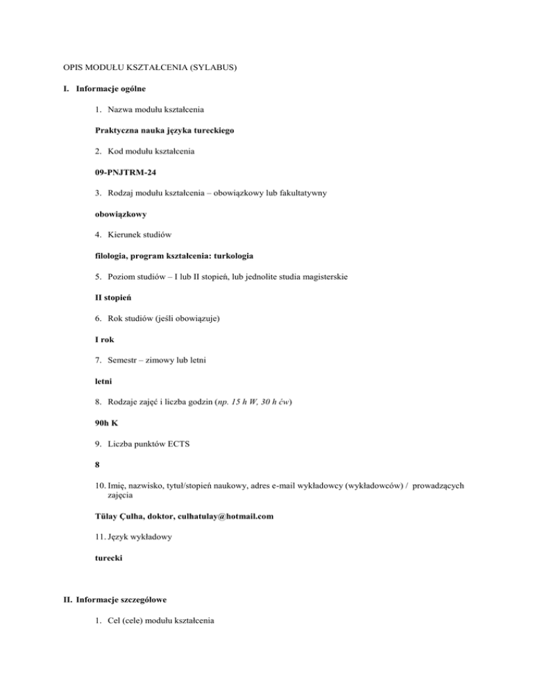 OPIS MODUŁU KSZTAŁCENIA (SYLABUS) I. Informacje ogólne 1