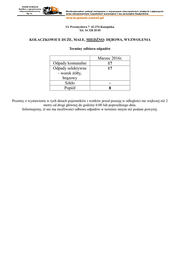 Ul. Przemysłowa 7 42-274 Konopiska Tel. 34 328 20 05 KOŁACZKOWICE DUŻE, MAŁE, MIEDŹNO: DĘBOWA, WYZWOLENIA Terminy odbioru odpadów Odpady komunalne Odpady selektywne - worek żółty, brązowy Szkło Popiół Marzec 2016r. 17 17 8 Prosimy o wystawienie w tych dniach pojemników i worków przed posesję w odległości nie większej niż 2 metry od drogi głównej do godziny 6:00 lub poprzedniego dnia. Informujemy, iż nie ma możliwości odbioru odpadów w terminie innym niż podane powyżej.