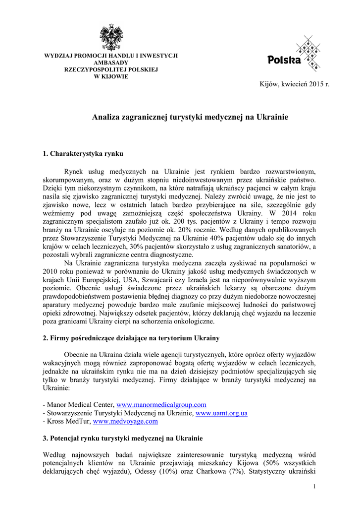 WYDZIAЈ PROMOCJI HANDLU I INWESTYCJI AMBASADY RZECZYPOSPOLITEJ POLSKIEJ W KIJOWIE Kijów, kwiecień 2015 r. Analiza zagranicznej turystyki medycznej na Ukrainie 1. Charakterystyka rynku Rynek usług medycznych na Ukrainie jest rynkiem bardzo rozwarstwionym, skorumpowanym, oraz w dużym stopniu niedoinwestowanym przez ukraińskie państwo. Dzięki tym niekorzystnym czynnikom, na które natrafiają ukraińscy pacjenci w całym kraju nasila się zjawisko zagranicznej turystyki medycznej. Należy zwrócić uwagę, że nie jest to zjawisko nowe, lecz w ostatnich latach bardzo przybierające na sile, szczególnie gdy weźmiemy pod uwagę zamożniejszą część społeczeństwa Ukrainy. W 2014 roku zagranicznym specjalistom zaufało już ok. 200 tys. pacjentów z Ukrainy i tempo rozwoju branży na Ukrainie oscyluje na poziomie ok. 20% rocznie. Według danych opublikowanych przez Stowarzyszenie Turystyki Medycznej na Ukrainie 40% pacjentów udało się do innych krajów w celach leczniczych, 30% pacjentów skorzystało z usług zagranicznych sanatoriów, a pozostali wybrali zagraniczne centra diagnostyczne. Na Ukrainie zagraniczna turystyka medyczna zaczęła zyskiwać na popularności w 2010 roku ponieważ w porównaniu do Ukrainy jakość usług medycznych świadczonych w krajach Unii Europejskiej, USA, Szwajcarii czy Izraela jest na nieporównywalnie wyższym poziomie. Obecnie usługi świadczone przez ukraińskich lekarzy są obarczone dużym prawdopodobieństwem postawienia błędnej diagnozy co przy dużym niedoborze nowoczesnej aparatury medycznej powoduje bardzo małe zaufanie miejscowej ludności do państwowej opieki zdrowotnej. Największy odsetek pacjentów, którzy deklarują chęć wyjazdu na leczenie poza granicami Ukrainy cierpi na schorzenia onkologiczne. 2. Firmy pośredniczące działające na terytorium Ukrainy Obecnie na Ukraina działa wiele agencji turystycznych, które oprócz oferty wyjazdów wakacyjnych mogą również zaproponować bogatą ofertę wyjazdów w celach leczniczych, jednakże na ukraińskim rynku nie ma na dzień dzisiejszy podmiotów specjalizujących się tylko w branży turystyki medycznej. Firmy działające w branży turystyki medycznej na Ukrainie: - Manor Medical Center, www.manormedicalgroup.com - Stowarzyszenie Turystyki Medycznej na Ukrainie, www.uamt.org.ua - Kross MedTur, www.medvoyage.com 3. Potencjał rynku turystyki medycznej na Ukrainie Według najnowszych badań największe zainteresowanie turystyką medyczną wśród potencjalnych klientów na Ukrainie przejawiają mieszkańcy Kijowa (50% wszystkich deklarujących chęć wyjazdu), Odessy (10%) oraz Charkowa (7%). Statystyczny ukraiński 1 pacjent przeciętnie wydaje od 5 do nawet 10 razy więcej pieniędzy, aniżeli normalny turysta. W obecnej sytuacji gospodarczej obywatele Ukrainy bardzo liczą się z kosztami związanymi z leczeniem poza granicami kraju dlatego oferty szpitali oraz klinik specjalistycznych powinny być dostosowane pod konkretnego klienta, dla którego będzie ważna nie tylko jakość świadczonych usług ale i ich cena. Ukraińskie firmy dzielą turystykę medyczną na 3 podstawowe kategorie: - diagnostyka, - lecznictwo uzdrowiskowe, - leczenie inwazyjne. 4. Kierunki turystyki medycznej dla obywateli Ukrainy Dla ukraińskich pacjentów najbardziej interesującymi kierunkami turystyki medycznej są Niemcy oraz Izrael, w których obowiązują nie tylko bardzo wysokie standardy lecznictwa ale i specjalnie pod kątem pacjentów ze Wschodniej Europy zatrudniany jest personel biegle władający językiem rosyjskim. W ostatnich latach zyskują na popularności także inne państwa takie jak: Turcja, Singapur czy Korea Południowa. Zgodnie z danymi Stowarzyszenia Turystyki Medycznej na Ukrainie należy odnotować, rosnącą liczbę zapytań dotyczących krajów Europy Cetralnej i Wschodniej takich jak: Polska, Czechy, Słowacja oraz Węgry, w których poziom usług medycznych jest zbliżony do Niemiec czy Francji ale jednocześnie ceny oferowane w tych krajach są o wiele bardziej przystępne. Aktualny kryzys gospodarczy na Ukrainie bardzo mocno odczuły renomowane kliniki w Szwajcarii oraz Niemczech. Szacują one, iż w 2014 roku nastąpił odpływ ok. 20% klientów z Ukrainy, którzy woleli wybrać tańsze leczenie np. w Polsce lub Turcji. Struktura kierunków turystyki medycznej na Ukrainie w 2014 roku 25,0% 21,0% 20,0% 20,0% 16,0% 15,0% 14,0% 10,0% 6,0% 5,0% 6,0% 5,0% 5,0% 4,0% 3,0% 0,0% 5. Podsumowanie Pomimo zawirowań jakie aktualnie przeżywa ukraińska gospodarka (co ma bezpośredni wpływ na cenę ukraińskiej waluty w stosunku do innych walut europejskich, a więc również na ceny usług medycznych poza granicami Ukrainy), rynek usług medycznych powinien w dalszym ciągu się rozwijać. Reasumując postęp medyczny jaki dokonuje się w państwach zachodnich będzie przyciągał do siebie pacjentów z różnych stron świata, a w tym 2 z Ukrainy gdzie zapotrzebowanie na wysoki poziom usług medycznych jest ogromne. Niestety z uwagi na stagnację jej gospodarki nie należy się niestety spodziewać szybkiego skoku jakościowego ukraińskiej służby ochrony zdrowia. Opracowano: Wydział Promocji Handlu i Inwestycji Ambasady RP w Kijowie 3