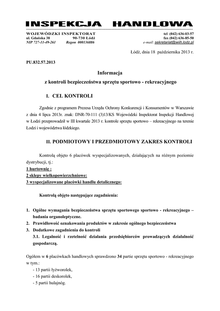 ----------------------------------------------------------------------------------------------------------------WOJEWÓDZKI INSPEKTORAT ul. Gdańska 38 90-730 Łódź NIP 727-11-49-261 Regon 000136886 tel (042) 636-03-57 fax (042) 636-85-50 e-mail: [email protected] Łódź, dnia 18 października 2013 r. PU.832.57.2013 Informacja z kontroli bezpieczeństwa sprzętu sportowo - rekreacyjnego I. CEL KONTROLI Zgodnie z programem Prezesa Urzędu Ochrony Konkurencji i Konsumentów w Warszawie z dnia 4 lipca 2013r. znak: DNR-70-111 (3)13/KS Wojewódzki Inspektorat Inspekcji Handlowej w Łodzi przeprowadził w III kwartale 2013 r. kontrole sprzętu sportowo – rekreacyjnego na terenie Łodzi i województwa łódzkiego. II. PODMIOTOWY I PRZEDMIOTOWY ZAKRES KONTROLI Kontrolą objęto 6 placówek wyspecjalizowanych, działających na różnym poziomie dystrybucji, tj.: 1 hurtownię : 2 sklepy wielkopowierzchniowe: 3 wyspecjalizowane placówki handlu detalicznego: Kontrolą objęto następujące zagadnienia: 1. Ogólne wymagania bezpieczeństwa sprzętu sportowego sportowo - rekreacyjnego – badania organoleptyczne. 2. Prawidłowość oznakowania produktów w zakresie ogólnego bezpieczeństwa 3. Dodatkowe zagadnienia do kontroli 3.1. Legalność i rzetelność działania przedsiębiorców prowadzących działalność gospodarczą. Ogółem w 6 placówkach handlowych sprawdzono 34 partie sprzętu sportowo - rekreacyjnego w tym.: - 13 partii łyżworolek, - 16 partii deskorolek, - 5 partii hulajnóg. Dla większości kontrolowanego sprzętu (30 partii: 12 partii łyżworolek, 14 partii deskorolek i 4 partie hulajnóg) przedsiębiorcy wprowadzający do obrotu zadeklarowali zgodność z obowiązującymi normami. Zakwestionowano ogółem 9 partii sprzętu sportowo – rekreacyjnego ( 3 partie łyżworolek i 6 partii deskorolek) z uwagi na nieprawidłowości w oznakowaniu. 1. Ogólne wymagania bezpieczeństwa sprzętu sportowego sportowo - rekreacyjnego – badania organoleptyczne. W 6 placówkach handlowych sprawdzono 34 partie sprzętu sportowo – rekreacyjnego. Przy ocenie bezpieczeństwa kontrolowanego sprzętu uwzględniano następujące wymagania: a) cechy produktu, w tym jego skład, opakowanie, instrukcje montażu i uruchomienia, a także instrukcję instalacji i konserwacji, b) oddziaływanie na inne produkty, jeżeli można było w uzasadniony sposób przewidzieć, że będzie używany łącznie z innymi produktami, c) wygląd produktu, jego oznakowanie, ostrzeżenia i instrukcje dotyczące jego użytkowania i postępowania z produktem zużytym oraz wszelkie inne udostępniane konsumentowi wskazówki lub informacje dotyczące produktu, d) kategorie konsumentów narażonych na niebezpieczeństwo w związku z używaniem produktu, w szczególności dzieci i osoby starsze. Kontrolę ww. sprzętu przeprowadzono w oparciu o wymagania określone w nw. normach: - PN-EN 13843:2011P (EN-13843:2009)„Sprzęt sportowy rolkowy. Łyżworolki. Wymagania bezpieczeństwa i metody badań”. - PN-EN 13613:2011P (EN-13613:2009)„Sprzęt sportowy rolkowy. Deskorolki. Wymagania bezpieczeństwa i metody badań”, - PN-EN 14619:2006 (EN-14619:2004)„Sprzęt sportowy rolkowy - Hulajnogi Wymagania bezpieczeństwa i metody badań”. W wyniku oceny dokonanej poprzez badania organoleptyczne nie stwierdzono wad konstrukcyjnych i jakościowych sprzętu sportowo – rekreacyjnego, mogących być podstawą stwierdzenia, że istnieje znaczne prawdopodobieństwo, że sprzęt może nie być bezpieczny. 2. Prawidłowość oznakowania produktów w zakresie ogólnego bezpieczeństwa Oceny prawidłowości oznakowania sprzętu sportowo – rekreacyjnego dokonano w oparciu o wymagania określone w art. 10 ustawy z dnia 12 grudnia 2003r. o ogólnym bezpieczeństwie produktów (Dz. U. Nr 229, poz. 2275 ze zm.) oraz posiłkując się wymaganiami zawartymi w normach, biorąc pod uwagę jego oznakowanie, ostrzeżenia -2- i instrukcje montażu i konserwacji dotyczące jego użytkowania oraz wszelkie inne udostępniane konsumentowi wskazówki lub informacje dotyczące produktu. W toku kontroli w 6 placówkach sprawdzono 34 partie sprzętu sportowo rekreacyjnego . W wyniku przeprowadzonej oceny stwierdzono nieprawidłowości w oznakowaniu 9 partii wyrobów ( 6 partii deskorolek i 3 partie łyżworolek). Stwierdzone nieprawidłowości polegały na: braku instrukcji użytkowania, obsługi i konserwacji oraz zasad bezpieczeństwa przy 1 partii deskorolek, braku w dołączonych instrukcjach informacji wymaganych deklarowaną na wyrobie normą PN-EN 13613:2011P (EN-13613:2009)„Sprzęt sportowy rolkowy. Deskorolki. Wymagania bezpieczeństwa i metody badań”: 1) informacji o treści „ Ostrzeżenie Jazda na deskorolce może być niebezpieczna (pkt 8.5 normy), 2) informacji dotyczącej limitu maksymalnej wagi użytkownika ( roz. 7 normy) w 5 partiach deskorolek , braku informacji wymaganych deklarowaną na wyrobie normą PN-EN 13843:2011P (EN13843:2009)„Sprzęt sportowy rolkowy. Łyżworolki. Wymagania bezpieczeństwa i metody badań”: 1) uwagi wskazującej, czy nakrętki samozabezpieczajace i inne mocowania samo zabezpieczające mogą tracić swoją skuteczność (pkt 7.2.2 normy), 2) zaznaczenia odpowiedniej klasy wyrobu łącznie z wyjaśnieniem (pkt 7.2.5ww normy), 3) uwagi o usuwaniu jakichkolwiek ostrych krawędzi powstałych podczas użytkowania (pkt 7.2.4 normy), 4) uwagi dotyczące różnych właściwości rozmaitych konstrukcji łożysk i ich utrzymania w dobrym stanie (pkt 7.2.4 normy), 5) informacji o wymianie kółek, zderzaków i części urządzenia hamującego (pkt 7.2.4 normy), 6) informacji o smarowaniu łożysk (pkt 7.4.2.normy). przy 2 partiach łyżworolek , umieszczenie znaku CE na opakowaniu 1 partii łyżworolek. Ponadto w kwestionowanych 9 partiach sprzętu stwierdzono : użycie określenia „zabawka”, które było nieuzasadnione - w instrukcjach 2 partii deskorolek, umieszczenie znaku CE na wszywce 1 part