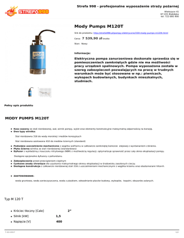 Strefa 998 - profesjonalne wyposażenie straży pożarnej Wietszyce 41 67-221 Białołęka tel: 723 895 900 Mody Pumps M120T link do produktu: http://strefa998.pl/pompy-elektryczne/330-mody-pumps-m120t.html Cena: 7 539,90 zł brutto Stan: Nowy Informacje: Elektryczna pompa zanurzeniowa doskonale sprawdza się w pomieszczeniach zamkniętych gdzie nie ma możliwości pracy urządzeń spalinowych. Pompa wyposażona została w szereg zabezpieczeń pozwalających na pracę w trudnych warunkach może być stosowane w np.: piwnicach, wykopach budowlanych, budynkach mieszkalnych, studniach. Pełny opis produktu MODY PUMPS M120T Kosz ssawny ze stali nierdzewnej, wał, wirnik pompy, wylot oraz elementy konstrukcyjne maksymalną odpornością na korozję. Dwa typy wirnika: Stal nierdzewna 316 do wody morskiej i mediów korozyjnych Stal nierdzewna azotowana 410 do mediów ściernych (standard) Podwójne uszczelnienie mechaniczne z węglika wolframu w całkowicie zamkniętej komorze olejowej z wyrównaniem ciśnienia. Płyta ścierna wirnika ze stali nierdzewnej (standardowo) Dyfuzor z wykładziną z kauczuku nitrylowego (NBR) z możliwością regulacji, optymalizuje sprawność przez cały okres eksploatacji pompy. Dostępne opcjonalne dyfuzory z poliuretanu. Zabezpieczenie przed przeciążeniem cieplnym Cynkowe anody chroniące dla uzyskania maksymalnego okresu eksploatacji w środowisku zasolonych cieczy. Dostępna konstrukcja z całkowicie nierdzewnej stali 316 z uszczelnieniami mechanicznymi z węglika krzemu oraz elastomerami Viton®. ZASTOSOWANIE: woda gruntowa, woda zanieczyszczona, woda z piaskiem, odwadnianie placów budowy, wykopów, kopalni, obszarów zalanych. Typ M 120 T Króciec tłoczny [Cale] 2” Silnik [kW] 1,5 Napięcie [V] 400 7-03-2017 1/2 Max. wys. podnoszenia [m] Max. wydatek [m3/godz] Wolny przelot [mm] Masa [kg] Wysokość [mm] Średnica [mm] 16 39,0 6,3 18 425 160 Przed zakupem prosimy o kontakt w celu ustalenia aktualnej ceny ponieważ jest ona zależna od kursu EURO. 7-03-2017 2/2