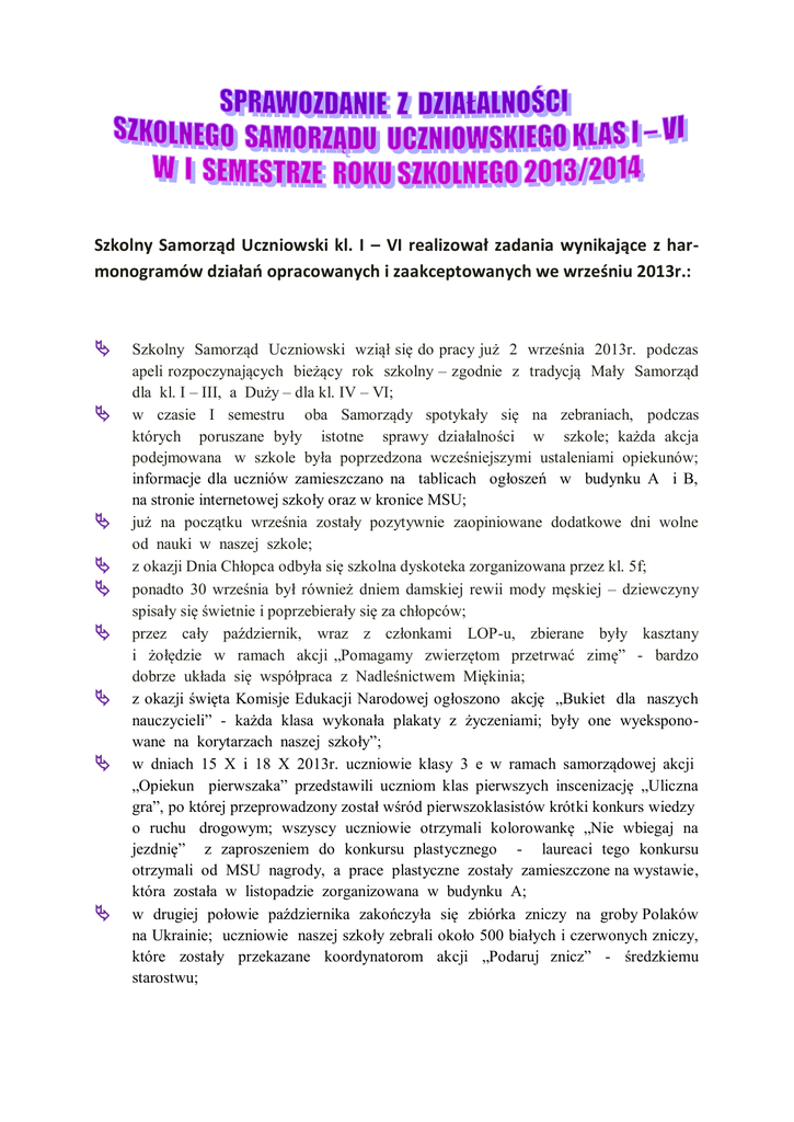 Szkolny Samorząd Uczniowski kl. I – VI realizował zadania wynikające z harmonogramów działań opracowanych i zaakceptowanych we wrześniu 2013r.: Szkolny Samorząd Uczniowski wziął się do pracy już 2 września 2013r. podczas apeli rozpoczynających bieżący rok szkolny – zgodnie z tradycją Mały Samorząd dla kl. I – III, a Duży – dla kl. IV – VI; w czasie I semestru oba Samorządy spotykały się na zebraniach, podczas których poruszane były istotne sprawy działalności w szkole; każda akcja podejmowana w szkole była poprzedzona wcześniejszymi ustaleniami opiekunów; informacje dla uczniów zamieszczano na tablicach ogłoszeń w budynku A i B, na stronie internetowej szkoły oraz w kronice MSU; już na początku września zostały pozytywnie zaopiniowane dodatkowe dni wolne od nauki w naszej szkole; z okazji Dnia Chłopca odbyła się szkolna dyskoteka zorganizowana przez kl. 5f; ponadto 30 września był również dniem damskiej rewii mody męskiej – dziewczyny spisały się świetnie i poprzebierały się za chłopców; przez cały październik, wraz z członkami LOP-u, zbierane były kasztany i żołędzie w ramach akcji „Pomagamy zwierzętom przetrwać zimę” - bardzo dobrze układa się współpraca z Nadleśnictwem Miękinia; z okazji święta Komisje Edukacji Narodowej ogłoszono akcję „Bukiet dla naszych nauczycieli” - każda klasa wykonała plakaty z życzeniami; były one wyeksponowane na korytarzach naszej szkoły”; w dniach 15 X i 18 X 2013r. uczniowie klasy 3 e w ramach samorządowej akcji „Opiekun pierwszaka” przedstawili uczniom klas pierwszych inscenizację „Uliczna gra”, po której przeprowadzony został wśród pierwszoklasistów krótki konkurs wiedzy o ruchu drogowym; wszyscy uczniowie otrzymali kolorowankę „Nie wbiegaj na jezdnię” z zaproszeniem do konkursu plastycznego - laureaci tego konkursu otrzymali od MSU nagrody, a prace plastyczne zostały zamieszczone na wystawie, która została w listopadzie zorganizowana w budynku A; w drugiej połowie października zakończyła się zbiórka zniczy na groby Polaków na Ukrainie; uczniowie naszej szkoły zebrali około 500 białych i czerwonych zniczy, które zostały przekazane koordynatorom akcji „Podaruj znicz” - średzkiemu starostwu; obchodzony był „Dzień pamięci o poległych w obronie Ojczyzny” - tradycyjnie więc na cmentarz wojskowy udali się przedstawiciele Małego i Dużego Samorządu oraz przewodniczący klas - uczcili minutą ciszy poległych żołnierzy, zapalili znicze na ich grobach oraz uczcili wszystkich zmarłych modląc się przy krzyżu stojącym na cmentarzu; pomocną dłoń podała p. Józefa Durda; próbowano również zbierać stare zużyte telefony, jednak ta akcja nie cieszyła się popularnością; 26 listopada zorganizowany został przez Mały Samorząd Uczniowski Turniej Piłki Nożnej klas trzecich - chłopcy dzielnie walczyli na boisku, natomiast dziewczynki, z wdziękiem prawdziwych cheerleaderek, dopingowały swoich kolegów; sędziował p. Dariusz Kotuła – PUCHAR PRZECHODNI trafił do klasy 3f; pomocą służyła p. Wanda Mikoszek; w odpowiedzi na propozycję LOP-u od polowy listopada do połowy grudnia zbierana była karma, koce i inne akcesoria dla podopiecznych jednego ze schronisk w ramach akcji „Mikołajki dla zwierząt” - zebrane dary zostaną zawiezione do Wrocławia w najbliższy piątek 31 stycznia; 25 listopada szkoła została opanowana przez misie, był to Światowy Dzień Pluszowego Misia; najbardziej misiowymi klasami zostały: 1a, 1c, 1f, 3d, 3f, 4d, 6c; wieczór andrzejkowych wróżb został przeprowadzony podczas dyskoteki zorganizowanej przez klasę 5c; 6 grudnia w rolę aniołków i diabełków wcielili się uczniowie klas trzecich, którzy corocznie w ten sposób wspomagają Samorząd Uczniowski podczas mikołajek; przez dwa tygodnie grudnia zbierana była żywność, środki czystości i zabawki w ramach akcji ogłoszonej przez TVP Wrocław „Podarujcie paczkę na Kresy”; udało się zebrać bardzo dużo potrzebnych produktów; w dniach 16 – 20 grudnia samorząd czynnie włączył się w organizację i przeprowadzenie VI Bożonarodzeniowego Konkursu Rodzinnego Pieczenia Pierniczków, pomagając organizatorce tej akcji – pani Beacie Jastrzębskiej; udział w konkursie wzięło 190 uczniów naszej szkoły, a dochód ze sprzedaży pierników zostanie niemal w całości przekazany na cele charytatywne; 18 grudnia przedstawiciele Samorządu Uczniowskiego udali się wraz z panią Dorotą Dyjak-Baraniecką z życzeniami do: Starosty Powiatu Średzkiego, Burmistrza Środy Śląskiej, Dyrektora ZOPO, Domu Kultury, Biblioteki Publicznej, Muzeum Regionalnego, Komendy Powiatowej Policji, Komendy Powiatowej Straży Pożarnej, Straży Miejskiej, Stacji Sanitarno – Epidemiologicznej oraz Powiatowego Ośrodka Rozwoju Edukacji; kartki z życzeniami zostały przygotowane przez wychowawców szkolnej świetlicy; przed świętami odbywały się również kiermasze świąteczne zorganizowane między innymi przez klasę 5b; rozpoczęta przed Bożym Narodzeniem ogólnopolska akcja „Góra Grosza” trwa do końca stycznia – zebrana kwota zostanie przekazana do fundacji; w styczniu Mały Samorząd zajął się organizacją Dni Patrona Szkoły – uroczystego apelu szkolnego oraz konkursów: dwóch plastycznych ( dla uczniów klas pierwszych i drugich) oraz literackiego (dla klas trzecich); w I semestrze wydano dwa numery gazetki „Kubusiowe Wiadomości”; ponadto od września zbierane są przez cały czas plastikowe nakrętki, baterie oraz makulatura; przez cały I sem. dla uczniów kl. IV – VI była prowadzona akcja „Szczęśliwy numerek” - koordynował ją Piotr Samiec-Talar z klasy VIc; w II sem. funkcję tę przejmie Ola Sikora z klasy VIb; Poczet Sztandarowy pod pieczą pani Natalii Aleksy reprezentował naszą szkołę w środowisku lokalnym; Chcielibyśmy bardzo podziękować paniom dyrektor 