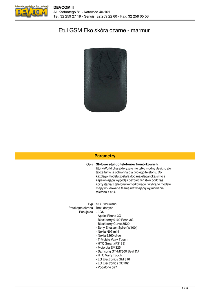 DEVCOM II Al. Korfantego 81 - Katowice 40-161 Tel. 32 259 27 19 - Serwis: 32 259 22 60 - Fax: 32 258 05 53 Etui GSM Eko skóra czarne - marmur Parametry Opis Stylowe etui do telefonów komórkowych. Etui 4World charakteryzuje nie tylko modny design, ale także funkcja ochronna dla twojego telefonu. Do każdego modelu została dodana elegancka smycz zapewniająca wygodę i bezpieczeństwo podczas korzystania z telefonu komórkowego. Wybrane modele mają wbudowaną taśmę ułatwiającą wyjmowanie telefonu z etui. Typ etui - wsuwane Przekątna ekranu Brak danych Pasuje do - 3GS - Apple iPhone 3G - Blackberry 9100 Pearl 3G - Blackberry Curve 8520 - Sony Ericsson Spiro (W100i) - Nokia N97 mini - Nokia 6260 slide - T-Mobile Vairy Touch - HTC Smart (F3188) - Motorola EM325 - Samsung GT-M7600 Beat DJ - HTC Vairy Touch - LG Electronics GM 310 - LG Electronics GB102 - Vodafone 527 1/3 DEVCOM II Al. Korfantego 81 - Katowice 40-161 Tel. 32 259 27 19 - Serwis: 32 259 22 60 - Fax: 32 258 05 53 - Samsung GT-i8910 Omnia HD - Samsung SGH-C270 - Samsung M1-GT-i6410 - Samsung GT-C5212 - Samsung GT-B2100 - Nokia 1661 - Motorola Milestone - Samsung GT-S5230 Star - Samsung GT-C3530 - Sony Ericsson Satio - Samsung GT-S5600 Preston - Samsung GT-S5530 - Samsung GT-B5702 - Nokia C3- 00 - Nokia E5-00 - Samsung GT-B3310, - Samsung GT-B7320 OmniaPro - Nokia 2330 classic - HTC Touch2 (T3333) - Sony Ericsson W995 - Nokia 6720 Classic, - Sony Ericsson Xperia X10 Mini Pro - Blackberry 8900, - Sony Ericsson Xperia X8, - Samsung GT-C3300K - LG Electronics T320 Cookie 3G - Nokia 6760 slide - LG Electronics GW300 - HTC Tatto (A3288) - LG Electronics BL20 New Chocolate - Blackberry 9105 Pearl 3G - Sony Ericsson W64s - Blackberry 7130 - Samsung GT-S5250 Wave 525 - Nokia 6600i slide - Vadafone 540 - LG Electronics KM570 - Samsung GT-C3110 - Nokia N8 - Samsung GT-B7350 Omnia 735 - Nokia X6 - Sony Ericsson Xperia X5 Pureness - Samsung GT-S7070 Diva - Motorola A3100 - HTC Nexus One - HTC Snap - Samsung GT-B3210 Corby TXT - Motorola MNilestone XT720 - HTC Touch Diamond 2 - Samsung GT-i5700 Galaxy Spica - HTC Magic - Nokia E55 - Samsung GT-S3110 - LG Electronics GT405 - Samsung GT-i9000 Galaxy S - Vadafone 845 - Nokia N97 - Nokia E52 - Apple iPhone 3GS - Samsung SGH-D980 - Emporia Elegance 2/3 DEVCOM II Al. Korfantego 81 - Katowice 40-161 Tel. 32 259 27 19 - Serwis: 32 259 22 60 - Fax: 32 258 05 53 - Samsung GT-E2210B - Sony Ericsson T707 - Samsung GT-E1100 - Samsung GT-C3050 - LG Electronics KS500 - Samsung GT-S7350 Ultra S - HTC Droid Eris - Samsung GT-S7230 Wave 723 - Blackberry 8310 Curve - Motorola W397 - Nokia N86 - Nokia 5228 - Blackberry 9100 Pearl 3G - HTC Desire - HTC Legend - Apple iPhone 4 - HTC Wildfire - Blackberry 9300 Curve 3G - Nokia 5730 XpressMusic - Nokia 5030 XpressRadio - Nokia X3-02 - Nokia 3710 fold - Sony Ericsson Naite - Nokia 1800 - HTC Hero, HTC Touch Viva - HTC 7 Mozart - Blackberry 8300 Curve - HTC HD mini - Nokia 5230 Kolor Czarny Materiał Skóra ekologiczna Wymiary 12 x 6 cm. 3/3 Powered by TCPDF (www.tcpdf.org)