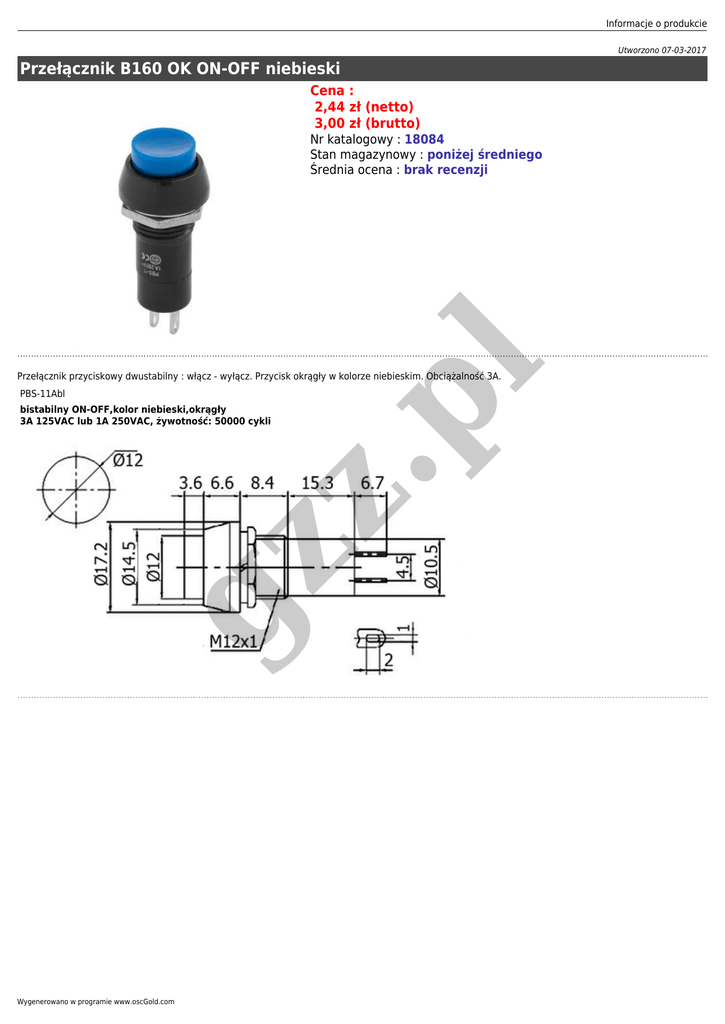 Informacje o produkcie Utworzono 07-03-2017 Przełącznik B160 OK ON-OFF niebieski Cena : 2,44 zł (netto) 3,00 zł (brutto) .p l Nr katalogowy : 18084 Stan magazynowy : poniżej średniego Średnia ocena : brak recenzji Przełącznik przyciskowy dwustabilny : włącz - wyłącz. Przycisk okrągły w kolorze niebieskim. Obciążalność 3A. PBS-11Abl gz z bistabilny ON-OFF,kolor niebieski,okrągły 3A 125VAC lub 1A 250VAC, żywotność: 50000 cykli Wygenerowano w programie www.oscGold.com
