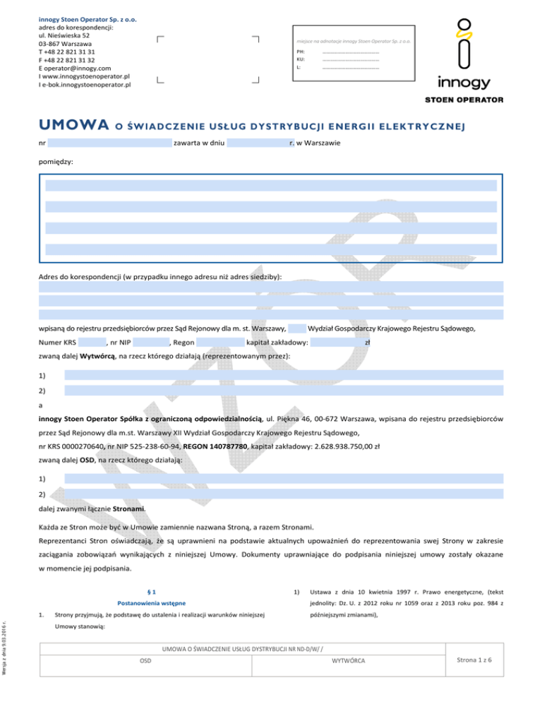 innogy Stoen Operator Sp. z o.o. adres do korespondencji: ul. Nieświeska 52 03-867 Warszawa T +48 22 821 31 31 F +48 22 821 31 32 E [email protected] I www.innogystoenoperator.pl I e-bok.innogystoenoperator.pl UMOWA miejsce na adnotacje innogy Stoen Operator Sp. z o.o. PH: ……………………………………… KU: ……………………………………… L: ……………………………………… O ŚWIA DC ZE NIE USŁUG D Y ST RY BUCJI E NE RG II EL EK T RY CZ N EJ nr zawarta w dniu r. w Warszawie pomiędzy: Adres do korespondencji (w przypadku innego adresu niż adres siedziby): wpisaną do rejestru przedsiębiorców przez Sąd Rejonowy dla m. st. Warszawy, Numer KRS , nr NIP , Regon Wydział Gospodarczy Krajowego Rejestru Sądowego, kapitał zakładowy: zł zwaną dalej Wytwórcą, na rzecz którego działają (reprezentowanym przez): 1) 2) a innogy Stoen Operator Spółka z ograniczoną odpowiedzialnością, ul. Piękna 46, 00-672 Warszawa, wpisana do rejestru przedsiębiorców przez Sąd Rejonowy dla m.st. Warszawy XII Wydział Gospodarczy Krajowego Rejestru Sądowego, nr KRS 0000270640, nr NIP 525-238-60-94, REGON 140787780, kapitał zakładowy: 2.628.938.750,00 zł zwaną dalej OSD, na rzecz którego działają: 1) 2) dalej zwanymi łącznie Stronami. Każda ze Stron może być w Umowie zamiennie nazwana Stroną, a razem Stronami. Reprezentanci Stron oświadczają, że są uprawnieni na podstawie aktualnych upoważnień do reprezentowania swej Strony w zakresie zaciągania zobowiązań wynikających z niniejszej Umowy. Dokumenty uprawniające do podpisania niniejszej umowy zostały okazane w momencie jej podpisania. 1) §1 Postanowienia wstępne Wersja z dnia 9.03.2016 r. 1. Strony przyjmują, że podstawę do ustalenia i realizacji warunków niniejszej Ustawa z dnia 10 kwietnia 1997 r. Prawo energetyczne, (tekst jednolity: Dz. U. z 2012 roku nr 1059 oraz z 2013 roku poz. 984 z późniejszymi zmianami), Umowy stanowią: UMOWA O ŚWIADCZENIE USŁUG DYSTRYBUCJI NR ND-D/W/ / OSD WYTWÓRCA Strona 1 z 6 2) 3) Instrukcja Ruchu i Eksploatacji Sieci Przesyłowej PSE S.A. w zakresie 5) sieci przez Wytwórcę wynosi ……………… MWh/rok przy mocy wynoszącej Ustawa z dnia 7 lipca 1994 r. - Prawo budowlane (tekst jednolity: …………kW, nie przekraczającej mocy przyłączeniowej. 8. wymaga formy pisemnej w postaci aneksu do Umowy. W przypadku Instrukcja Ruchu i Eksploatacji Sieci Dystrybucyjnej innogy Stoen zamiaru wprowadzania do sieci energii przy mocy wyższej niż moc Operator Sp. z o.o. (zwana dalej „IRiESD”), przyłączeniowa, należy oprócz aneksu do niniejszej Umowy zmienić Taryfa dla dystrybucji energii elektrycznej innogy Stoen Operator Sp. warunki przyłączenia obiektu i zawrzeć odpowiednią umowę o (zwanej dalej „Taryfą”). przyłączenie. 9. Wytwórca oświadcza, iż posiada umowę dystrybucji energii elektrycznej i OSD oświadcza, że: umowę sprzedaży energii elektrycznej albo umowę kompleksową na 1) podstawie, której będzie pobierał energię elektryczną z sieci dystrybucyjnej świadczy usługi dystrybucji energii elektrycznej na podstawie koncesji na dystrybucję energii elektrycznej nr DEE/41/13824/W/2/2007/BT, 2) OSD wydanej przez Prezesa Urzędu Regulacji Energetyki w dniu 29 maja 10. Strony zobowiązują się do stosowania w pełnym zakresie zapisów IRiESD. 2007 roku. 11. Aktualna treść IRiESD jest dostępna w Biurze Obsługi Klientów OSD oraz na posiada zawartą umowę o świadczenie usług przesyłowych z stronie internetowej: www.innogystoenoperator.pl. Operatorem Sieci Przesyłowej zwanym dalej (OSP), w ramach której 12. Wytwórca oświadcza, że zapoznał się z treścią IRiESD. OSD jest uczestnikiem Rynku Bilansującego i zostały przyznane mu 13. Użyte w Umowie skróty oraz pojęcia, należy interpretować zgodnie z postanowieniami dokumentów przywołanych w § 1 ust.1. niezbędne kody – które zawarte są w Załączniku 4 do Umowy. 3) 3. Zmiana mocy określonej w ust. 7 do wielkości mocy przyłączeniowej nie z rozporządzeniami wydanymi na mocy tej ustawy, z o. o. zatwierdzona decyzją Prezesa Urzędu Regulacji Energetyki 2. Planowana wielkość energii elektrycznej wytworzonej i wprowadzonej do wynikającym z zapisów IRiESP (zwana dalej „IRIESP”), Dz. U. z 2006 r., Nr 156, poz. 1118), z późniejszymi zmianami, wraz 4) 7. Decyzją Prezesa Urzędu Regulacji Energetyki nr DPE-47- §2 30(8)/13824/2007/BT z dnia 29 czerwca 2007 został wyznaczony do Przedmiot Umowy pełnienia funkcji OSD na obszarze objętym koncesją w zakresie Przedmiotem niniejszej Umowy jest świadczenie na rzecz Wytwórcy przez OSD dysponowanych urządzeń. usługi dystrybucji energii elektrycznej polegającej na: Wytwórca oświadcza, że: 1) 1) odbieraniu energii elektrycznej w miejscach dostarczania, posiada wymaganą prawem koncesję nr …………………………………………. 2) przesyłaniu energii elektrycznej za pomocą sieci dystrybucyjnej OSD, z dnia …………………………… na wytwarzanie energii elektrycznej na 3) utrzymywaniu ciągłości i niezawodności systemu dystrybucyjnego do okres odbierania energii elektrycznej. od …………………….. do ……………………… 2) §3 Wytwórca oświadcza, że posiada zawartą umowę o świadczenie usług bilansowania handlowego z Podmiotem Odpowiedzialnym za Zobowiązania Stron 1. bilansowanie handlowe (zwany dalej POB) ………………………….. od energii elektrycznej, o których mowa w § 2. Zobowiązanie to obejmuje w ……………………… na czas ……………………….. Kody identyfikacyjne szczególności: obowiązujące na Rynku Bilansującym wybranego przez Wytwórcę 1) 4. elektrycznej wynikającego z zapisanych w IRiESD, zgodnie z aktami Umowy. Wybrany POB posiada zawartą umowę o świadczenie usług prawnymi i dokumentami przywołanymi w § 1 Umowy; 2) będących własnością OSD, w części mającej wpływ na reali